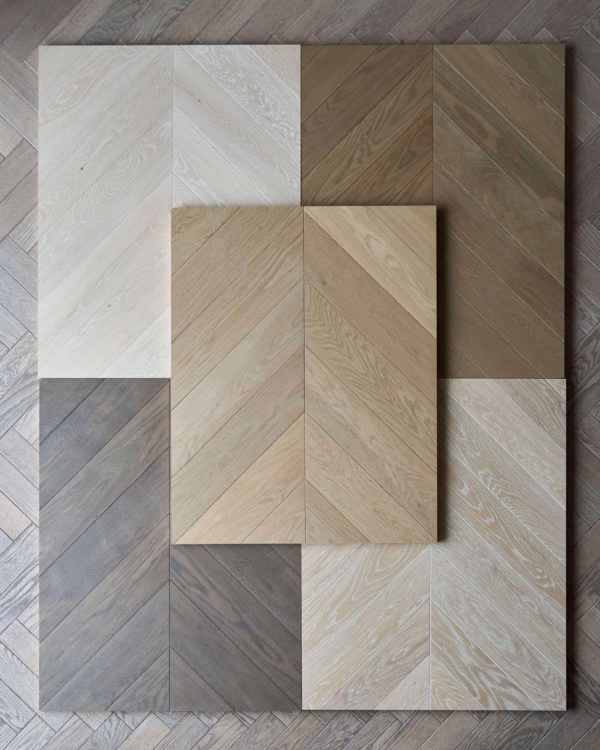 A: We offer chevron, herringbone, Versailles panels, wide-plank boards — and matching stair treads, trims and accessories, all in oak, so the finish is consistent across the project.