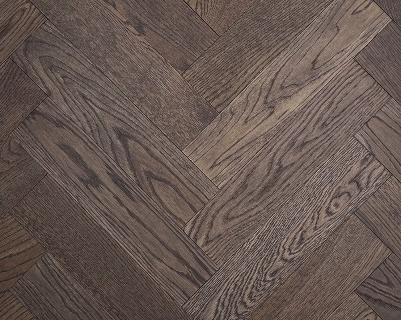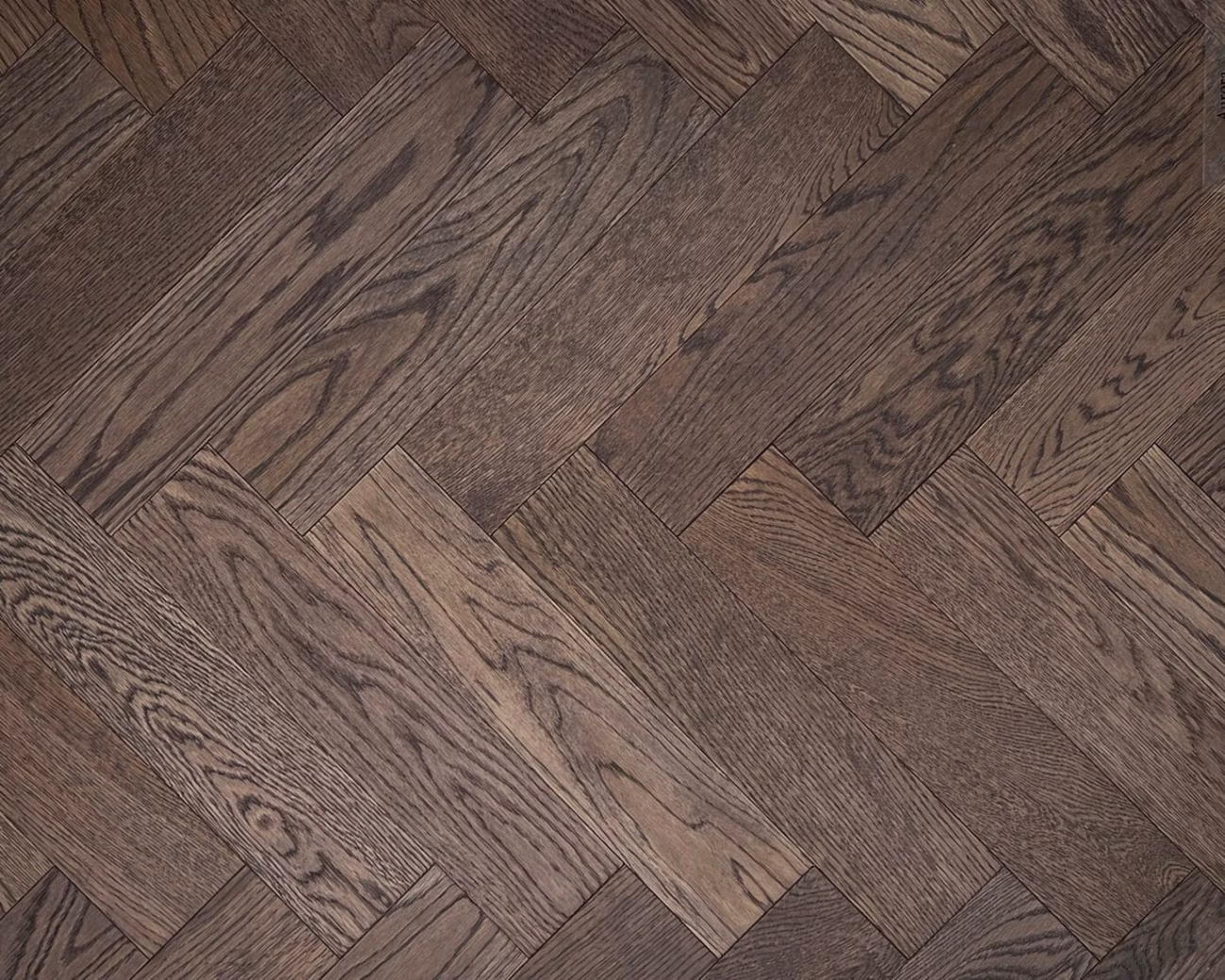 Engineered Oak herringbone parquet 90º is available in the following width: 90 mm, length: 400 mm, with an overall thickness of 15 mm ( 3 mm top oak layer ). Rustic Grade. Suitable for underfloor heating.