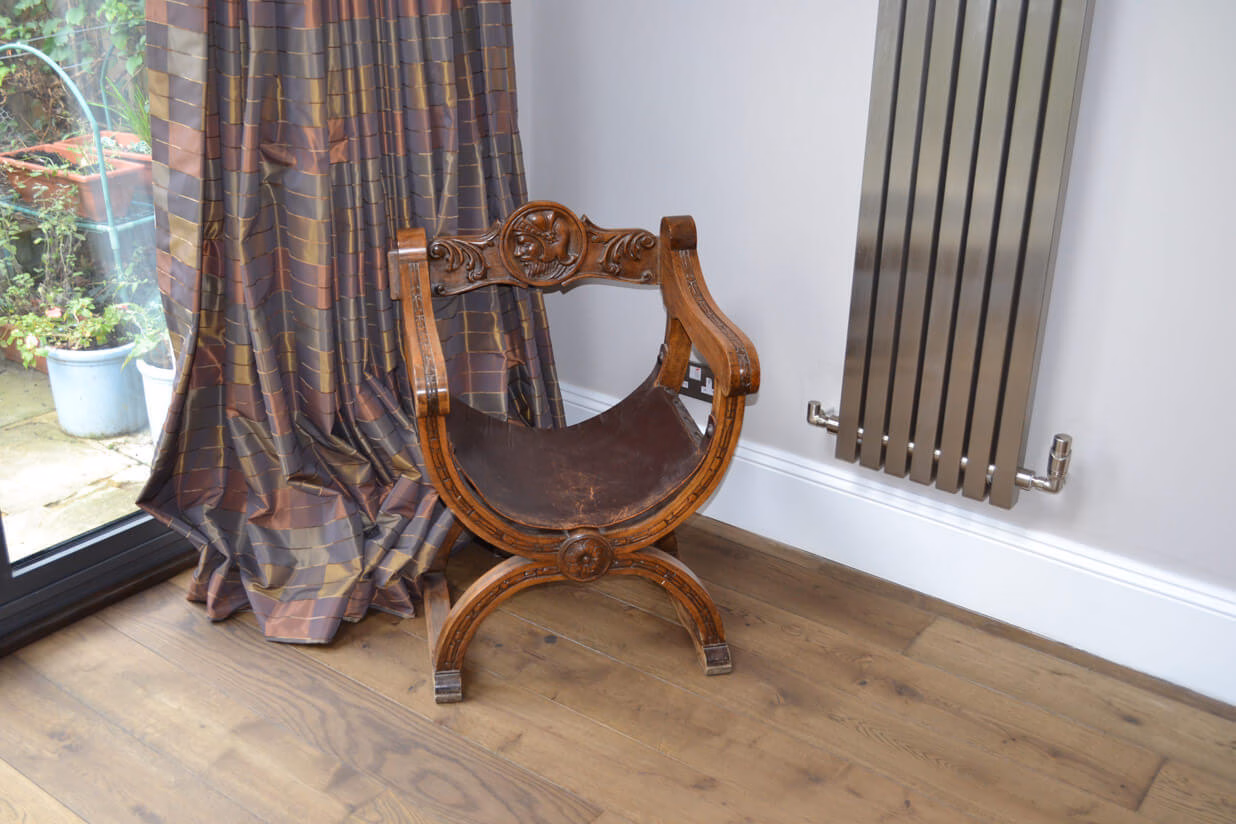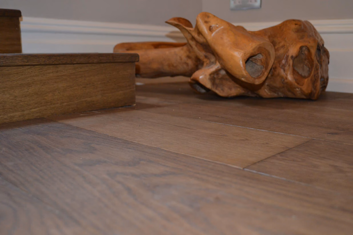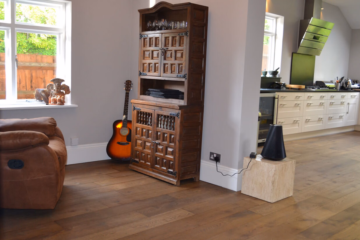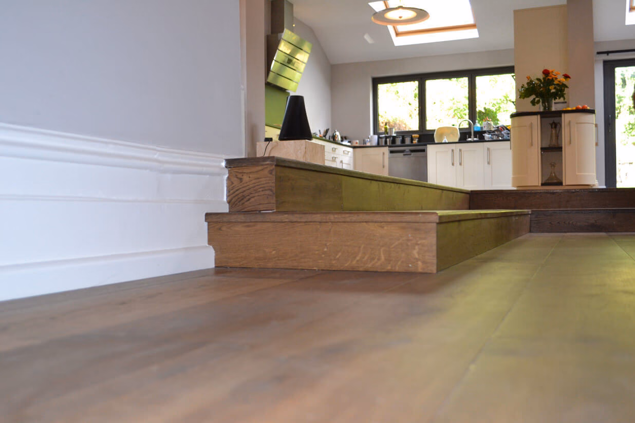 The wood floors in Ealing were supplied with 15 mm x 180mm wide engineered oak planks. The wood was graded Character grade, with standard lengths of 2.4m being the average. The 16mm thickness comprises a 4mm top layer of European oak and 15mm quality birch plywood.