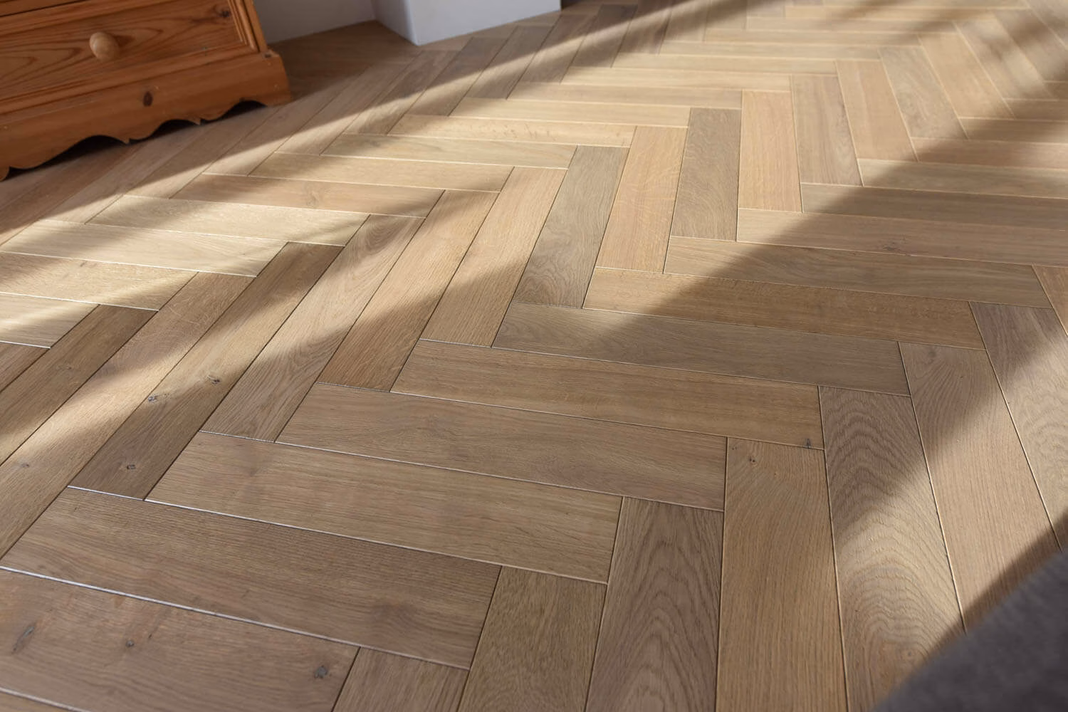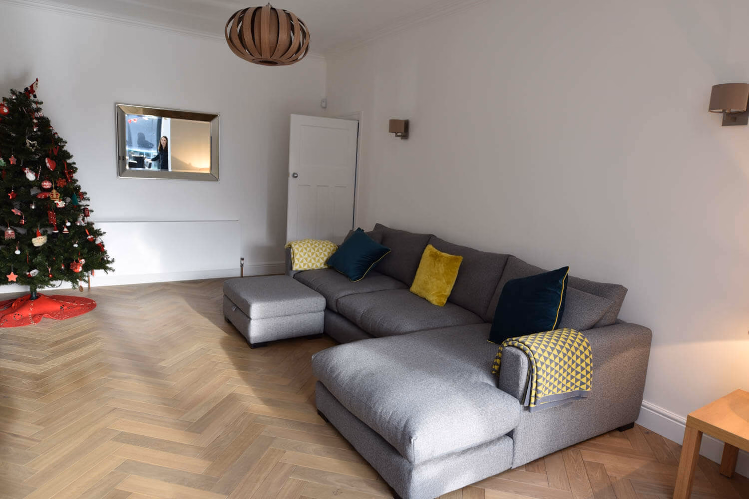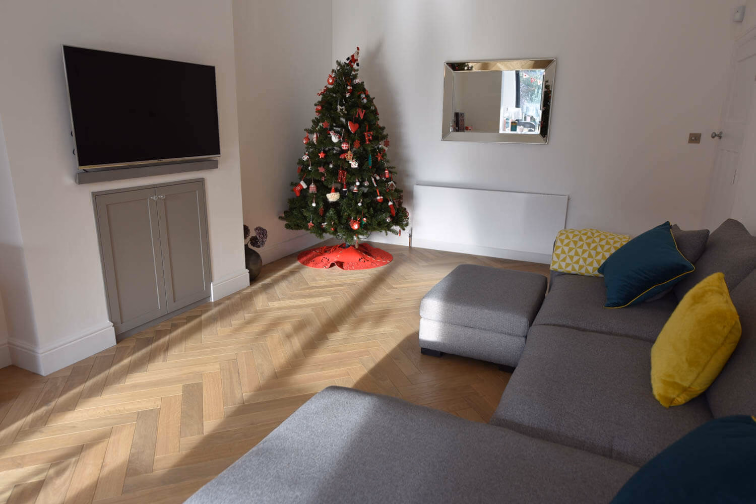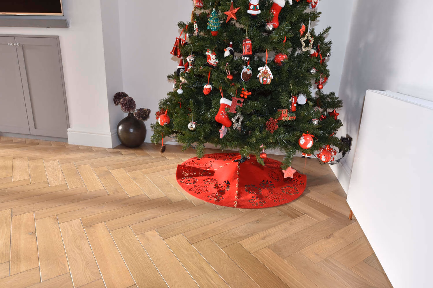The cosy living room is beautifully decorated with a Christmas tree that adds an welcoming holiday feel to the space. The lovely herringbone oak flooring brings a touch to the room, with its tones and intricate design that complements the festive decorations perfectly. Soft lighting and selected furnishings enhance the charm of the room. Create an ideal atmosphere, for hosting intimate holiday get togethers.