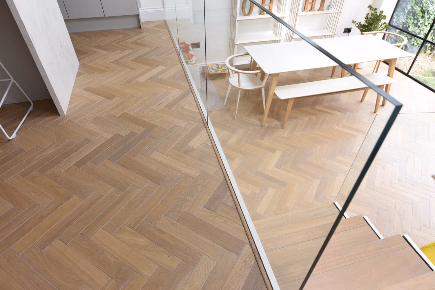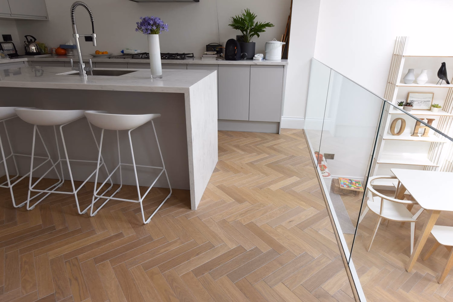 The idea for this project in Ealing, London W13 was to use a small parquet block in keeping with the age of the Victorian property and yet have a contemporary look that would work well with the white kitchen and furniture. The variation of light greys and subtle brown tones works really well against the glass balustrade and the bullnose seamless treads.
