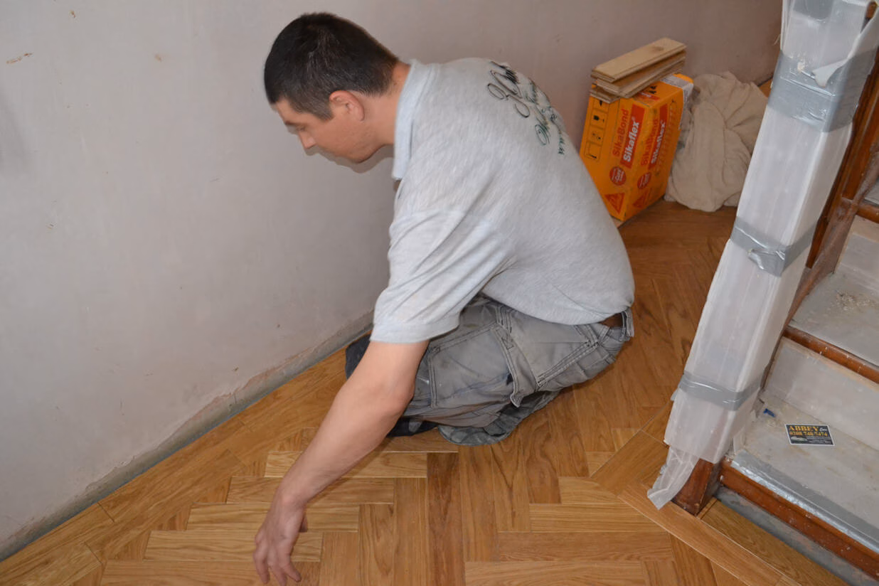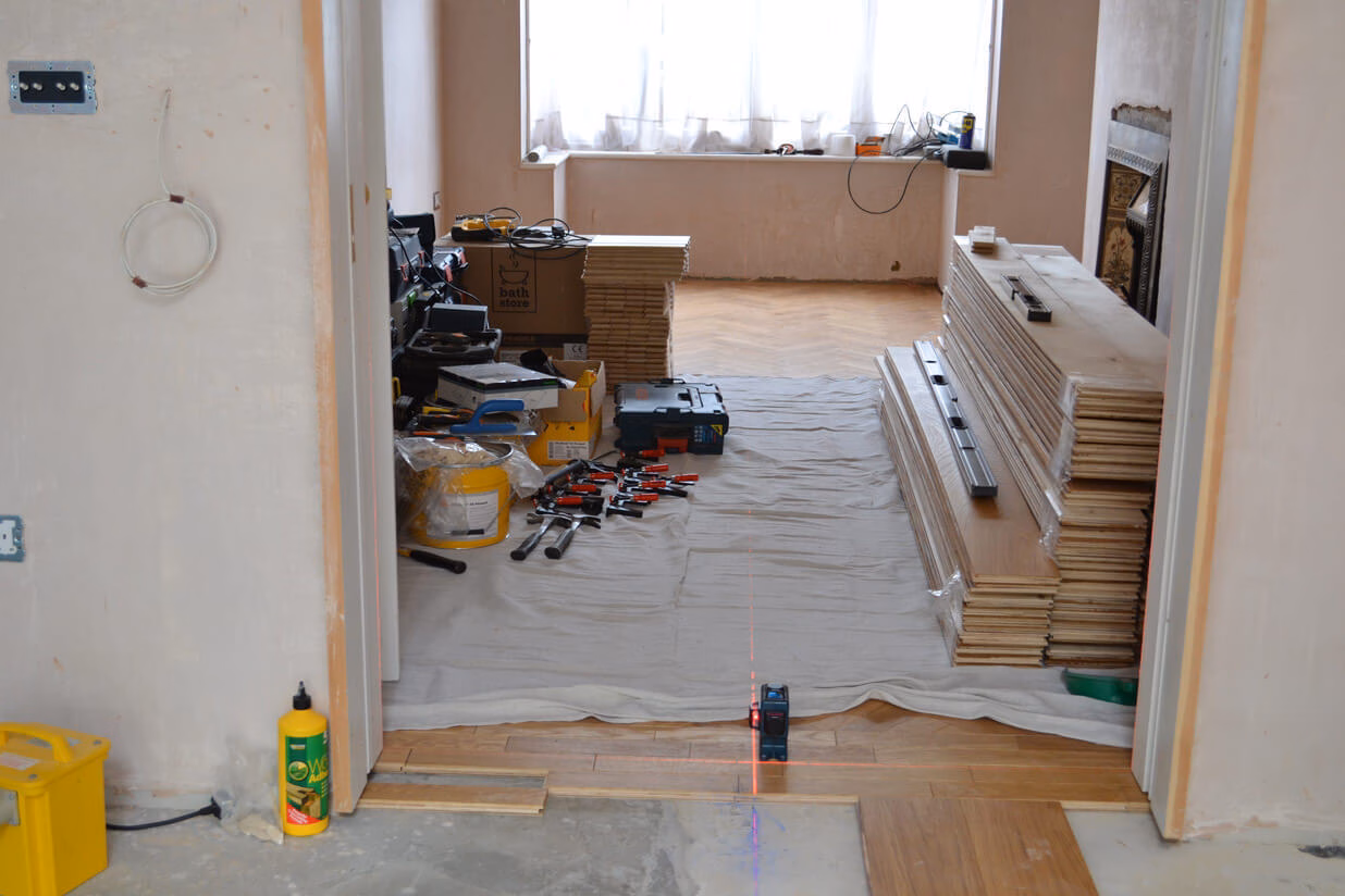 The parquet block size chosen was 21mm x 70mm x 350mm it was also decided to go for a double block border which finished of the herringbone pattern nicely.