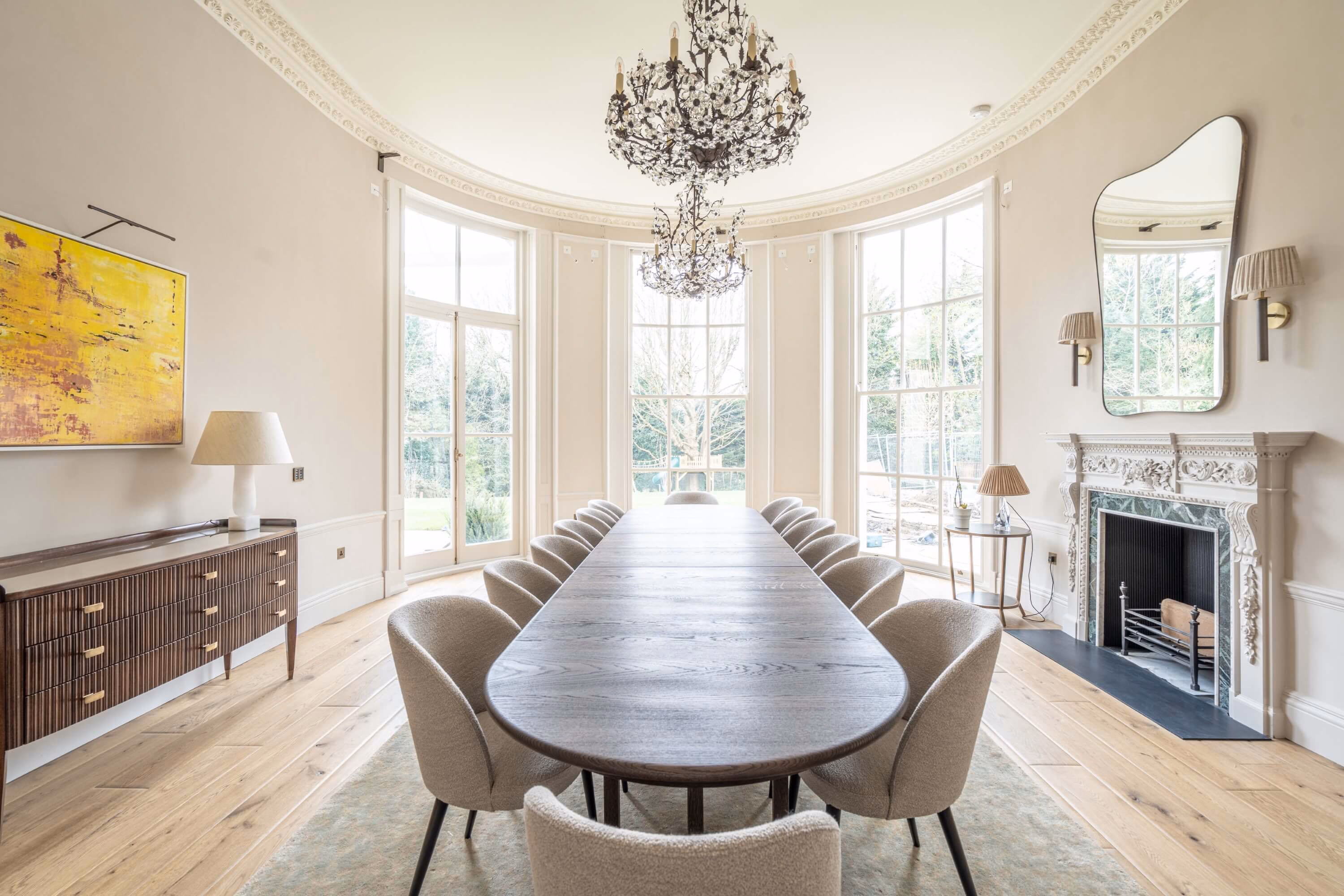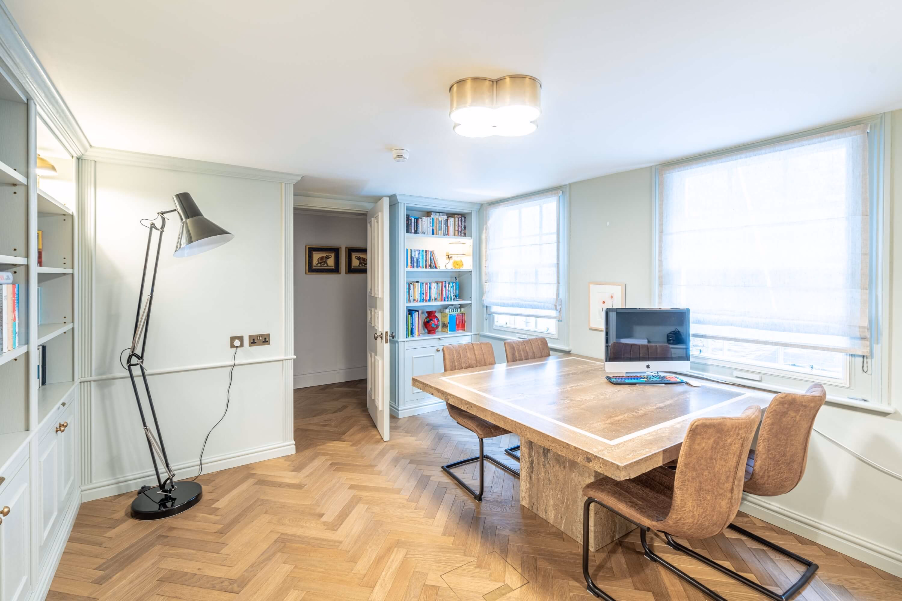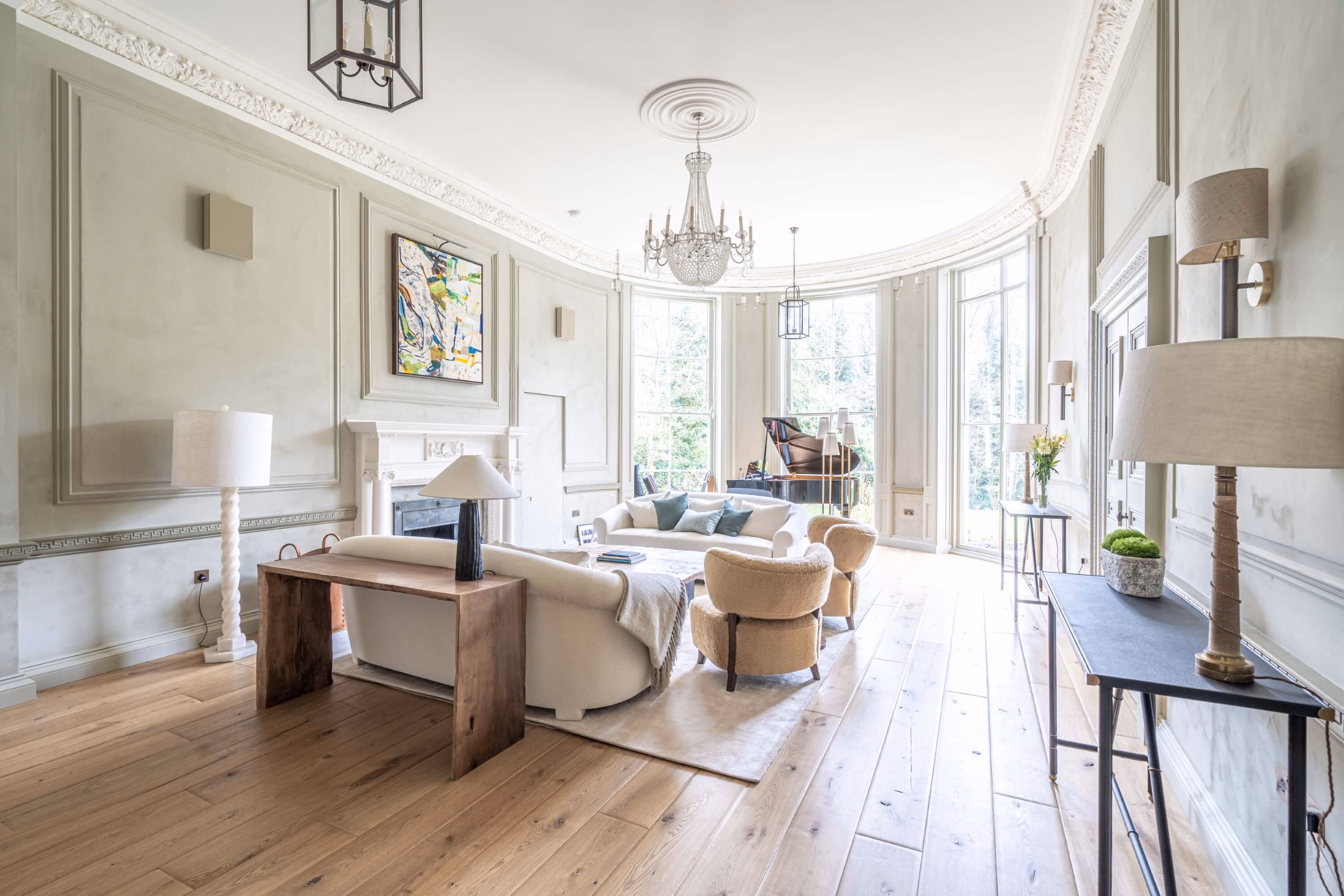- Flooring Types: Smokey George Distressed Herringbone Parquet, Aged Oak Wide Plank Flooring (220mm and 260mm widths)
