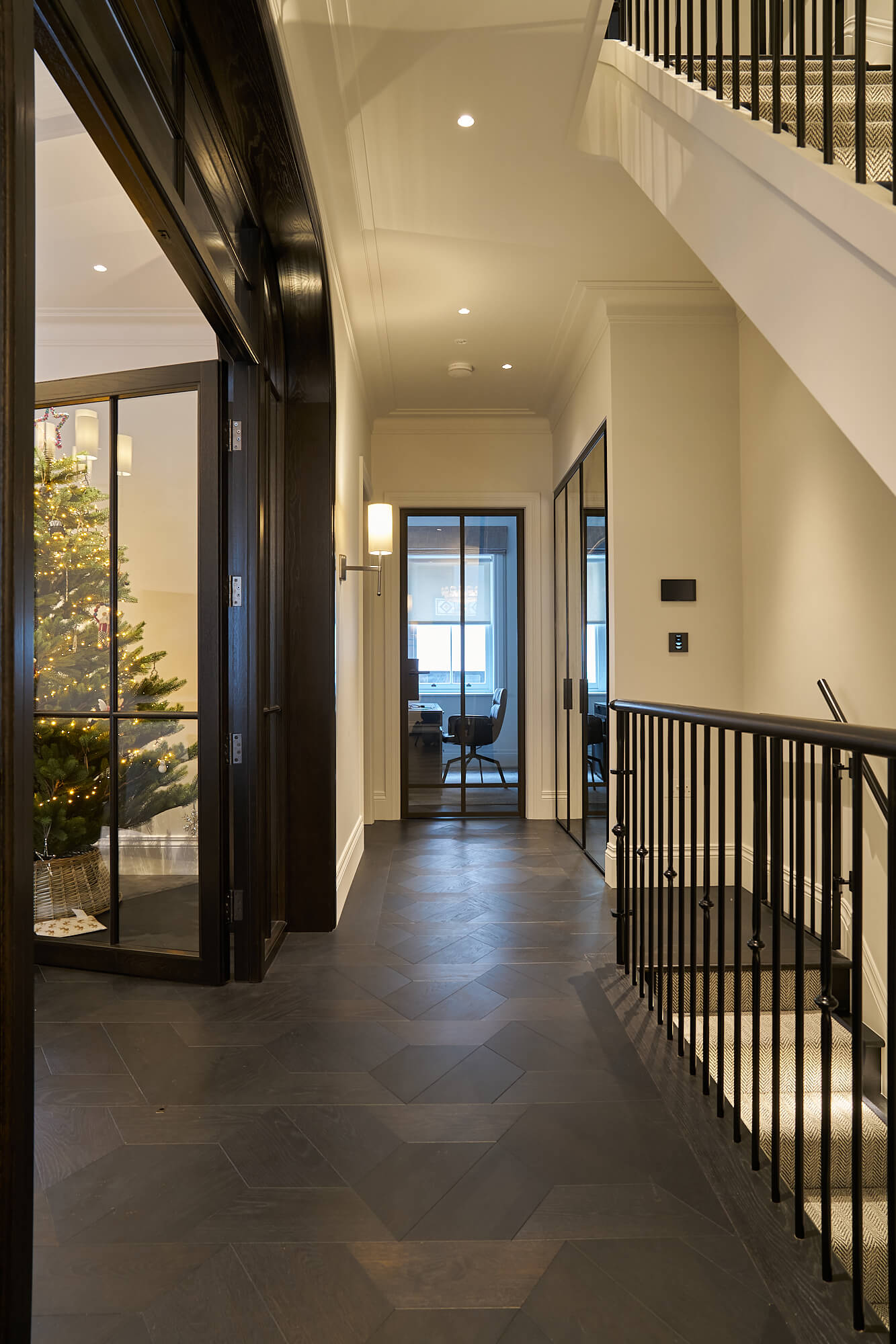 Prime grade pewter charred planks were installed through the first floor hallway and WC, creating a clean, durable base for everyday use. Triangle Weave Versailles panels formed the main feature across the ground floor living areas, including the living room, entrance and study, bringing structure and rhythm to the larger spaces. Pewter charred herringbone completed the upper level bedrooms and dressing rooms, adding a refined, crafted feel while maintaining continuity with the wider scheme.