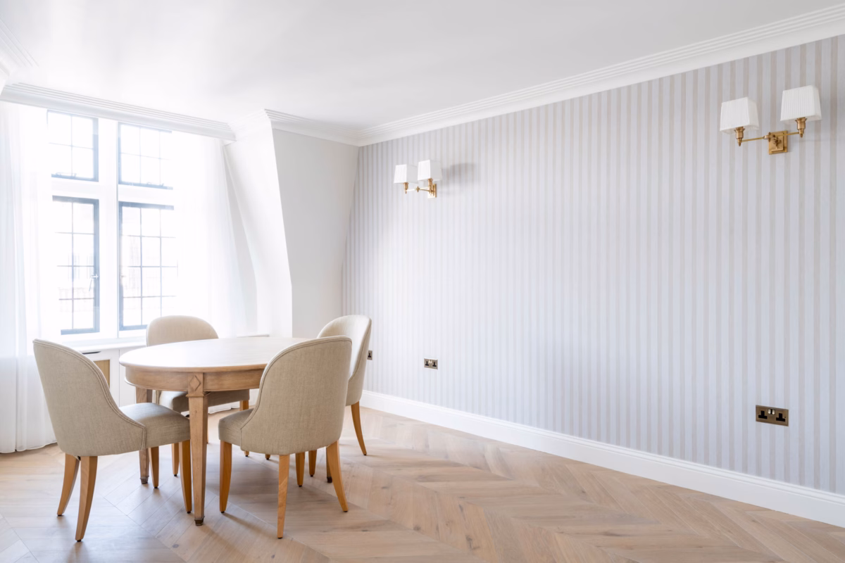 The Slate Gray Chevron Flooring Project showcases a stunning interior transformation that merges classic elegance with contemporary sophistication. Covering various key spaces of a home, including the living room, kitchen, dining area, hallway, and bedrooms, this bespoke flooring solution creates visual continuity while enhancing the design elements of each area. The light chevron wood flooring adds texture and warmth, perfectly complementing the home’s traditional striped wallpaper, gold accents, and timeless furnishings.