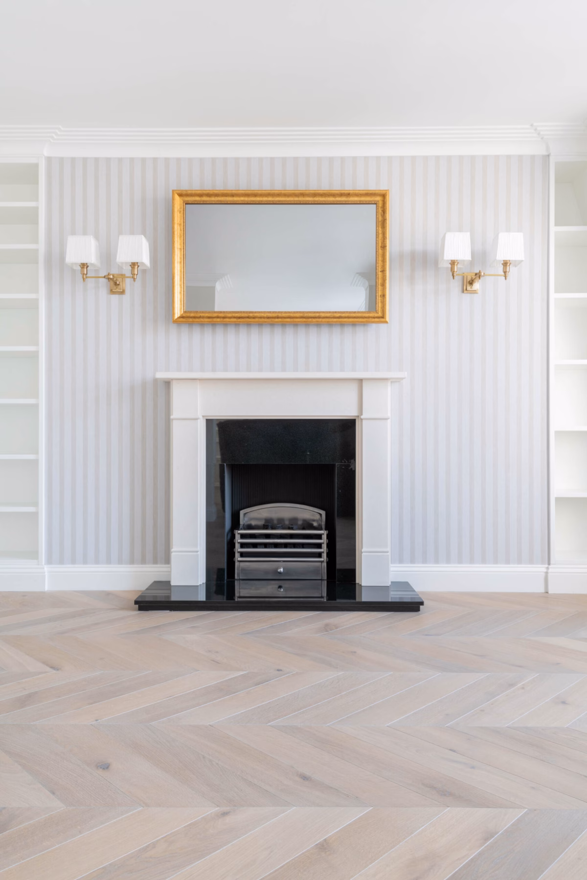 The Grey Smoked Chevron Flooring transformed the residence, unifying the spaces with its timeless design and light, natural tones. The chevron pattern added depth and sophistication to each room, from the living area with its elegant fireplace and symmetrical shelving to the minimalist kitchen and wardrobe spaces. The flooring’s character-grade wood brought warmth and texture, perfectly balancing the classic and contemporary elements of the interior. This project is a testament to how bespoke flooring can enhance a home’s aesthetic and functionality.