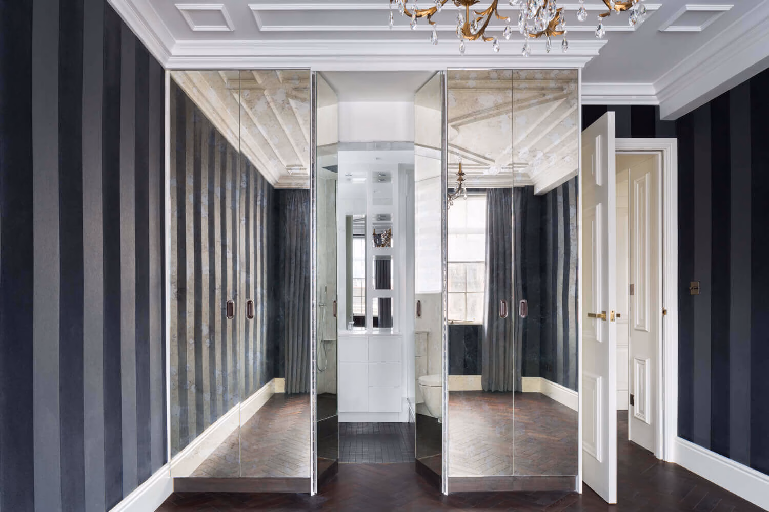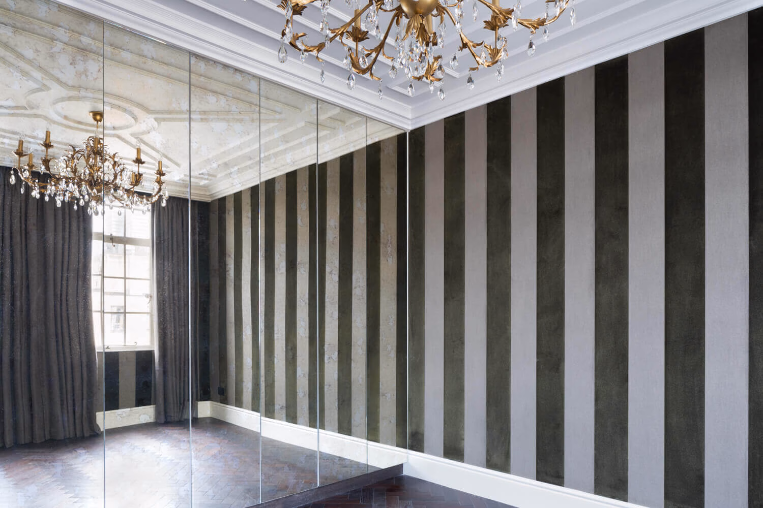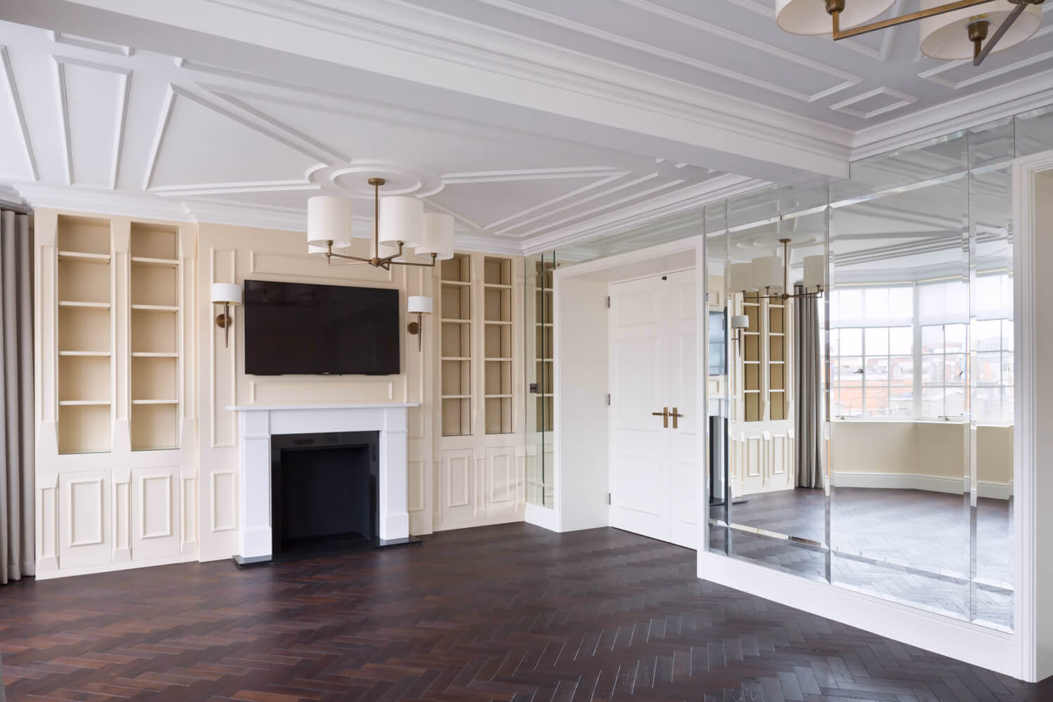 30 Day Fumed Engineered Oak in Herringbone Prime Grade – Dimensions: 21mm x 80mm x 300mm. This traditional “Victorian” sized Parquet is a perfect fit for this 19th century period property in Central London. The dark parquet is beautifully contrast with the white walls. This works elegantly with the stylish design and original features.