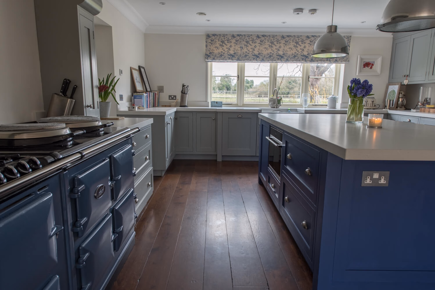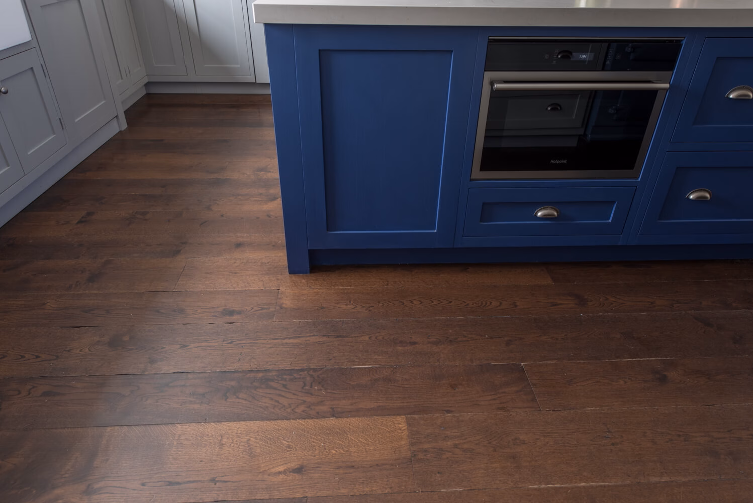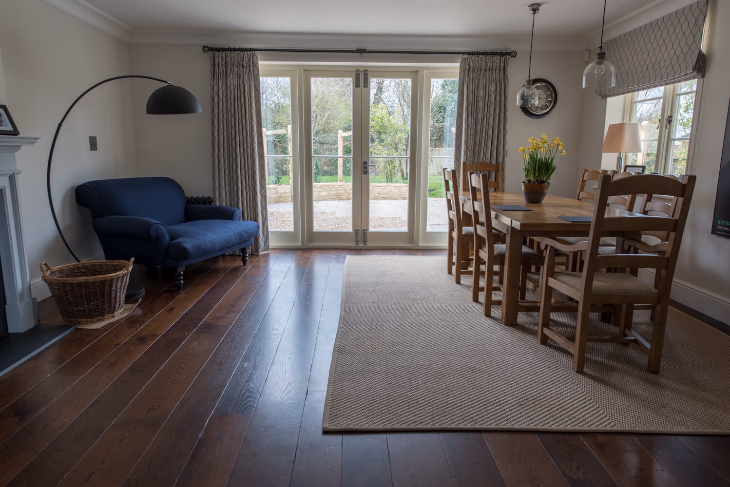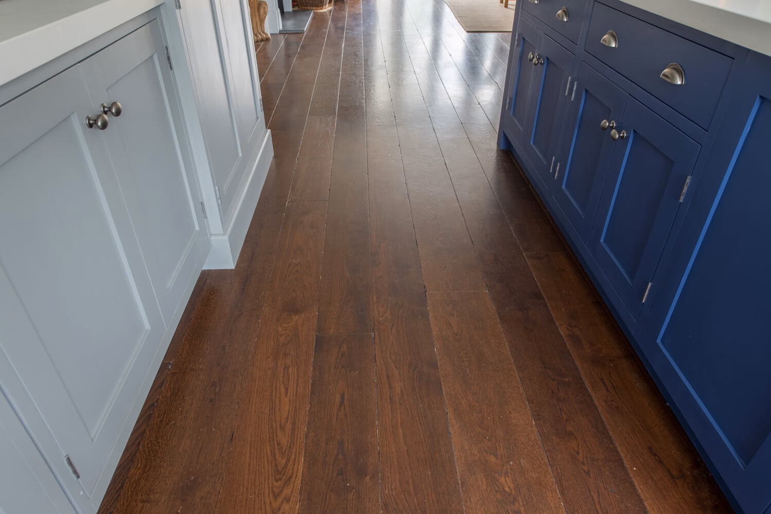 Idyllic Oxfordshire countryside home showcasing beautifully hand distressed planks in 180mm and 220mm wide random mixed widths, bringing character in abundance to this quaint country style Kitchen.