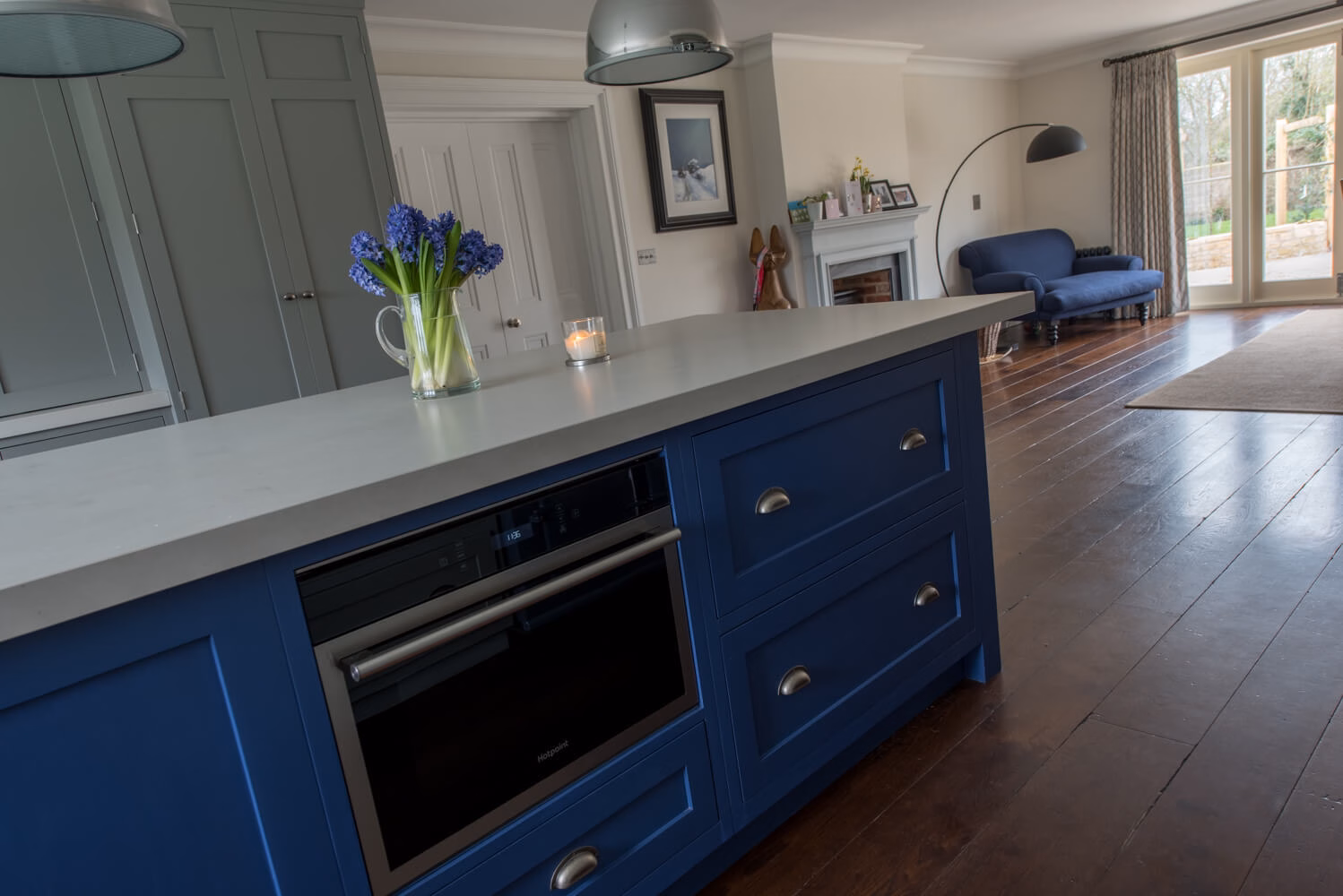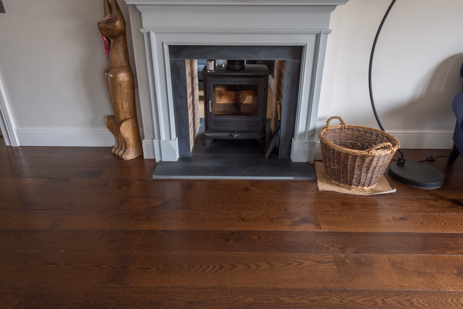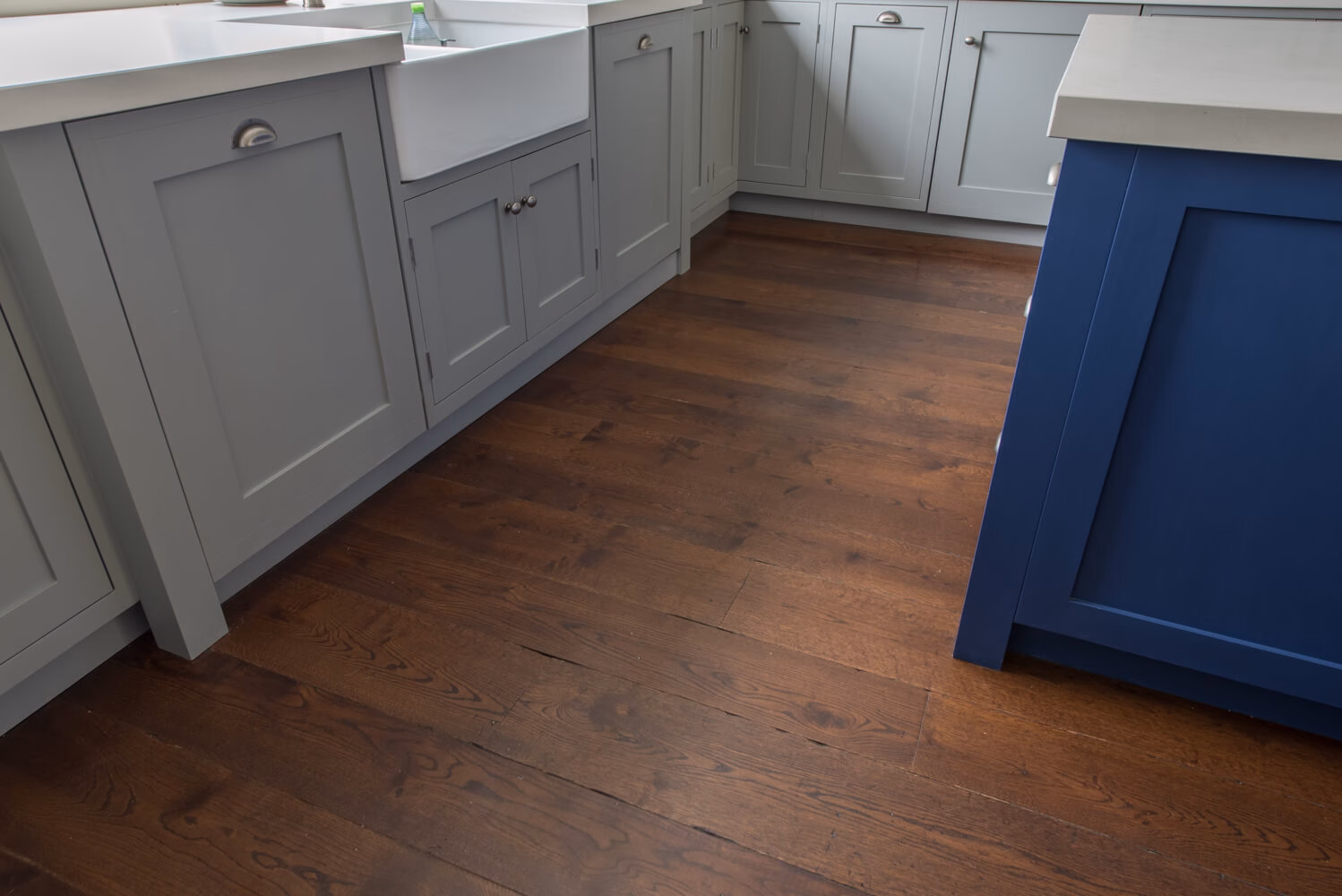Idyllic Oxfordshire countryside home showcasing beautifully hand distressed planks in 180mm and 220mm wide random mixed widths, bringing character in abundance to this quaint country style Kitchen.