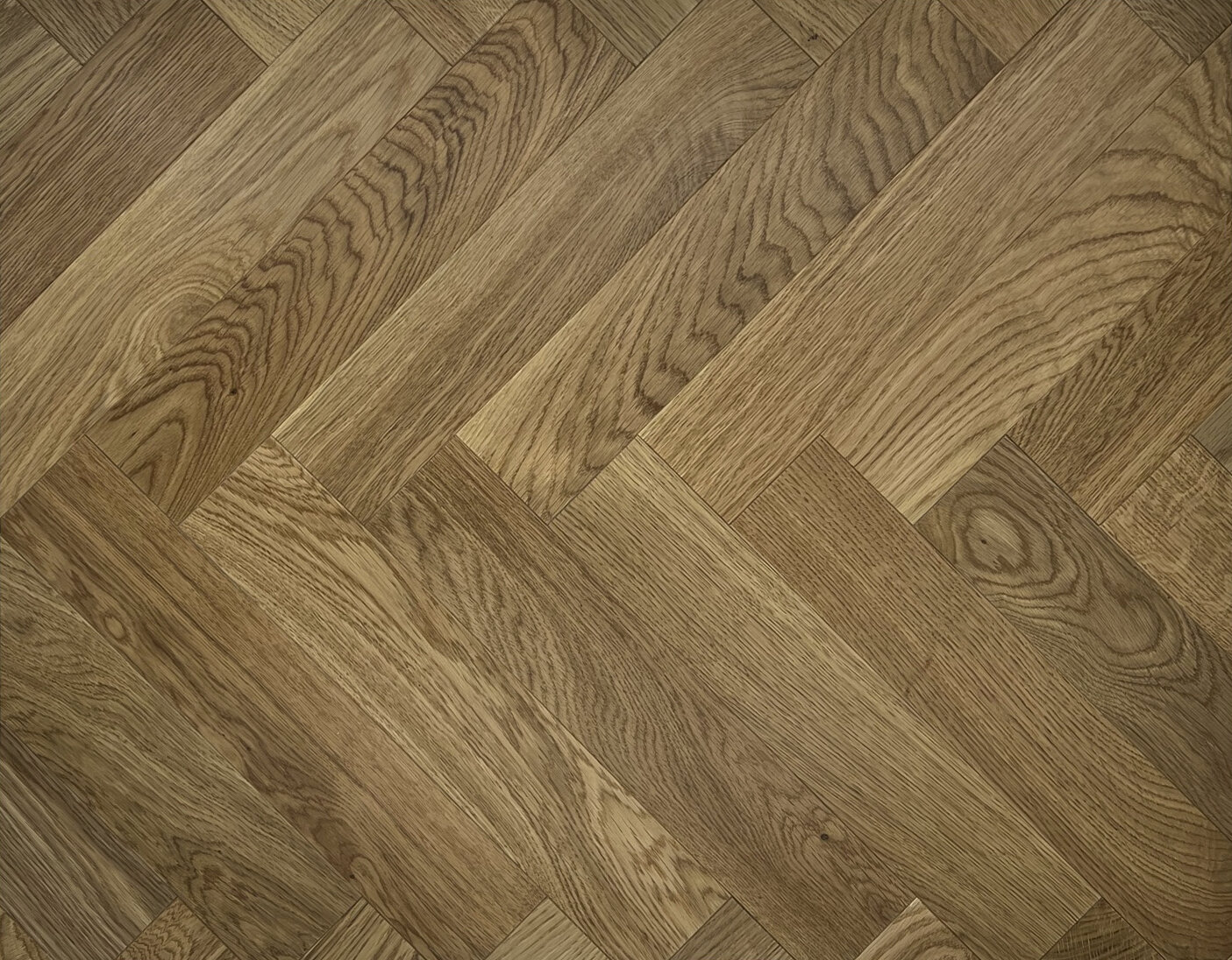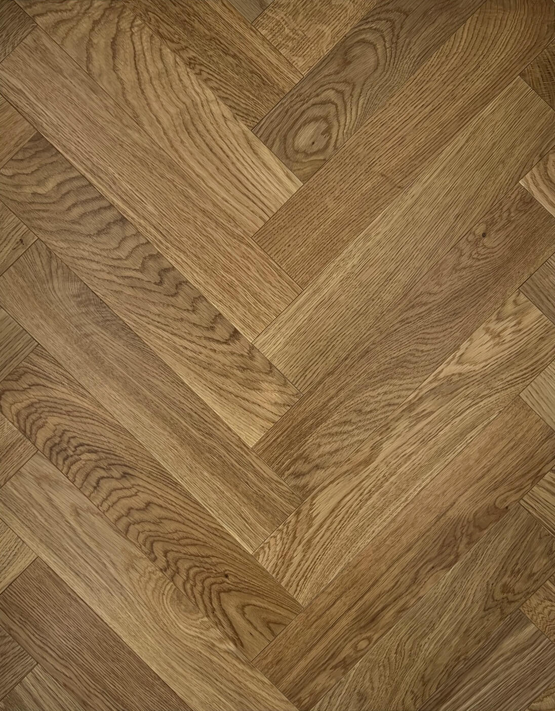 Engineered Oak herringbone parquet 90º is available in the following width: 90 mm, length: 450 mm, with an overall thickness of 14 mm ( 3 mm top oak layer ). Rustic Grade.  Suitable for underfloor heating.