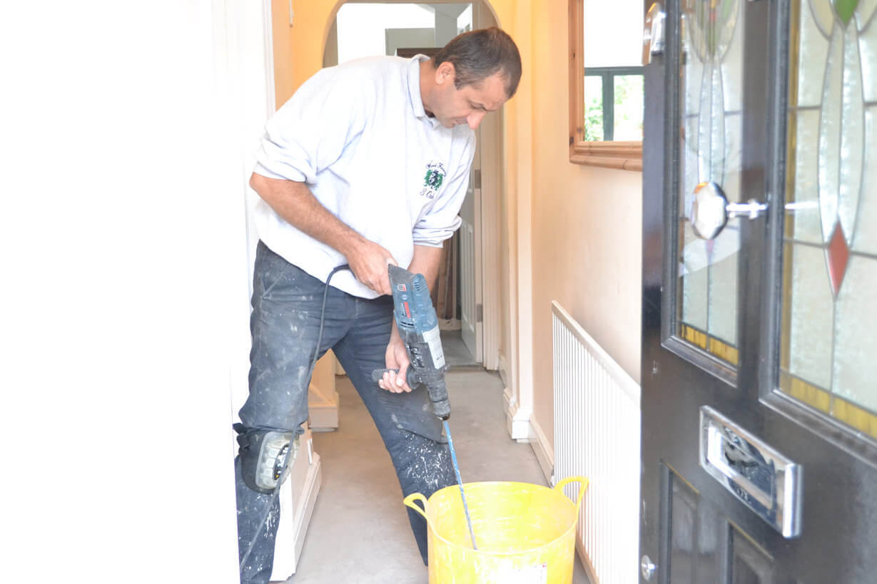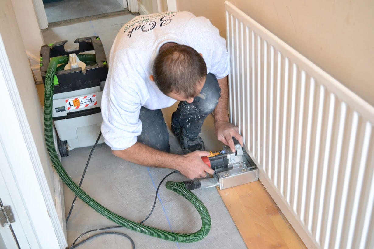 The Oak Parquet flooring was laid in the hallway and living room but in this case the existing pine boards were not level enough to lay the engineered oak parquet directly on top. We decided to use a Self-Leveling Compound to make the sub-floor absolutely flat and avoid any future issues with the new floor. After the Levelling Compound had set we were able to cut the skirting boards to allow the new Oak Parquet floor to fit perfectly without the need for any beading or trim.