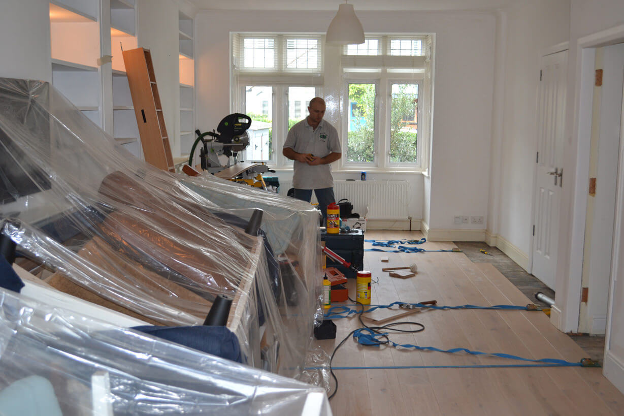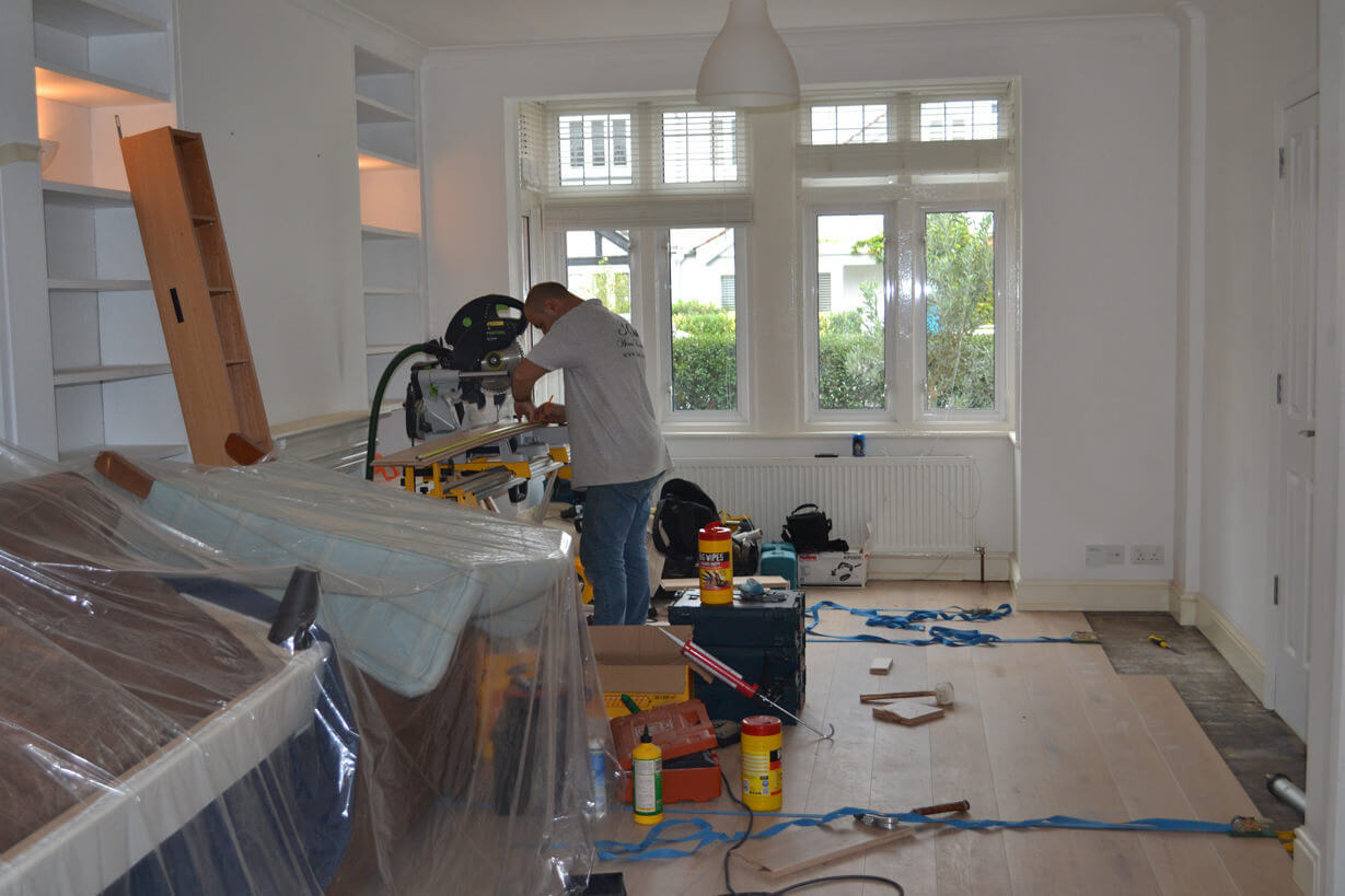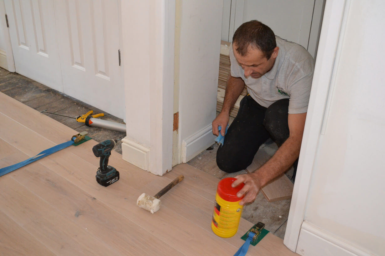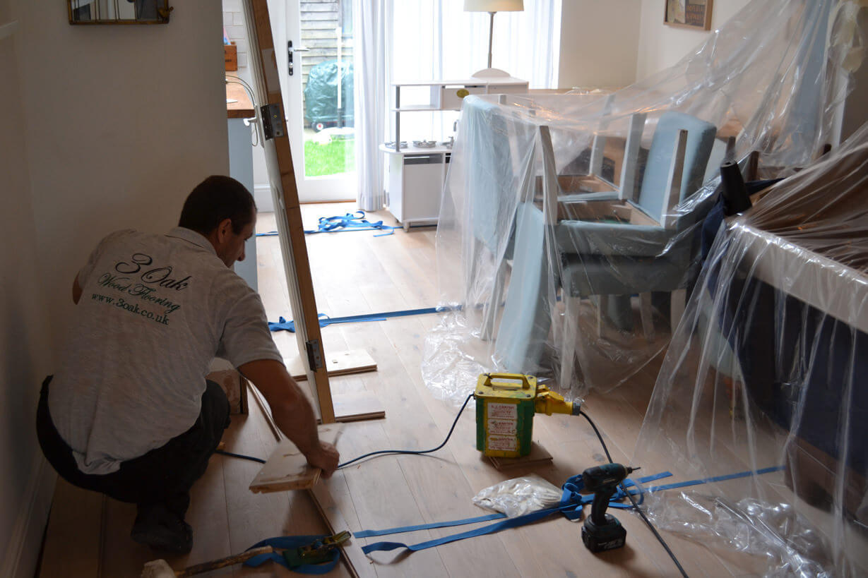 White Washed Oak flooring being installed in a clients house in Ealing, West London. This floor is 21 mm thick and the boards are 180 mm wide. This flooring was installed throughout the ground floor of the house. This was a character grade floor, supplied and installed by 3 Oak. For more information on this flooring, please see the Wood Flooring section of our website.