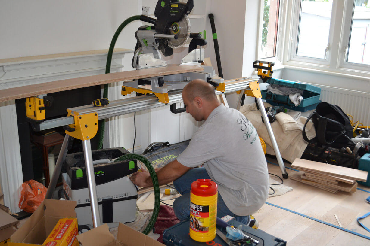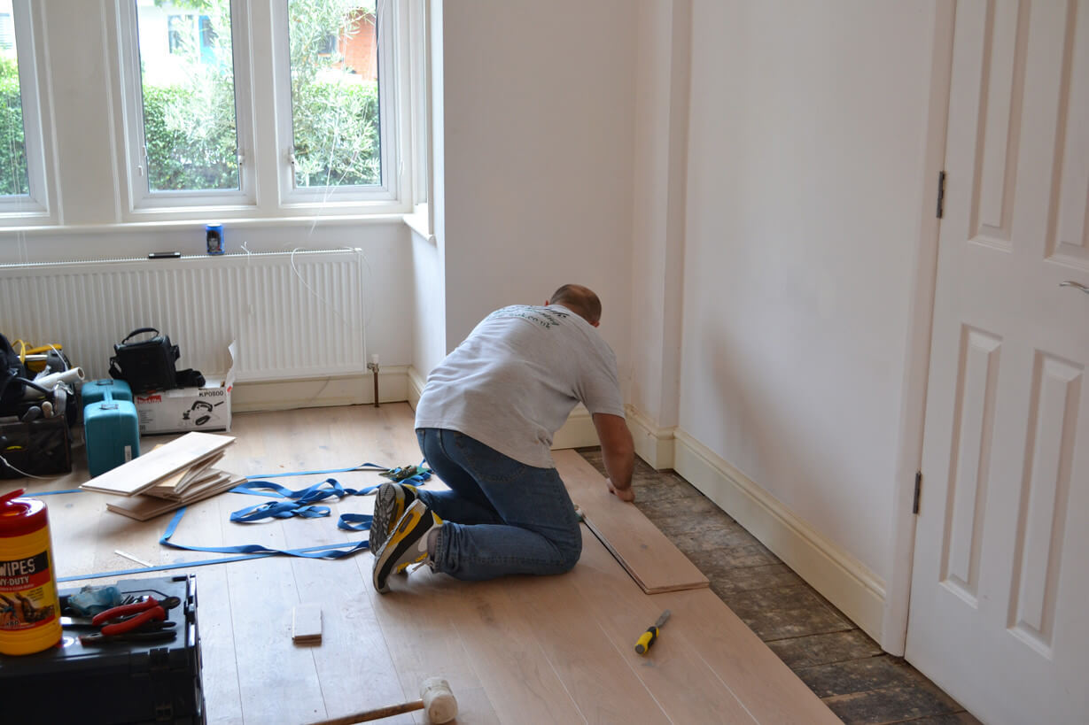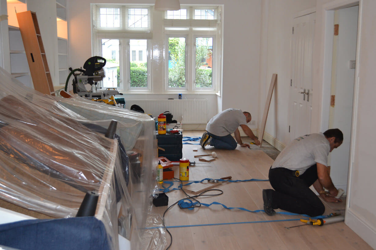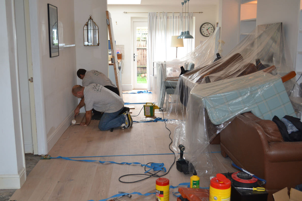 White Washed Oak flooring being installed in a clients house in Ealing, West London. This floor is 21 mm thick and the boards are 180 mm wide. This flooring was installed throughout the ground floor of the house. This was a character grade floor, supplied and installed by 3 Oak. For more information on this flooring, please see the Wood Flooring section of our website.