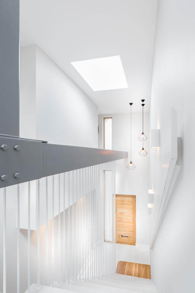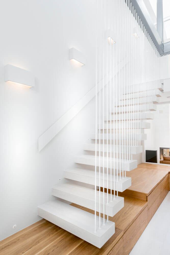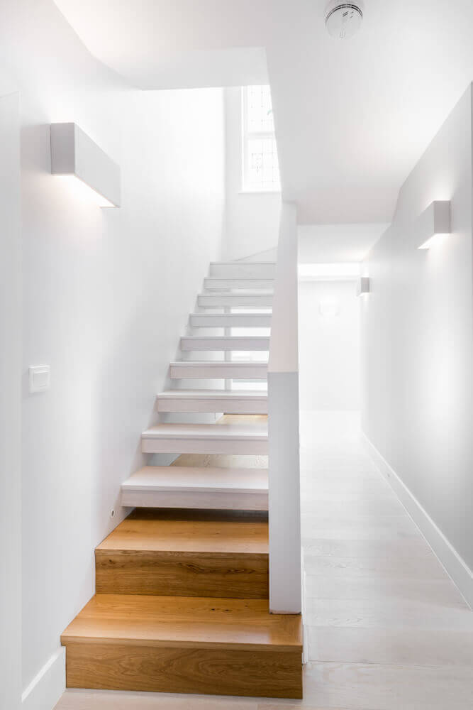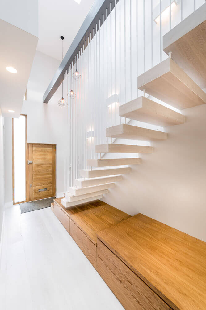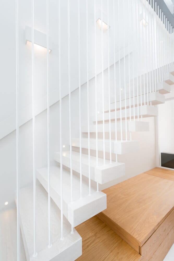 Lime Washed Engineered Oak Prime Grade – 21 mm x 240 mm – Luxury modern design project. This project showcases some of our finest bespoke staircases. Firstly a White Cantilever Staircase with wall anchored floating treads and White Balustrade, create a high- end contemporary finish. The second is made using Prime Grade Lime Washed Engineered Timber for the Seamless Treads and Risers.