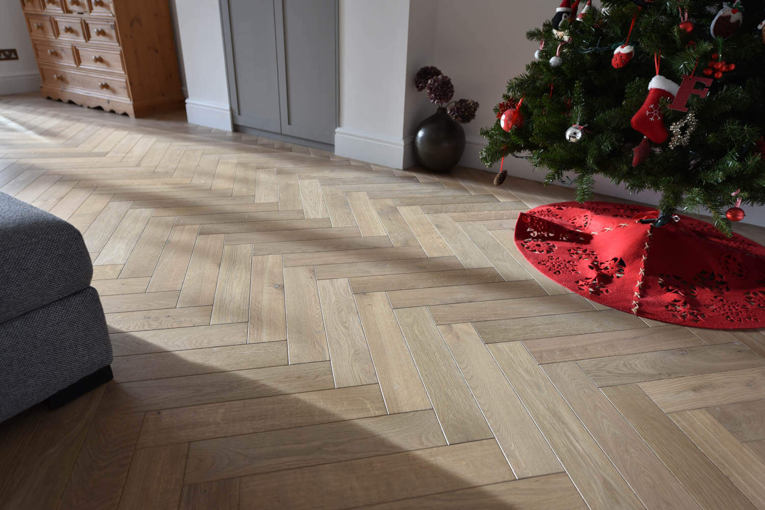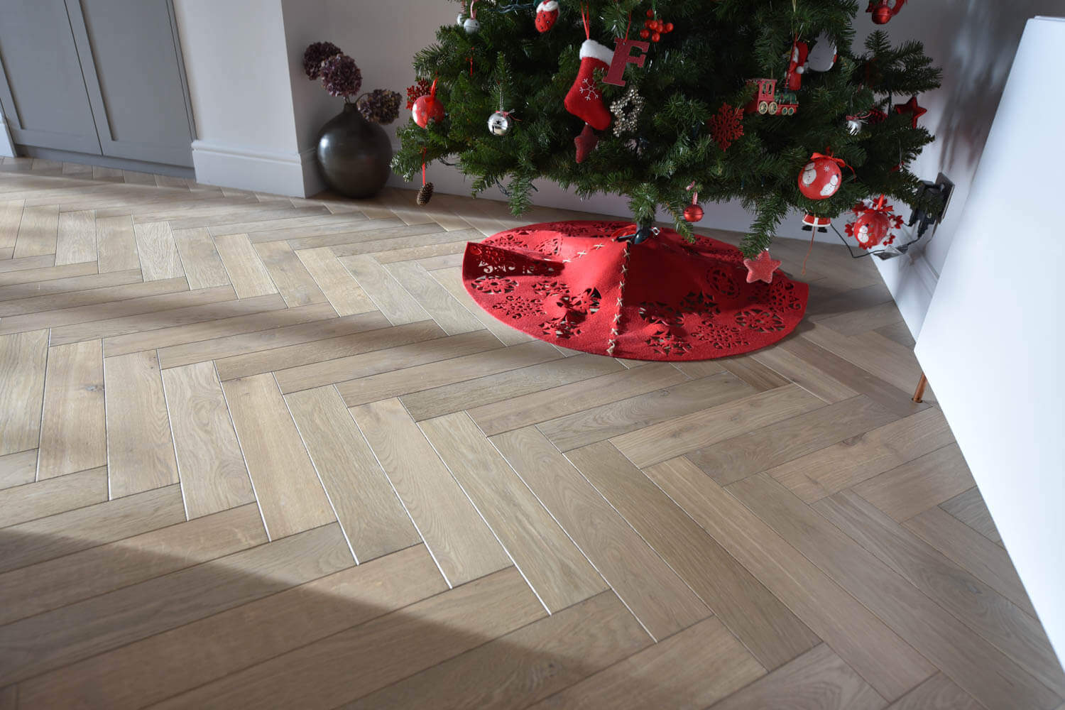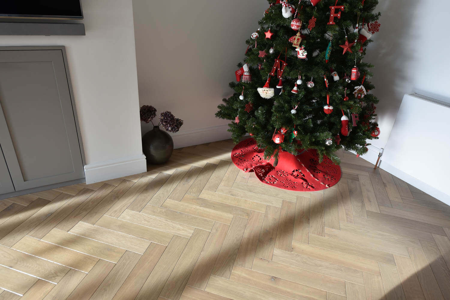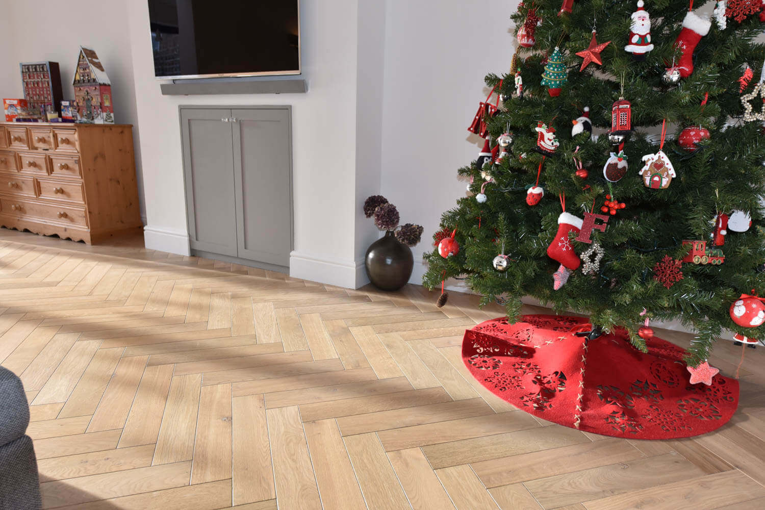 The cosy living room is beautifully decorated with a Christmas tree that adds an welcoming holiday feel to the space. The lovely herringbone oak flooring brings a touch to the room, with its tones and intricate design that complements the festive decorations perfectly. Soft lighting and selected furnishings enhance the charm of the room. Create an ideal atmosphere, for hosting intimate holiday get togethers.