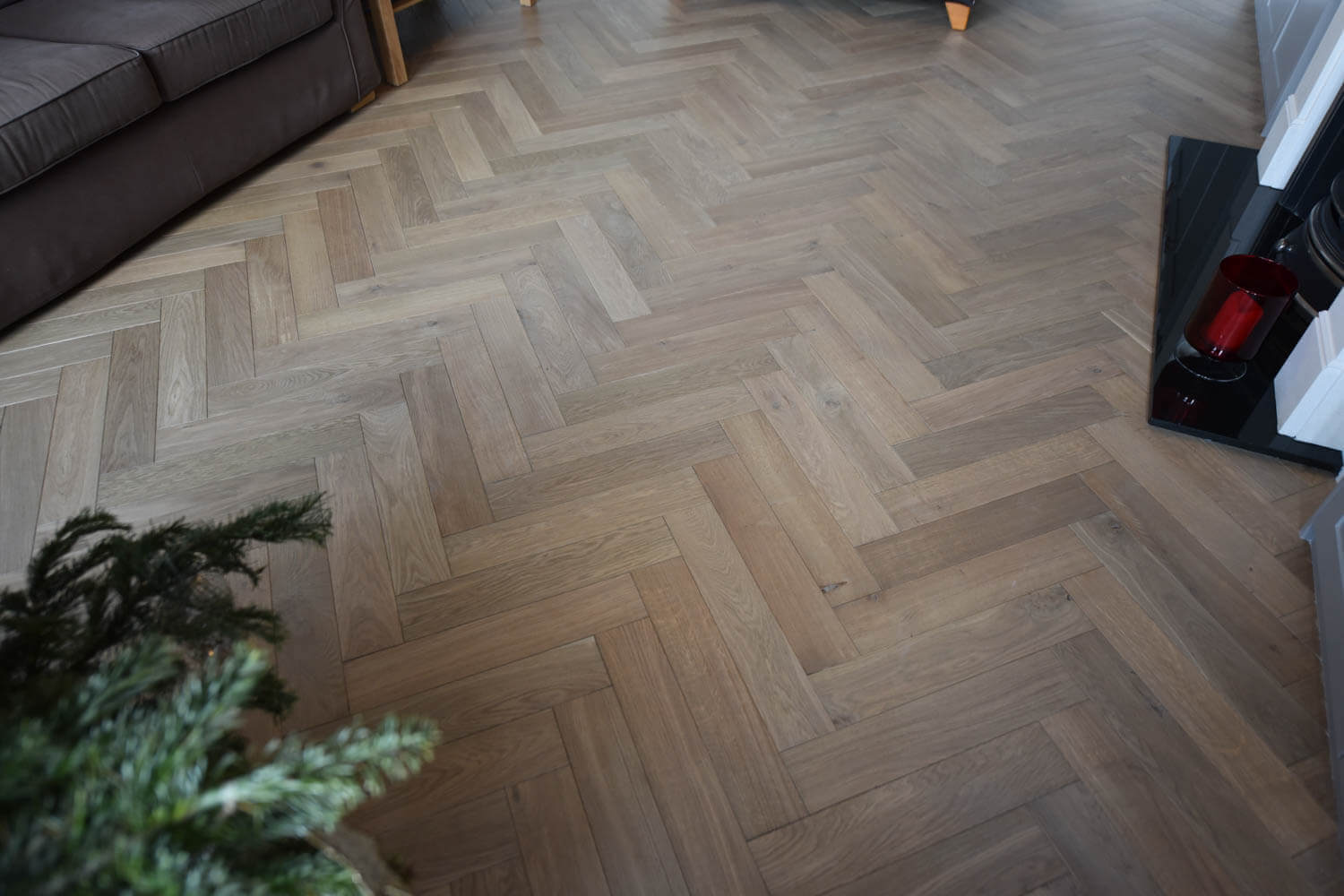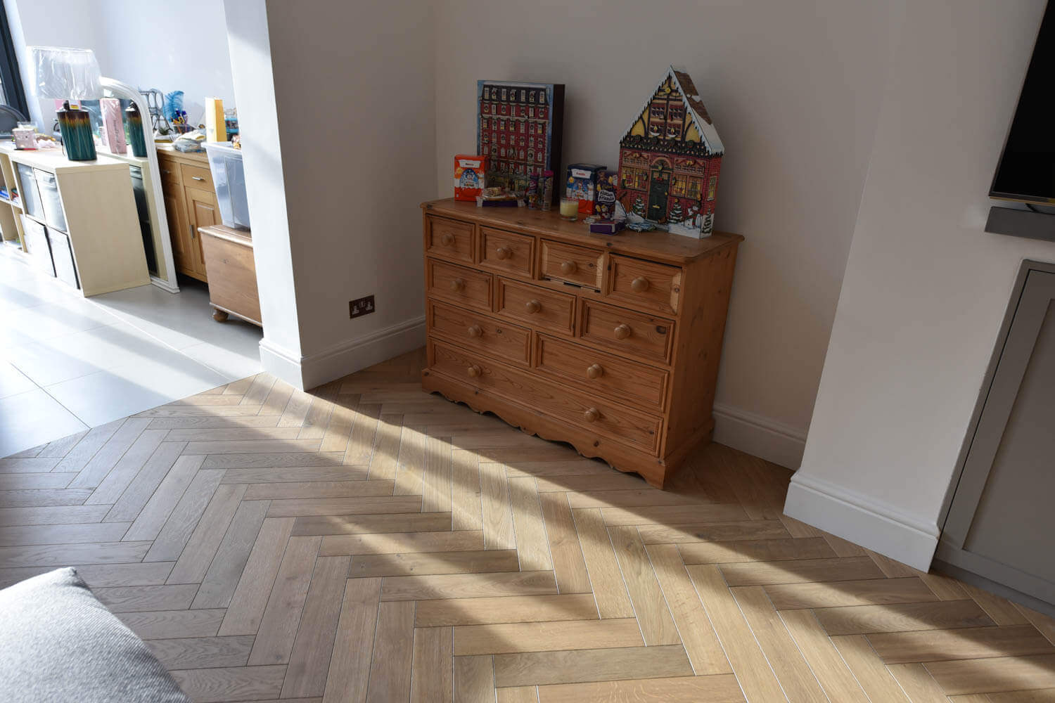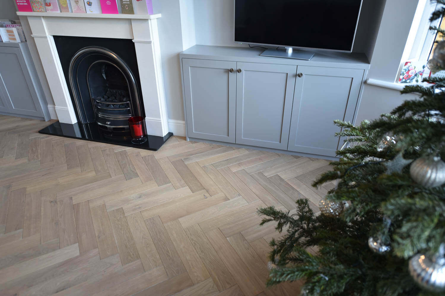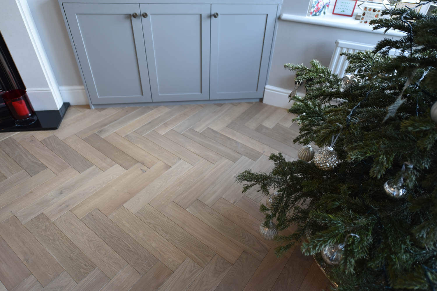The cosy living room is beautifully decorated with a Christmas tree that adds an welcoming holiday feel to the space. The lovely herringbone oak flooring brings a touch to the room, with its tones and intricate design that complements the festive decorations perfectly. Soft lighting and selected furnishings enhance the charm of the room. Create an ideal atmosphere, for hosting intimate holiday get togethers.