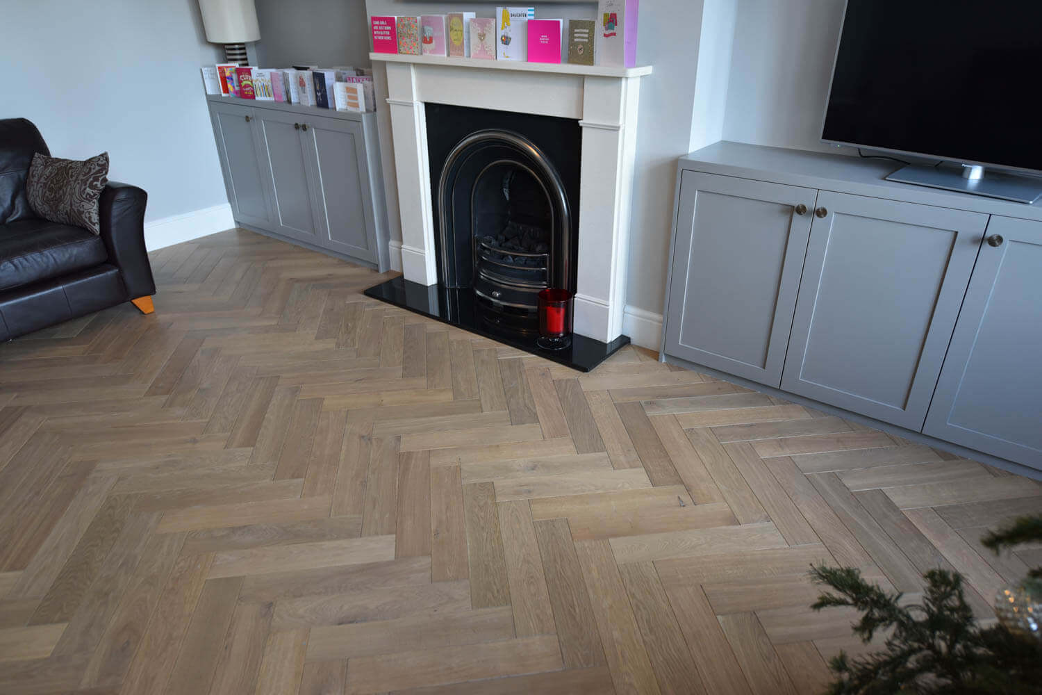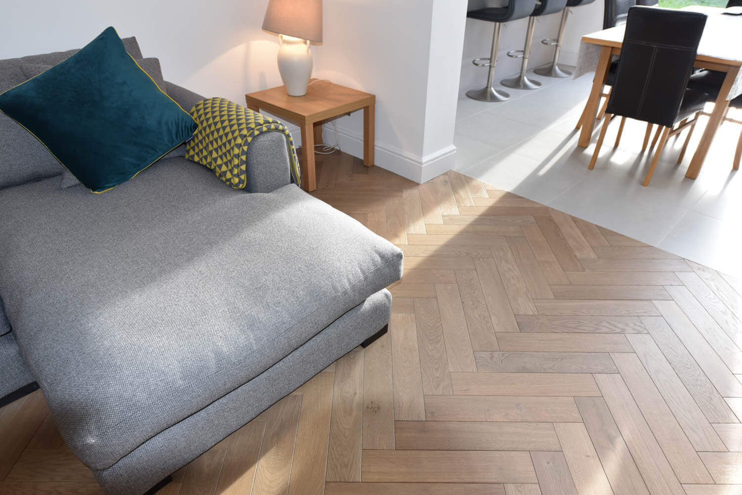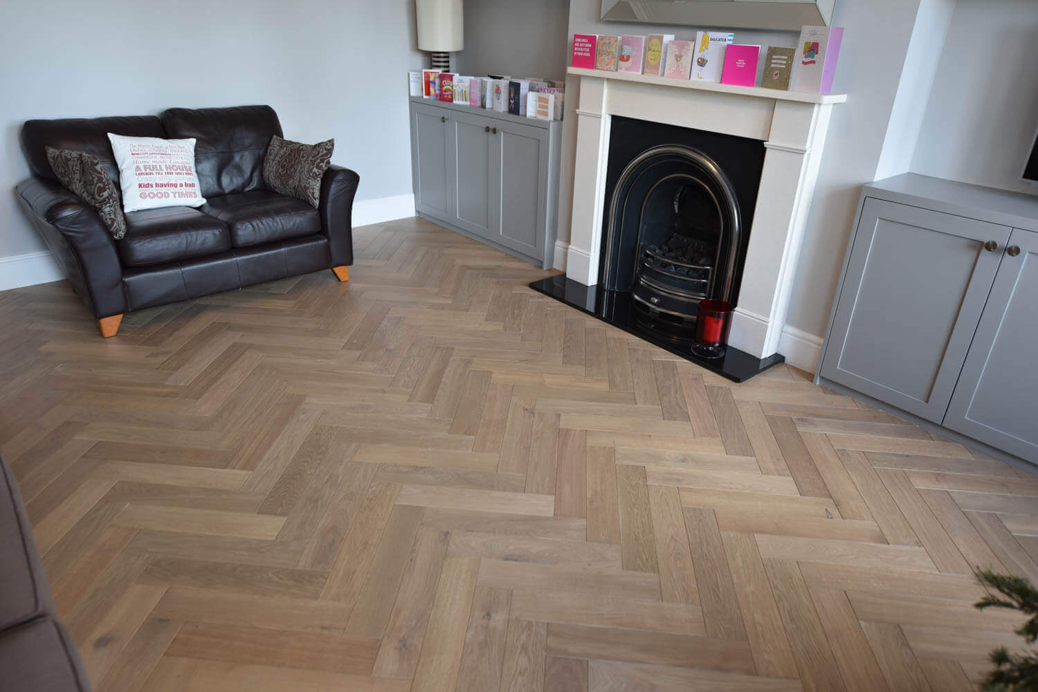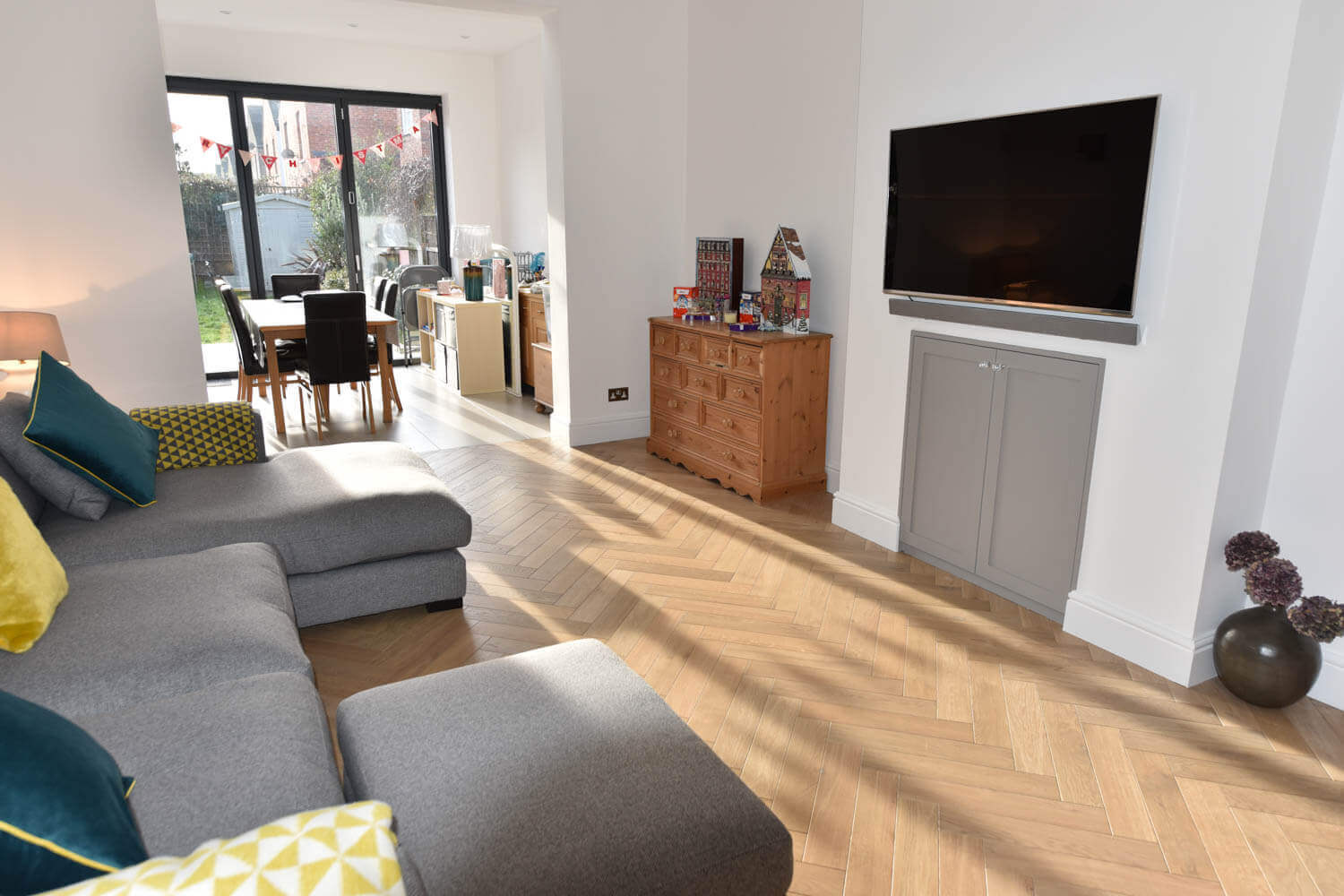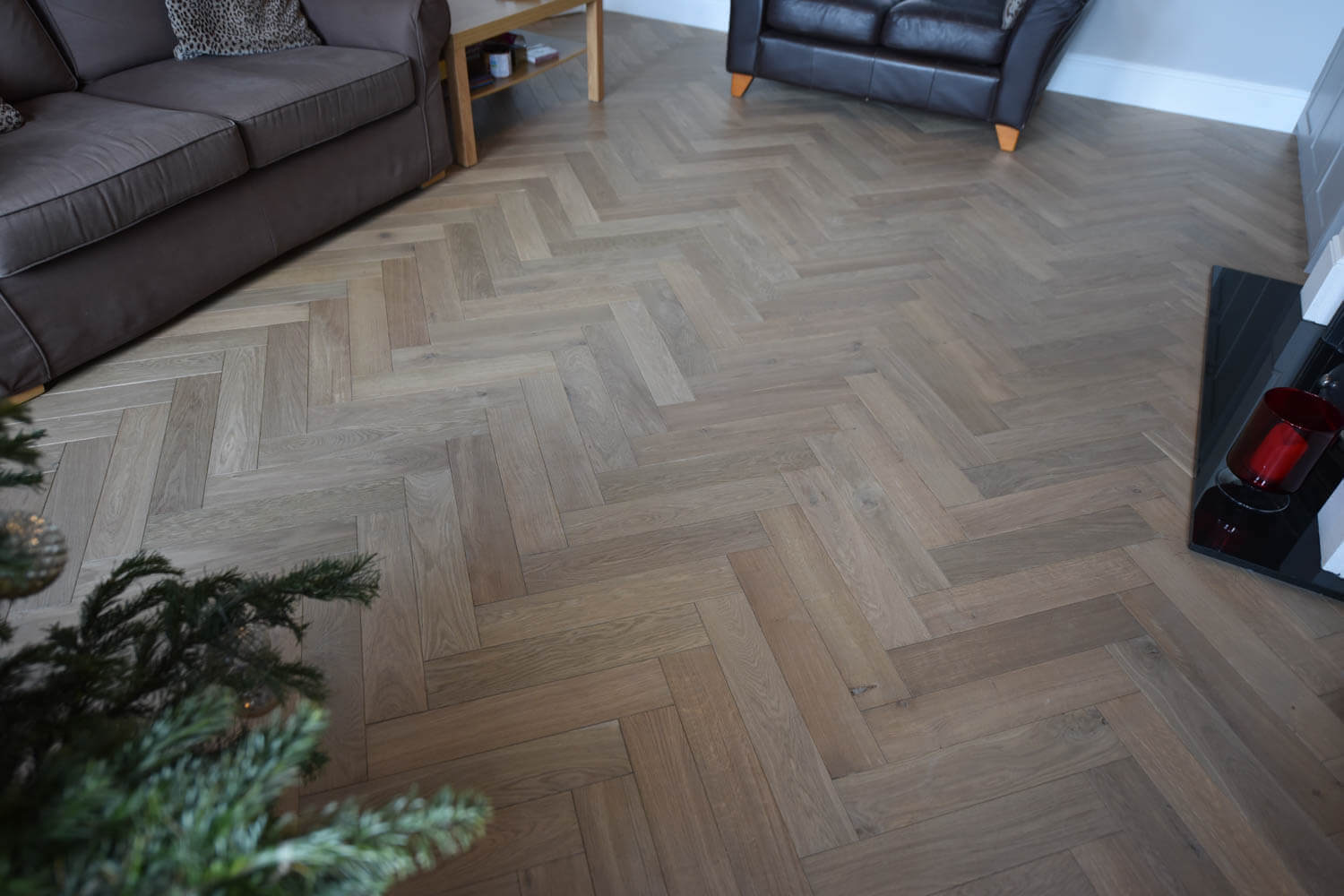 The cosy living room is beautifully decorated with a Christmas tree that adds an welcoming holiday feel to the space. The lovely herringbone oak flooring brings a touch to the room, with its tones and intricate design that complements the festive decorations perfectly. Soft lighting and selected furnishings enhance the charm of the room. Create an ideal atmosphere, for hosting intimate holiday get togethers.