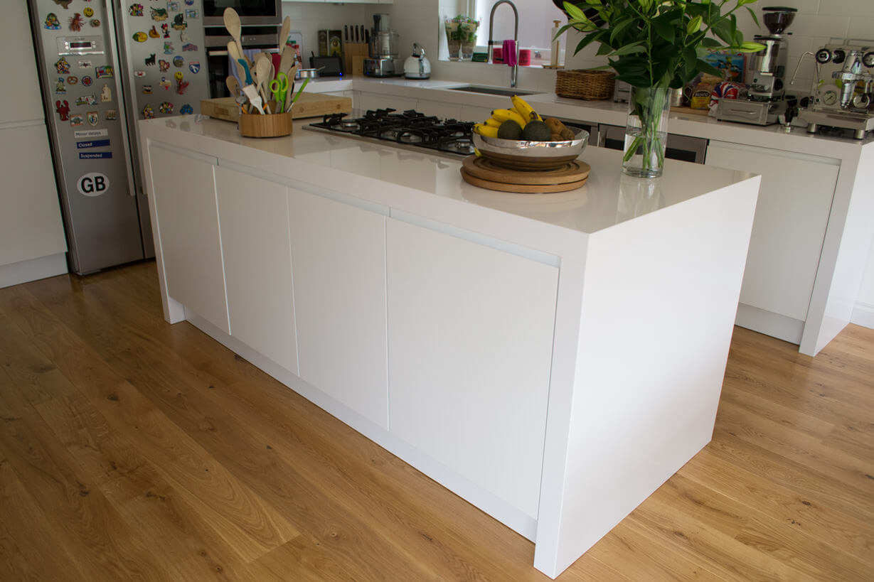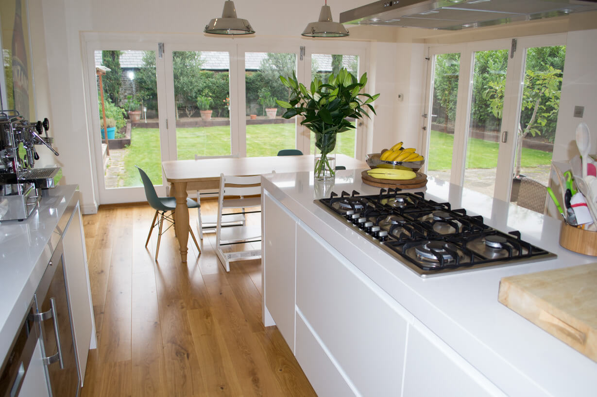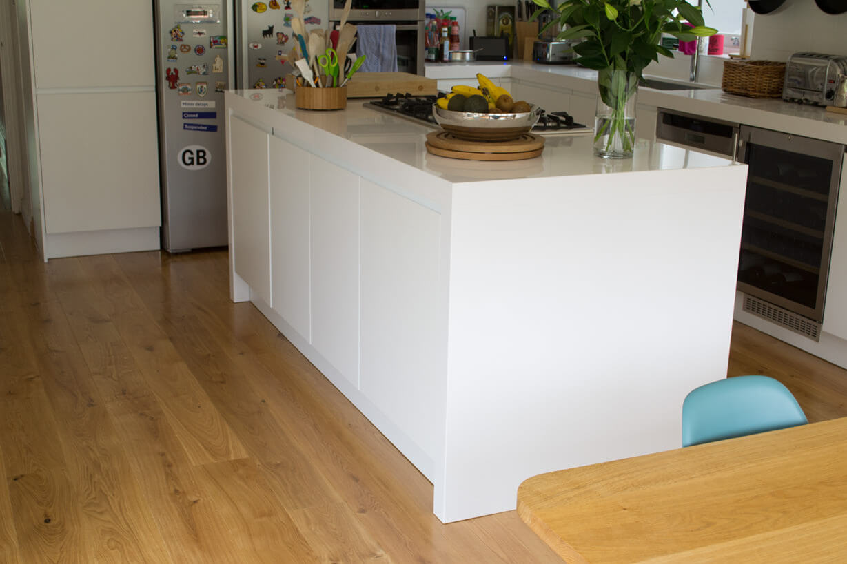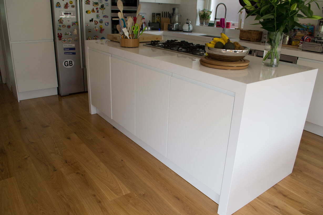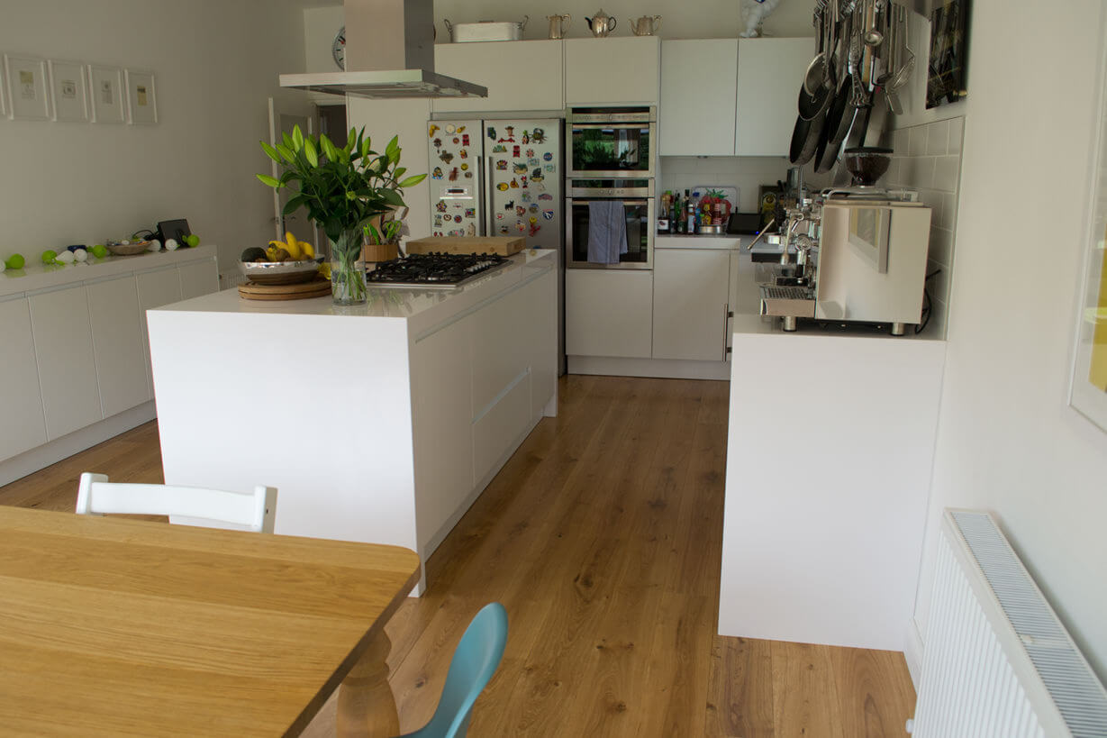 The client currently had white tiles making it feel quite flat and cold next to their white kitchen however throughout the rest of the ground floor they had wood and the brief was to continue the wood into the kitchen.