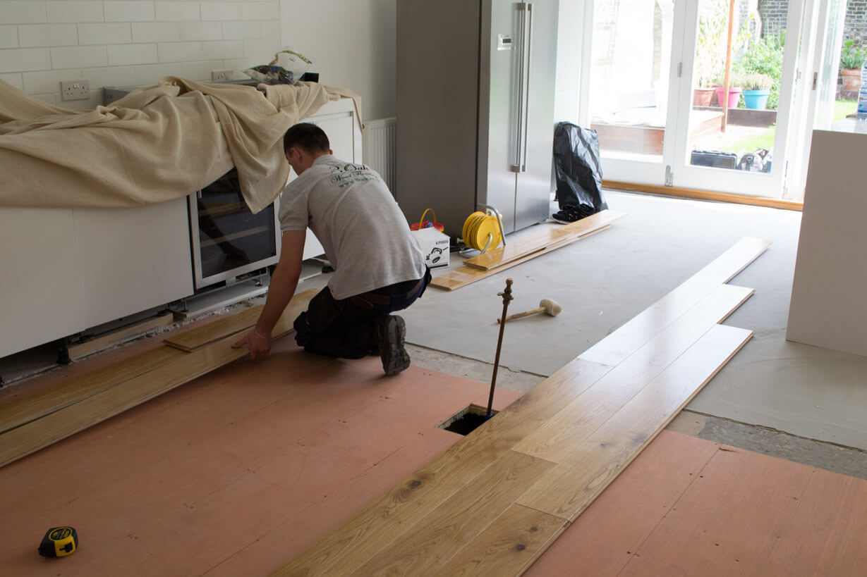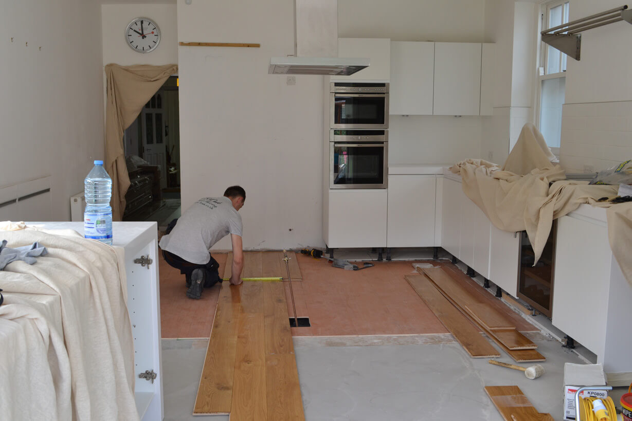 The main part of the work was to put in place a new subfloor suitable for wood to go on top but without increasing the height. So 3Oak took on the task to remove the existing tiles by hand, after these had been removed the sub floor had to be made level this was done with a combination of self-levelling compound and 6mm plywood to create a solid and level sub floor base.