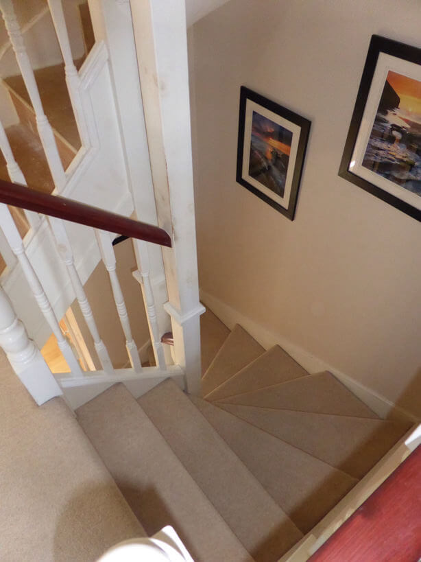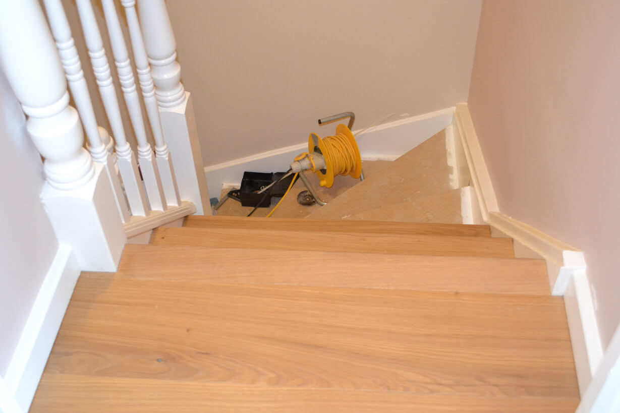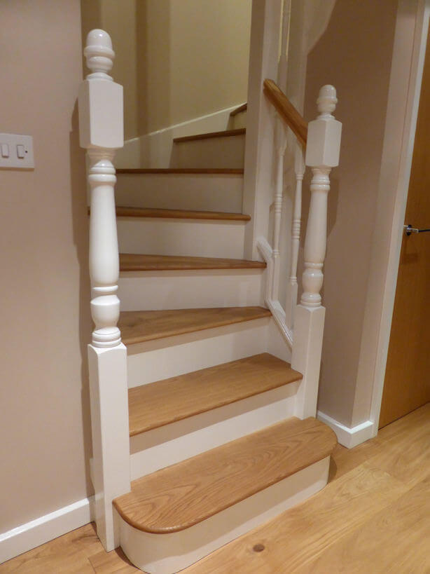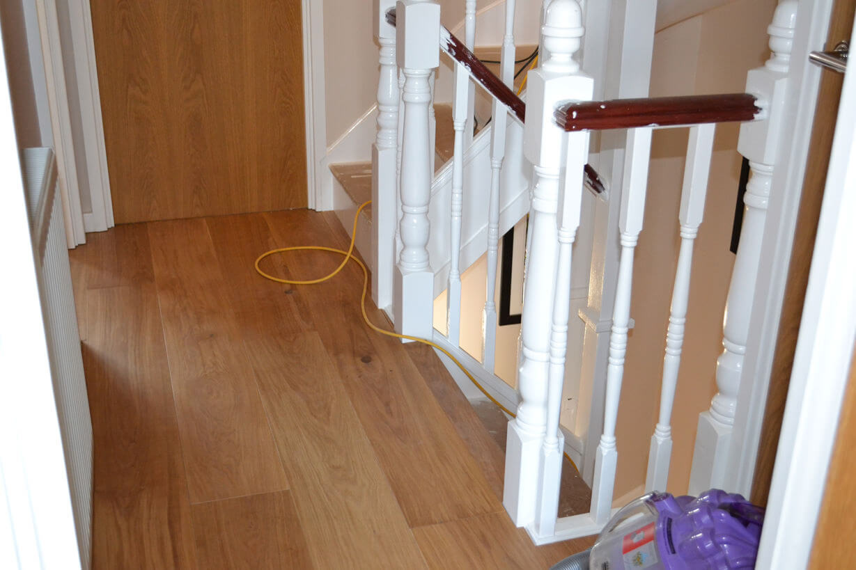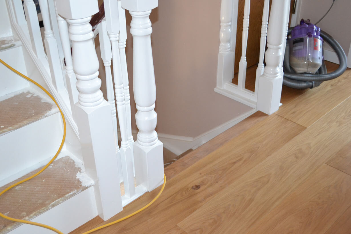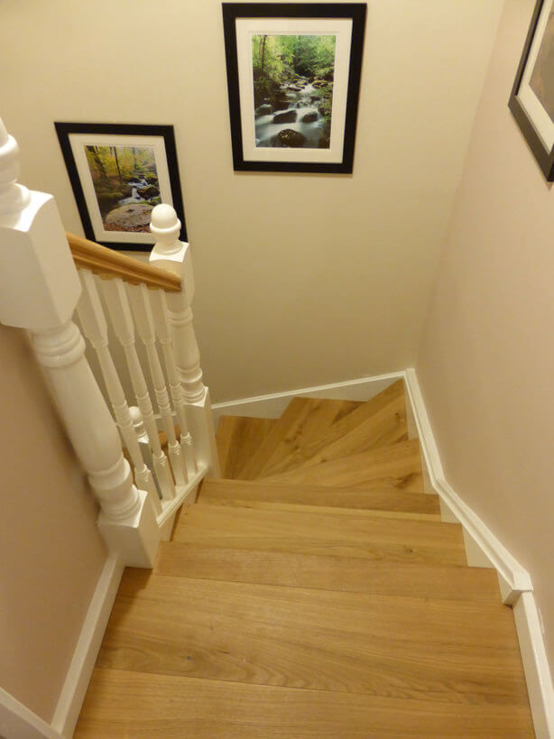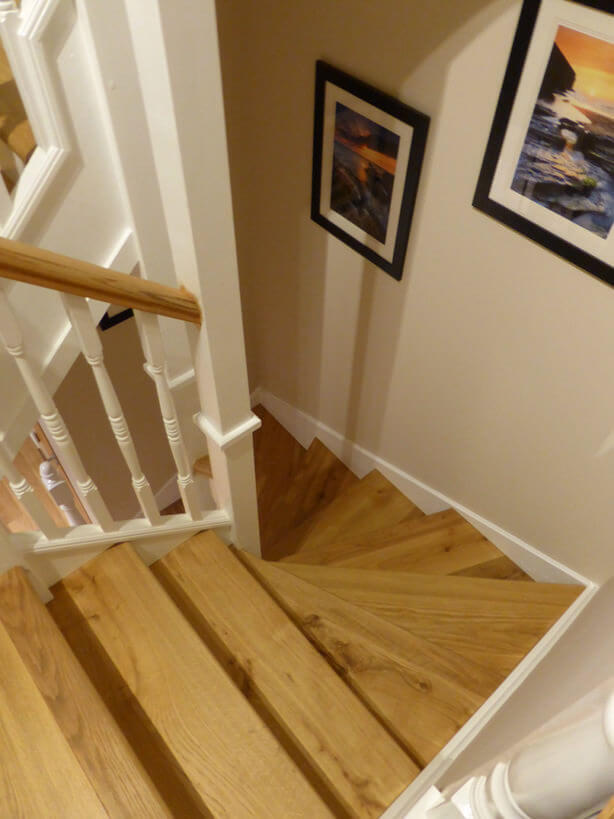 The original carpets were looking tired and because the landing and hallway were being laid with new Engineered Oak flooring it made sense to re-furbish the staircase too. The clients had been on our website and seen a photograph of one of our earlier staircase renovations in Benson, Oxfordshire, they liked the white risers and Oak treads and wanted it in there own home too. The treads had a solid oak nosing glued to the front edge that was then sanded and blended to achieve a uniform, one piece look. The Double Bullnose bottom tread was custom made out of solid European Oak.