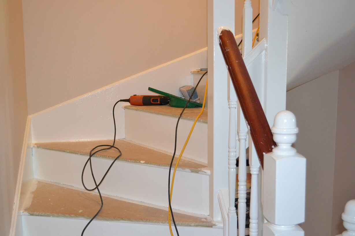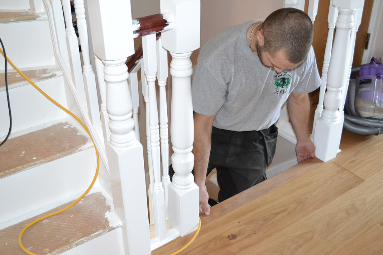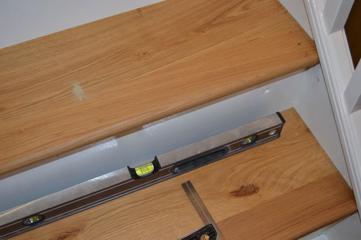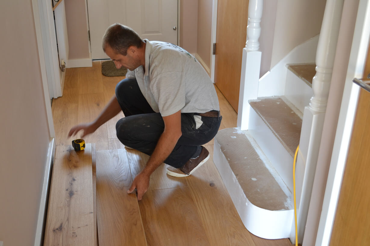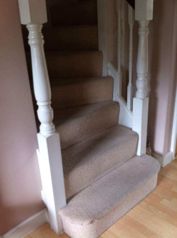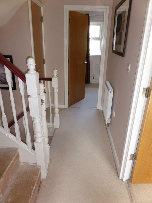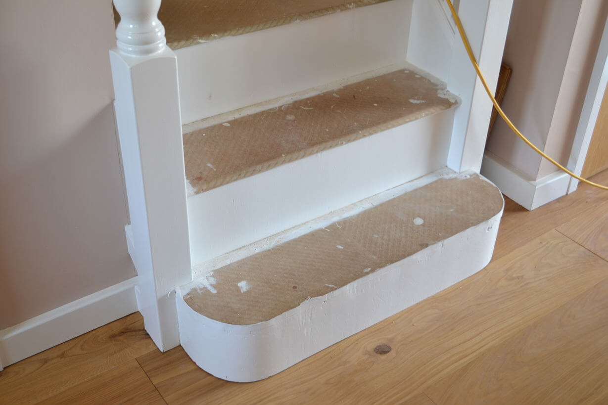 The original carpets were looking tired and because the landing and hallway were being laid with new Engineered Oak flooring it made sense to re-furbish the staircase too. The clients had been on our website and seen a photograph of one of our earlier staircase renovations in Benson, Oxfordshire, they liked the white risers and Oak treads and wanted it in there own home too. The treads had a solid oak nosing glued to the front edge that was then sanded and blended to achieve a uniform, one piece look. The Double Bullnose bottom tread was custom made out of solid European Oak.