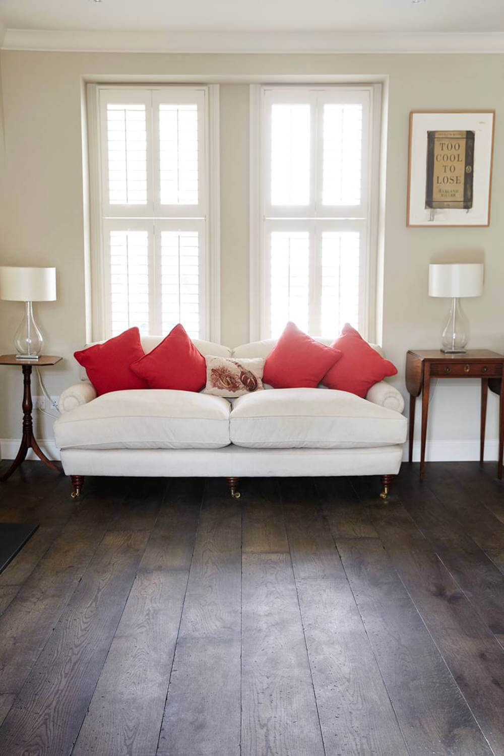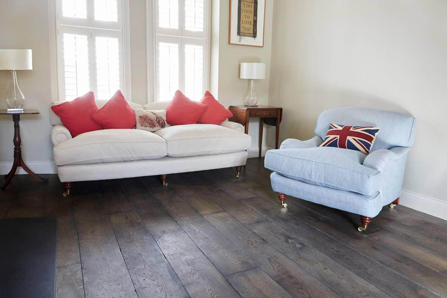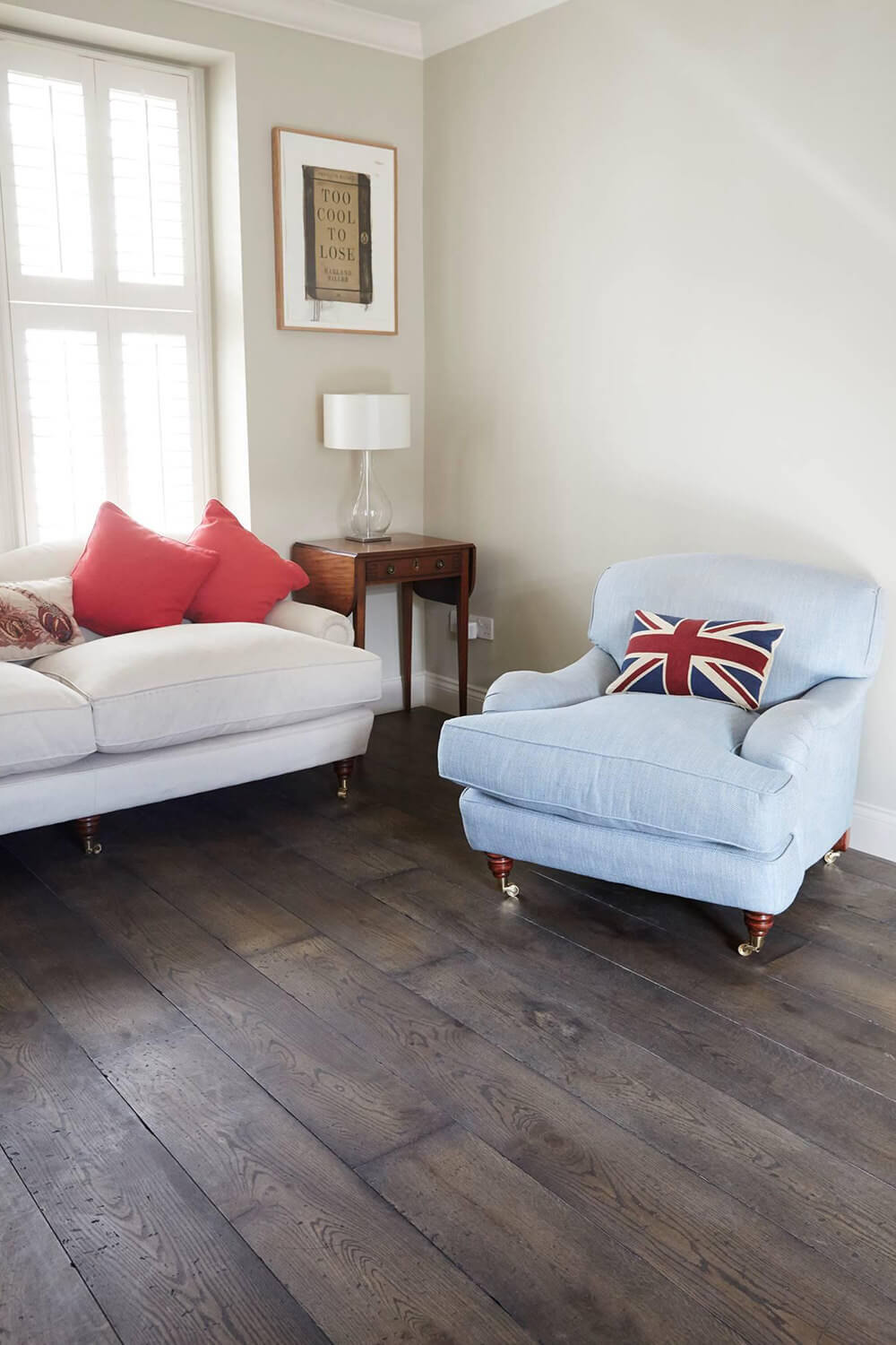 Fulham 21mm x 22mm Character Grade Engineered Oak – Our Distressed Burnt Earth finish has worked beautifully with the modern shabby chic décor. The dark tone finish and the rich textures of Oak are balanced beautifully by the light neutral furnishings.