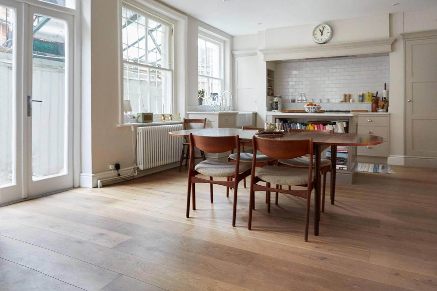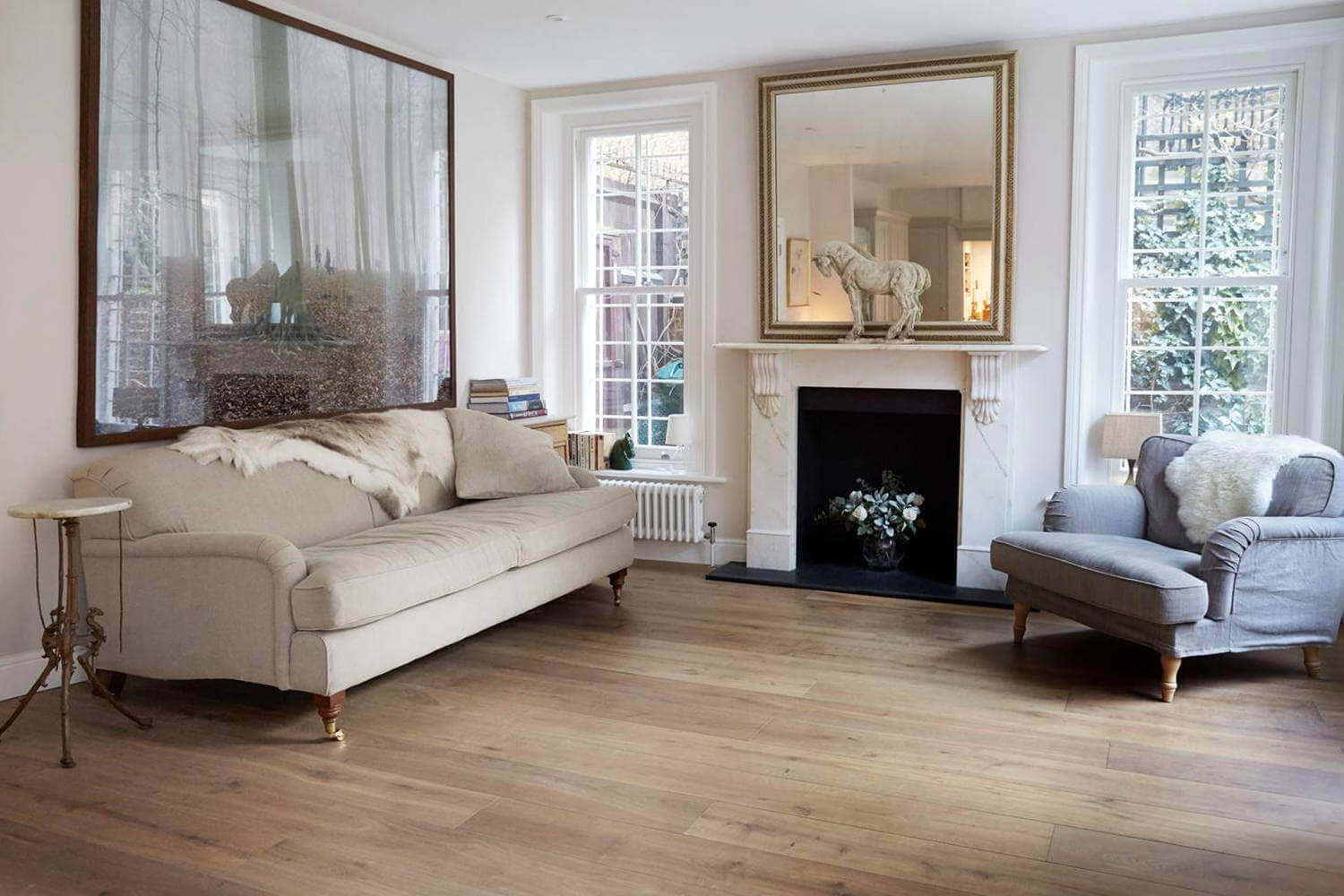Hammersmith 16mm x 220mm – Character grade Engineered Oak – Our bespoke “Double Fumed” finish compliments this Traditional Victorian House. This space is brighten up by the flooring, original feature fireplaces and sash windows are beautifully contrasted by the warm colour of the fumed natural flooring.