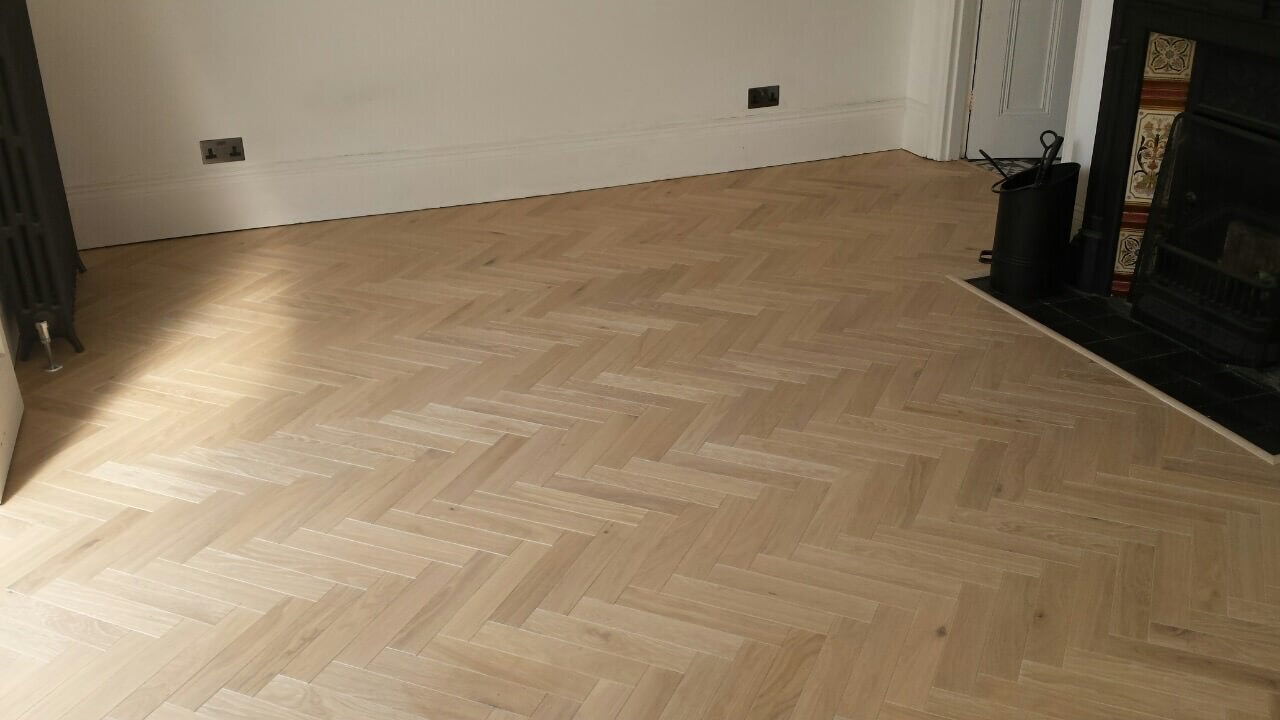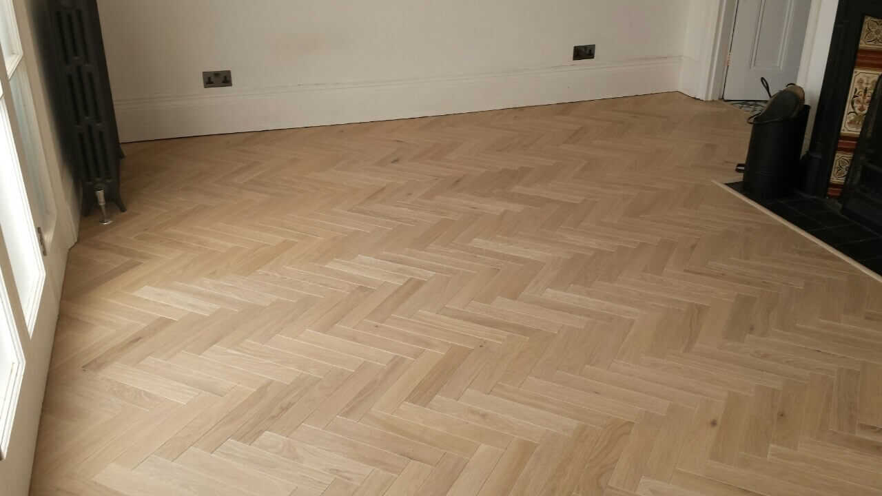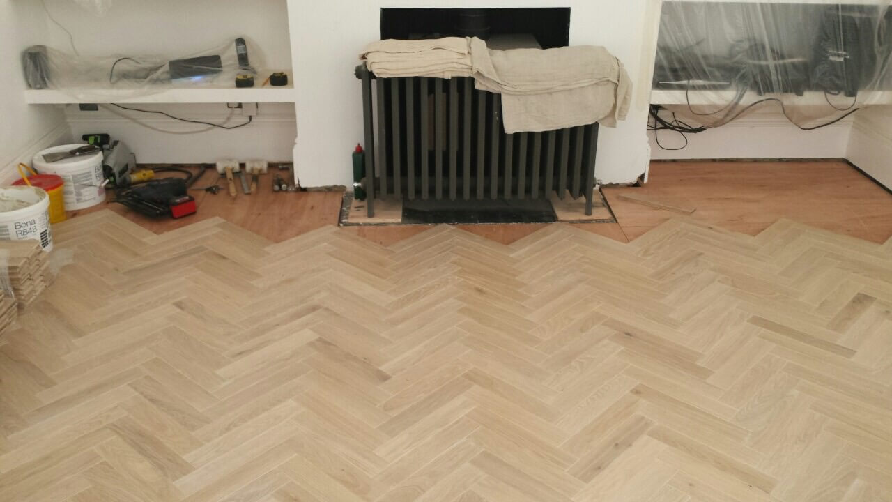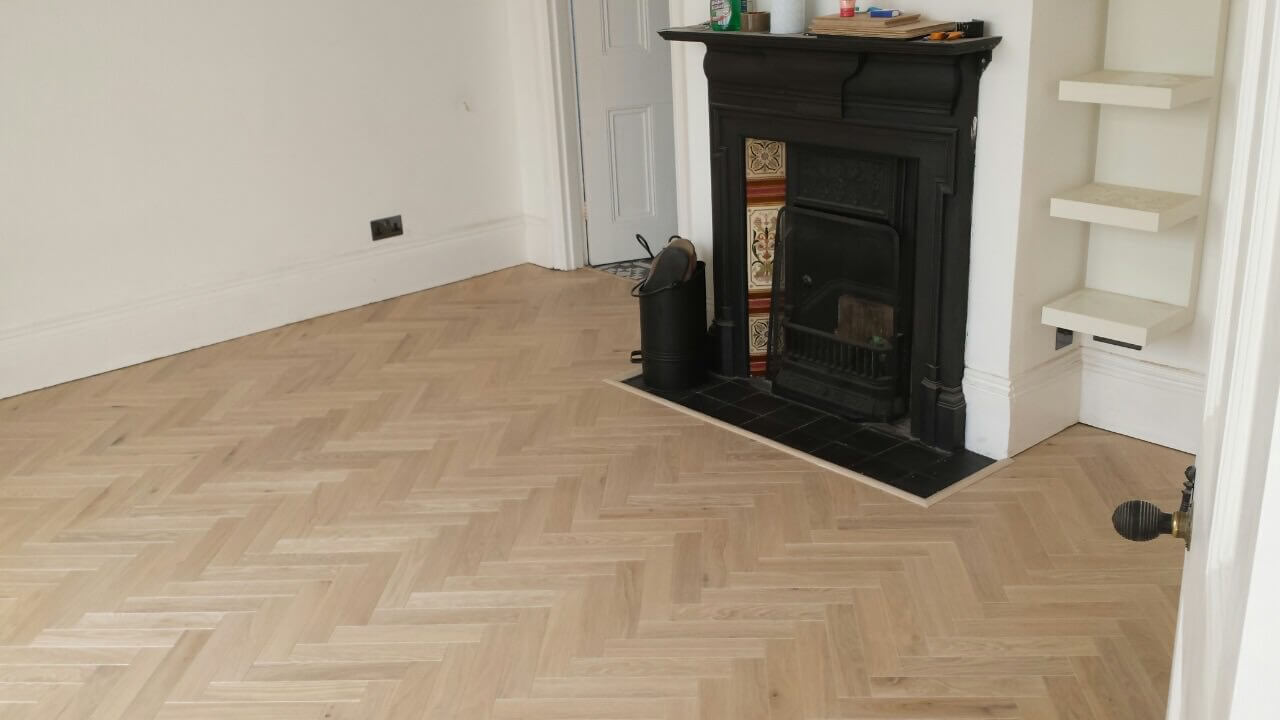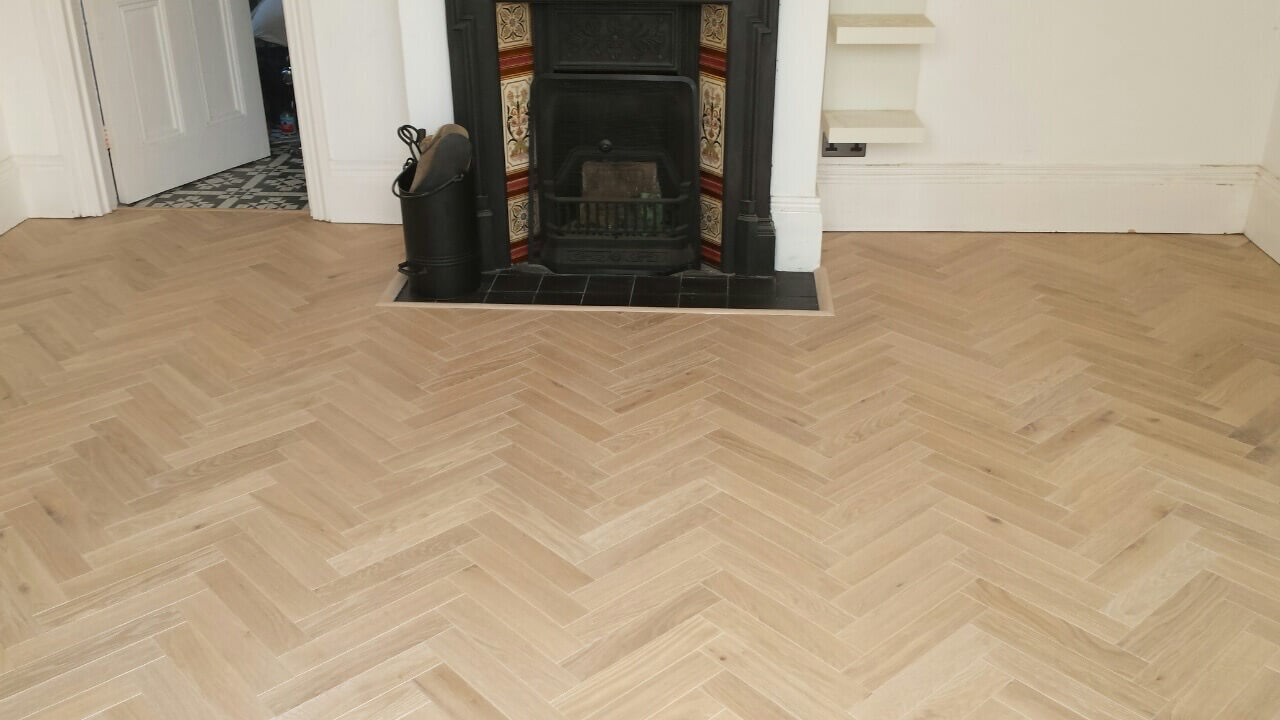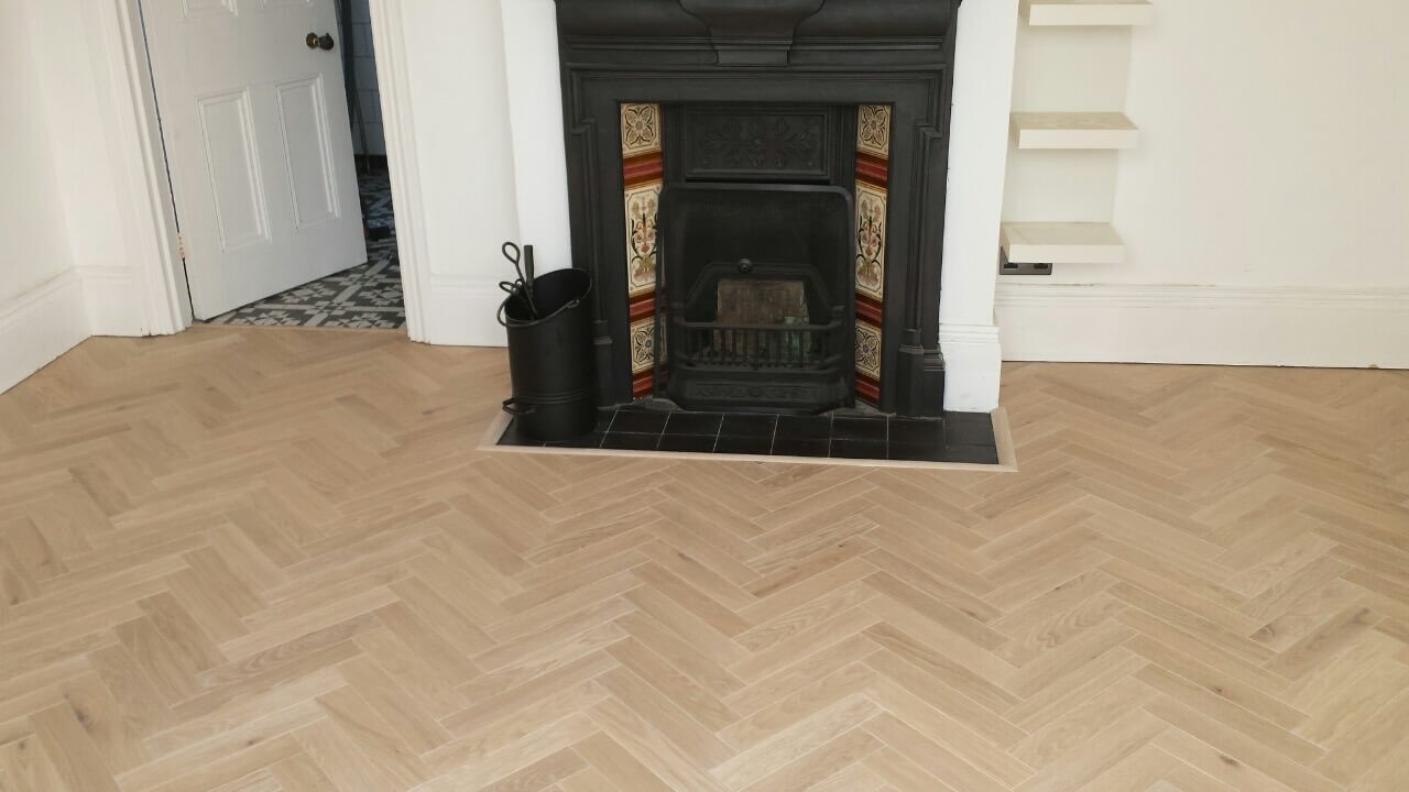 Brushed White in Herringbone Parquet 21mm x 70mm x 350mm Character Grade. This Victorian property required a complete refurbishment of the existing subfloor. Joists have been planed, checked, levelled or replaced where necessary. After a new structural 18mm plywood subfloor was installed, we were able to glue directly on top with the Herringbone Parquet. The original character features in the property are complimented beautifully with the traditional parquet flooring restoring this property to its original splendour.