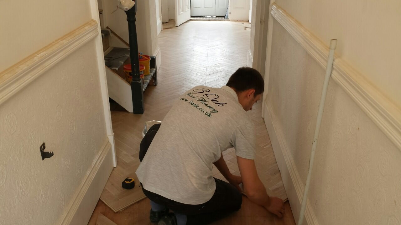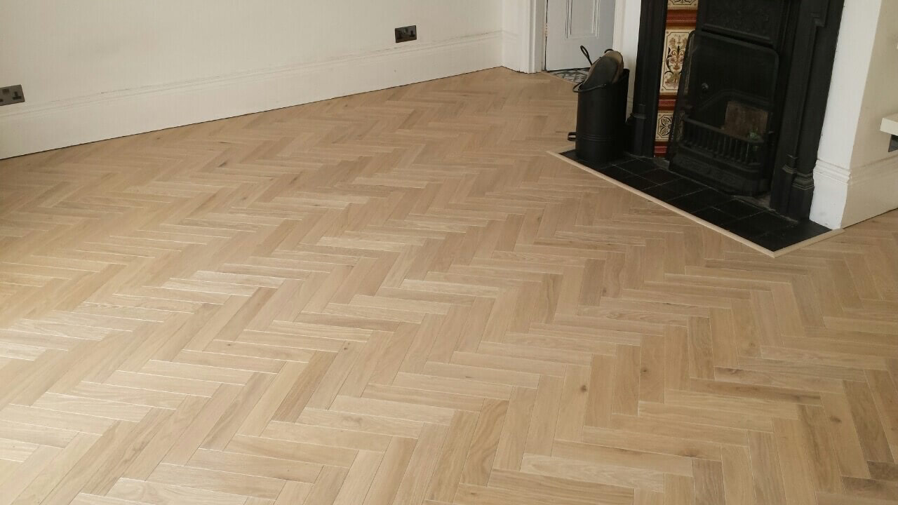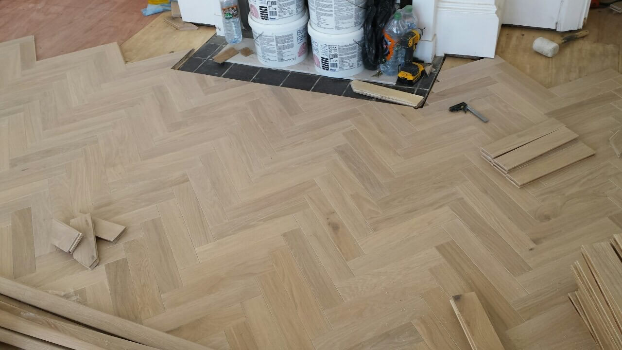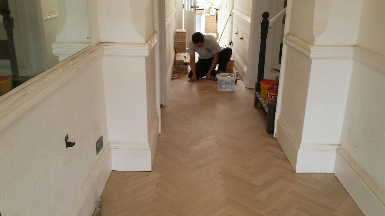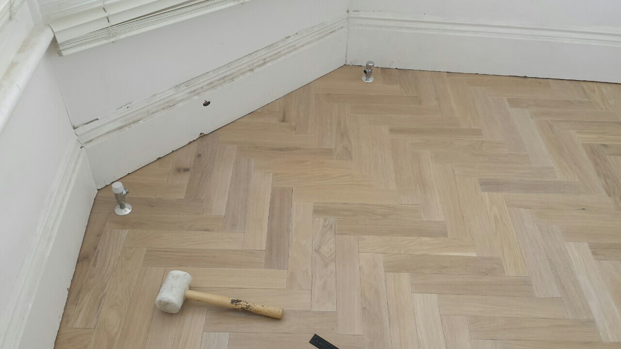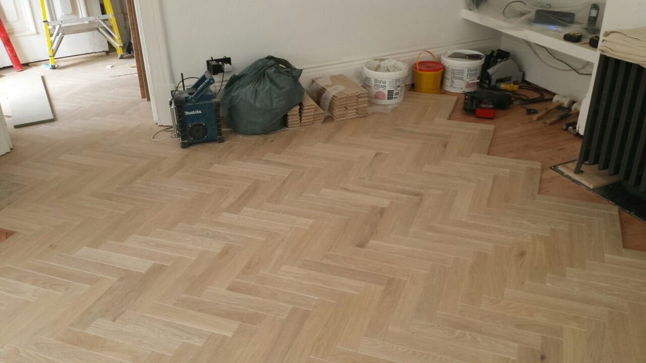 Brushed White in Herringbone Parquet 21mm x 70mm x 350mm Character Grade. This Victorian property required a complete refurbishment of the existing subfloor. Joists have been planed, checked, levelled or replaced where necessary. After a new structural 18mm plywood subfloor was installed, we were able to glue directly on top with the Herringbone Parquet. The original character features in the property are complimented beautifully with the traditional parquet flooring restoring this property to its original splendour.