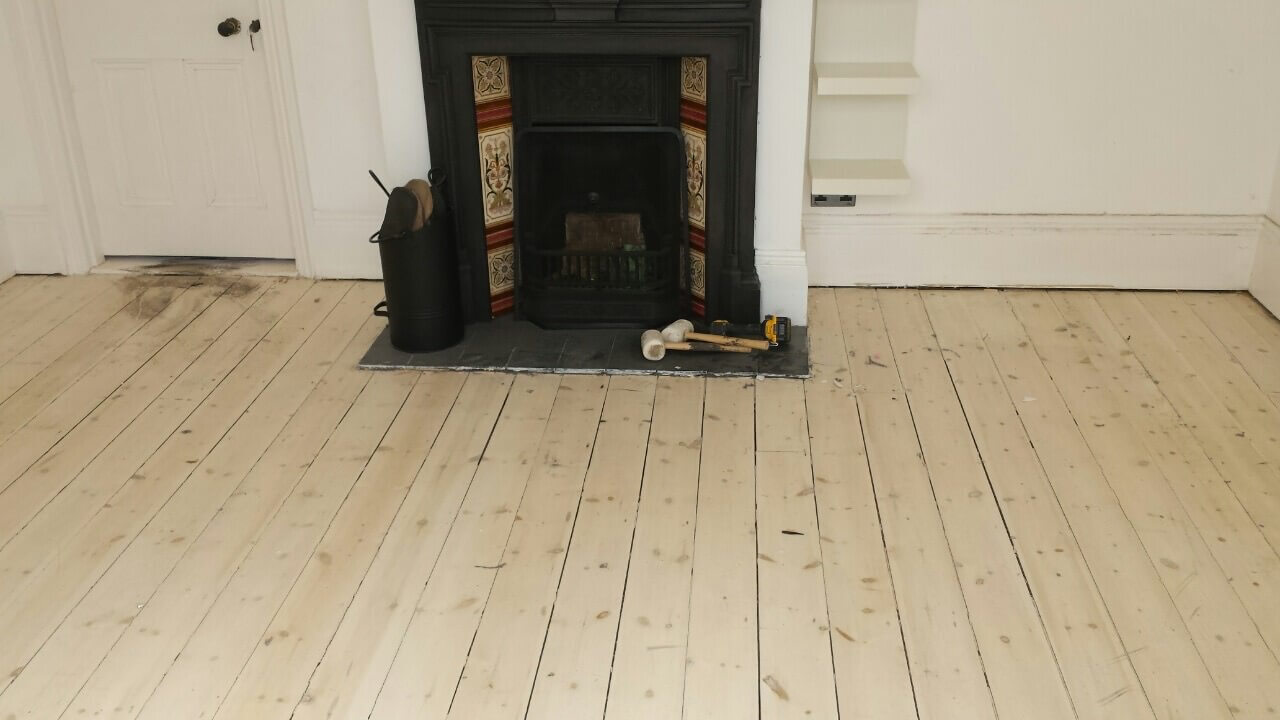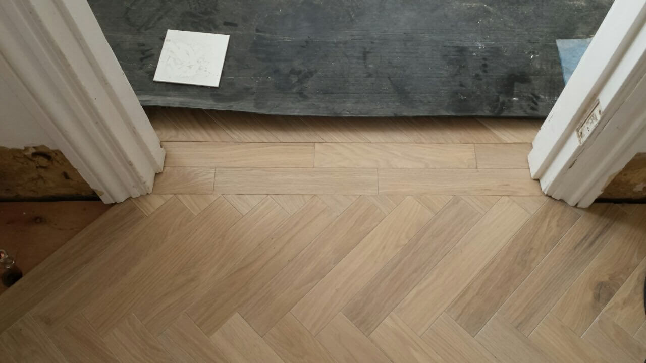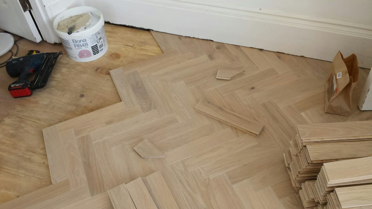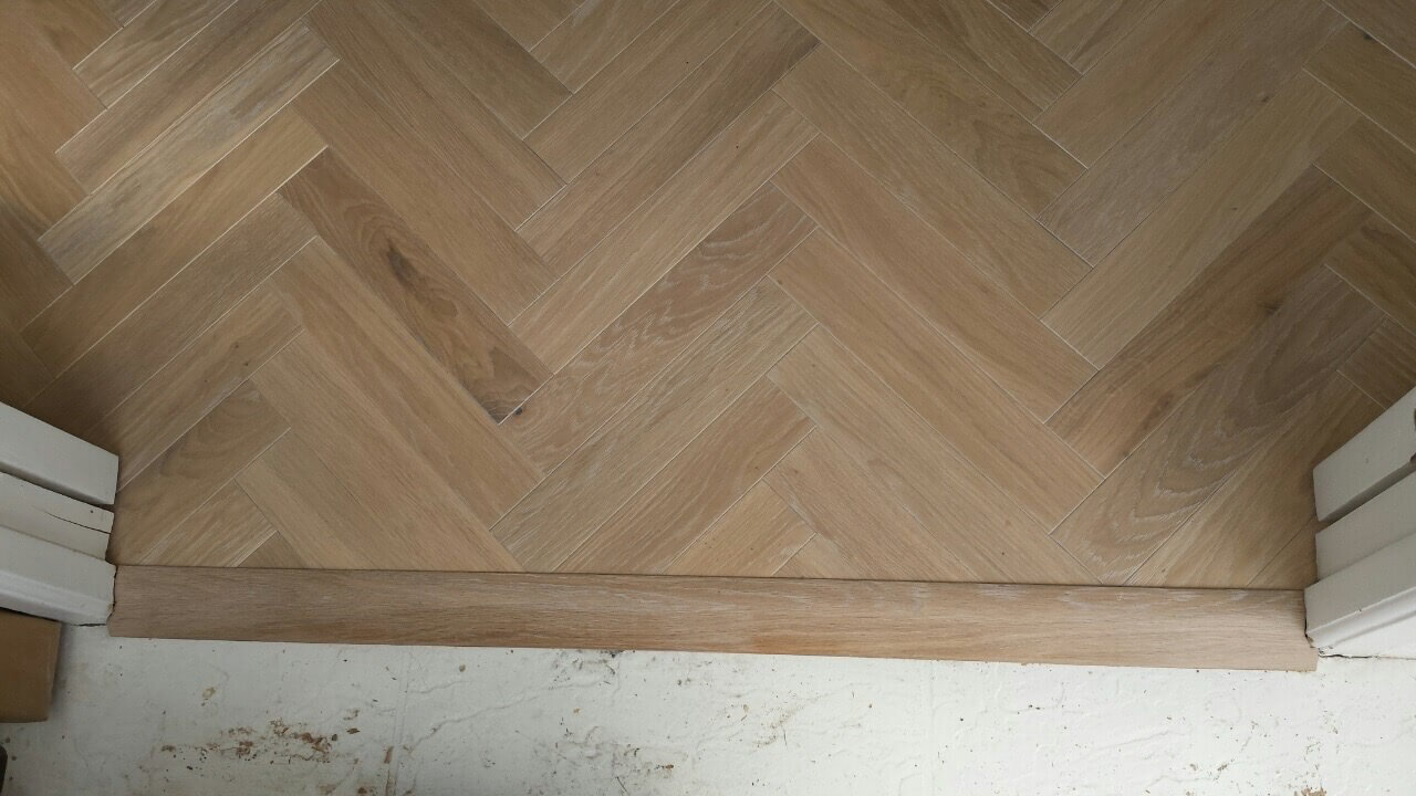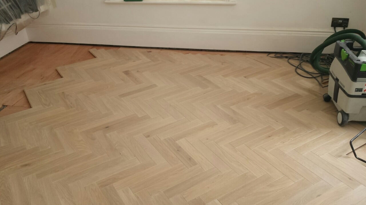 Brushed White in Herringbone Parquet 21mm x 70mm x 350mm Character Grade. This Victorian property required a complete refurbishment of the existing subfloor. Joists have been planed, checked, levelled or replaced where necessary. After a new structural 18mm plywood subfloor was installed, we were able to glue directly on top with the Herringbone Parquet. The original character features in the property are complimented beautifully with the traditional parquet flooring restoring this property to its original splendour.