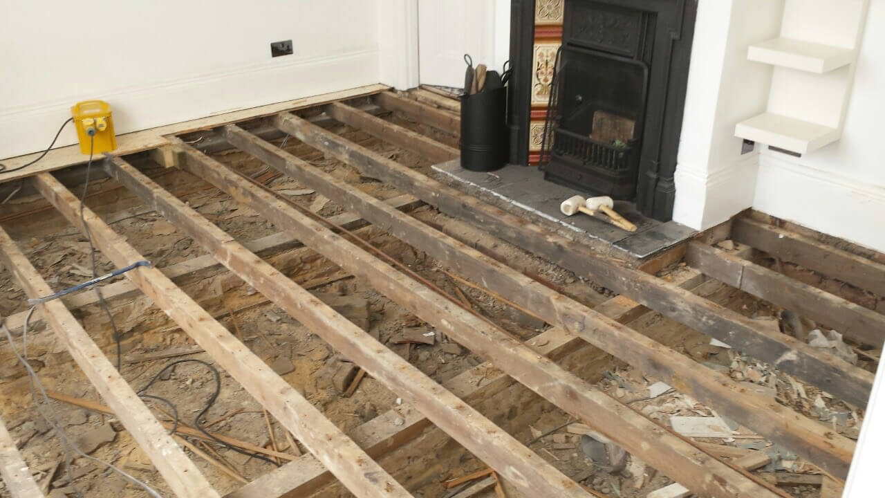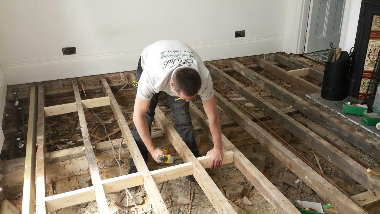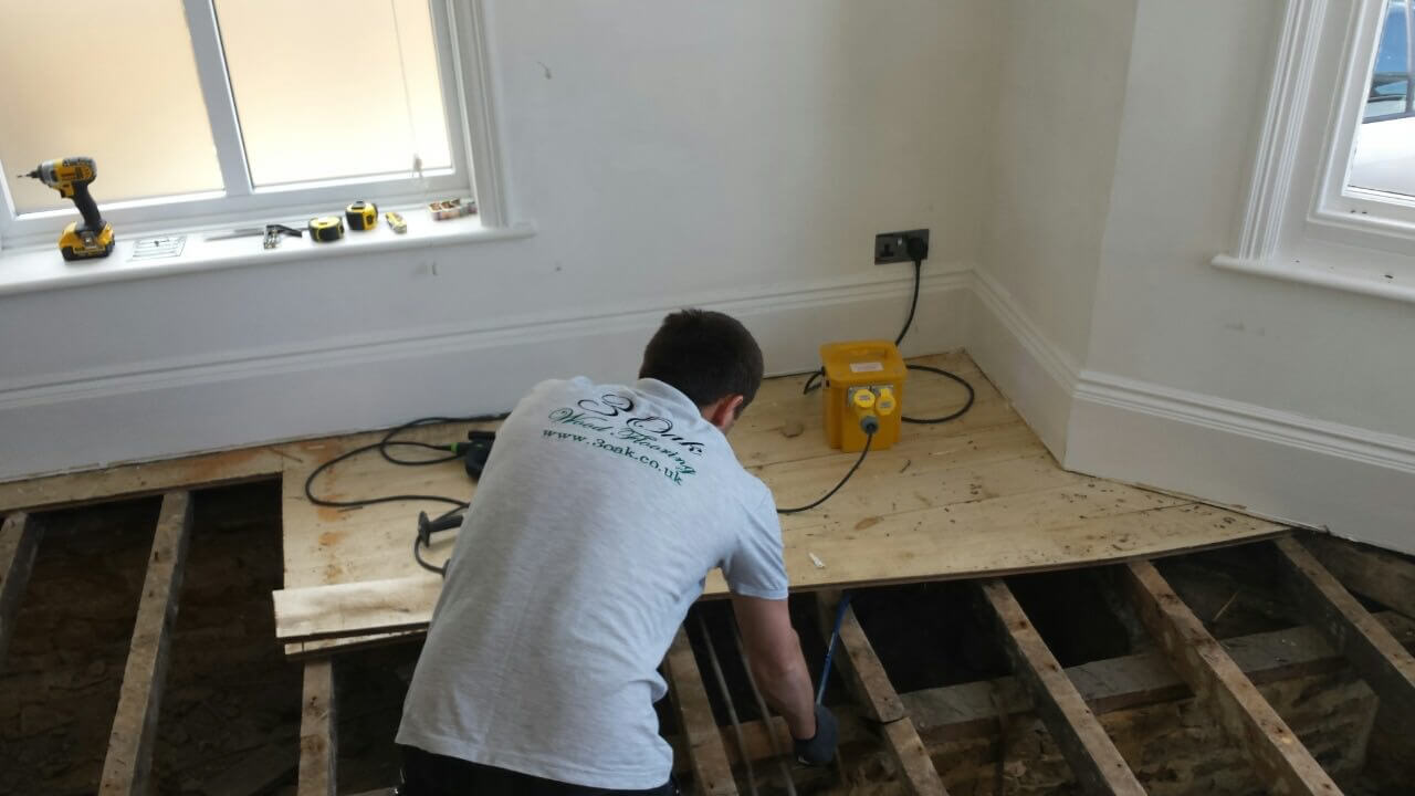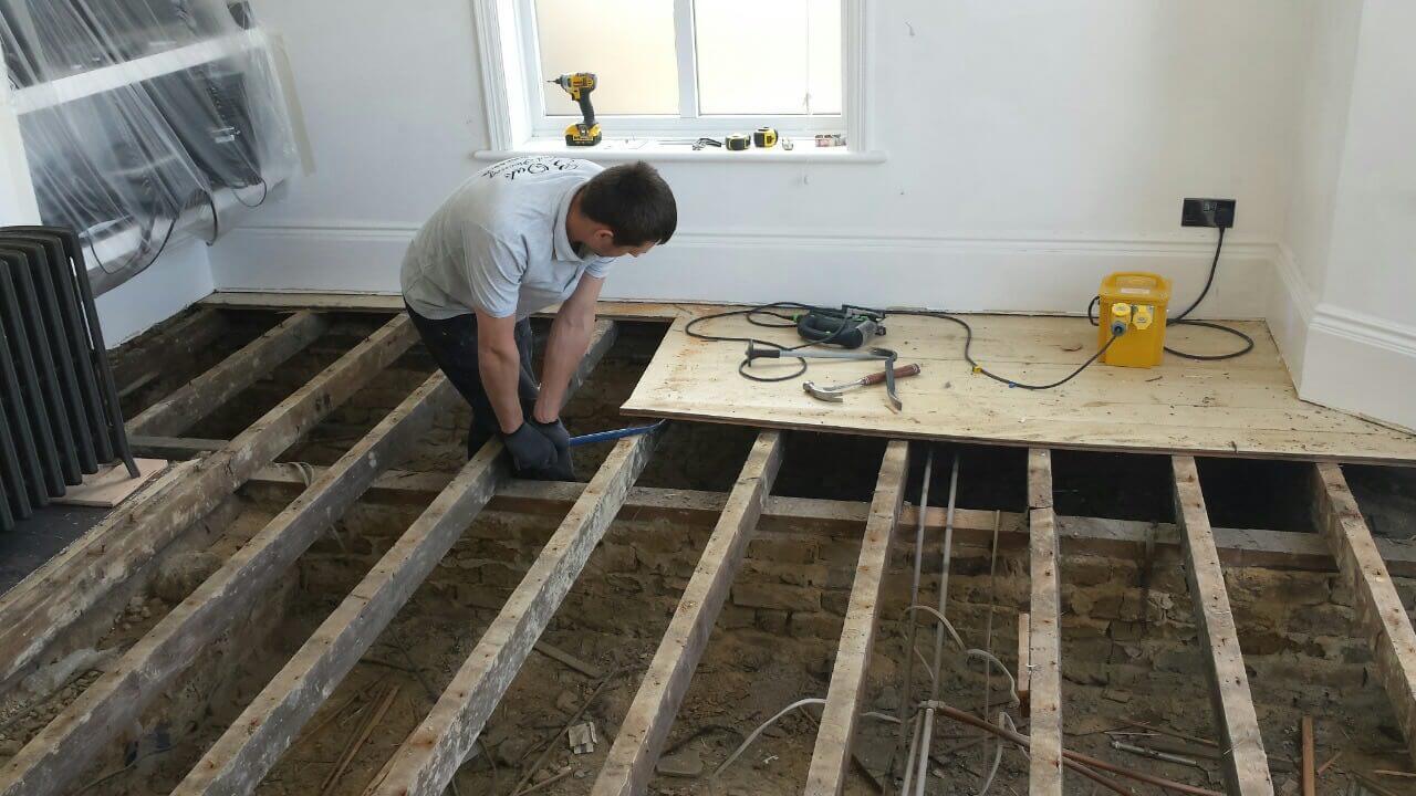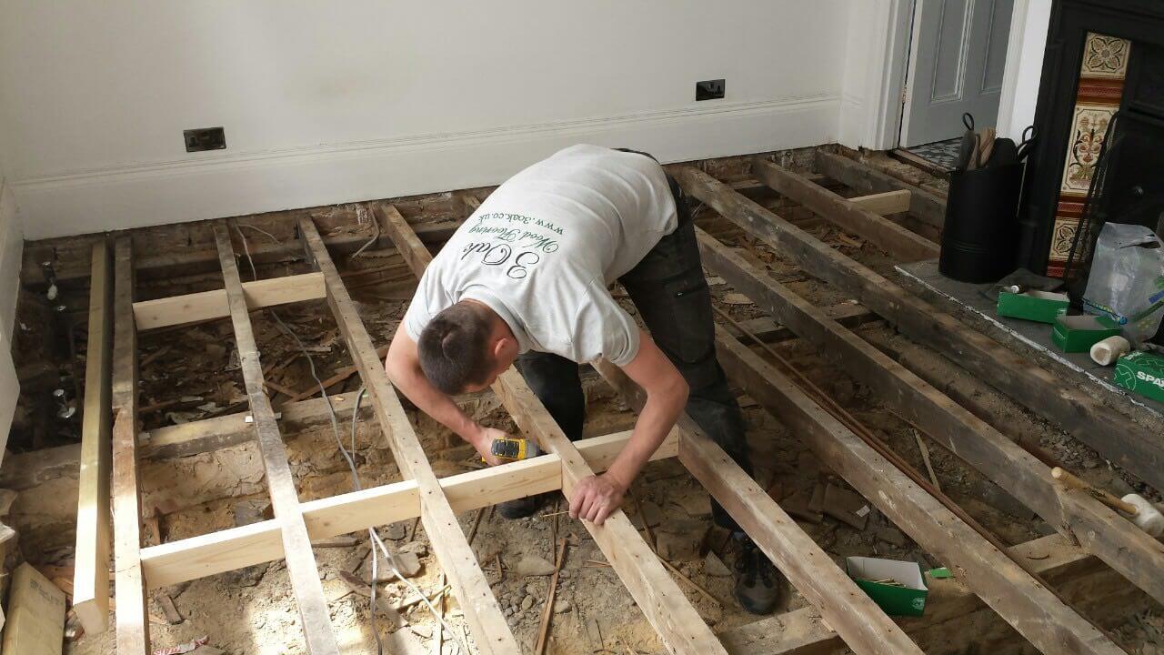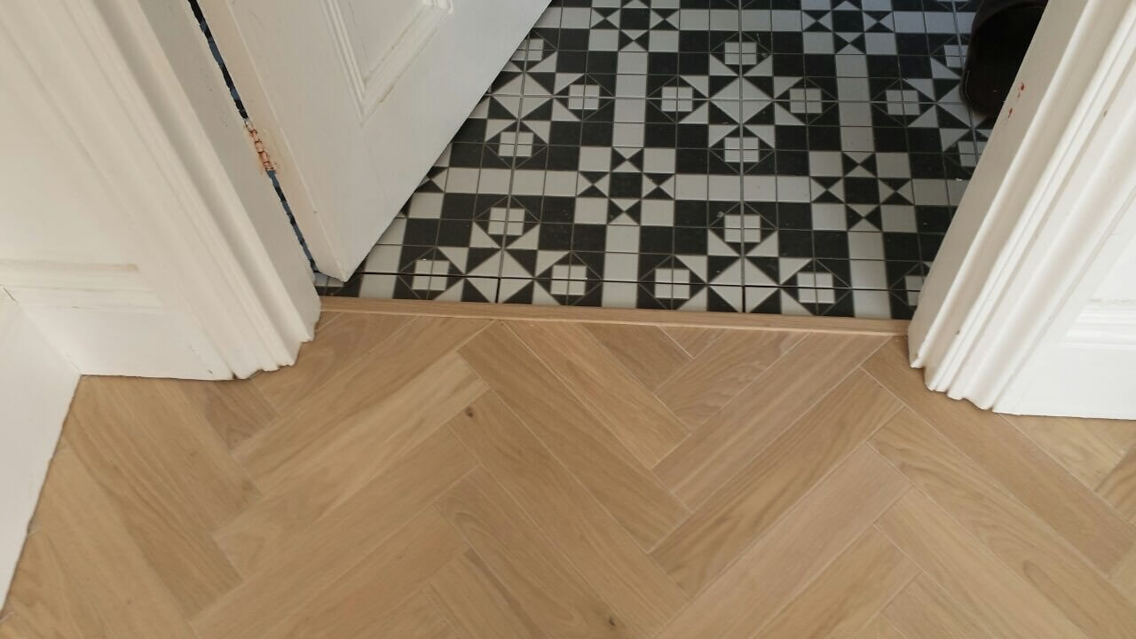 Brushed White in Herringbone Parquet 21mm x 70mm x 350mm Character Grade. This Victorian property required a complete refurbishment of the existing subfloor. Joists have been planed, checked, levelled or replaced where necessary. After a new structural 18mm plywood subfloor was installed, we were able to glue directly on top with the Herringbone Parquet. The original character features in the property are complimented beautifully with the traditional parquet flooring restoring this property to its original splendour.
