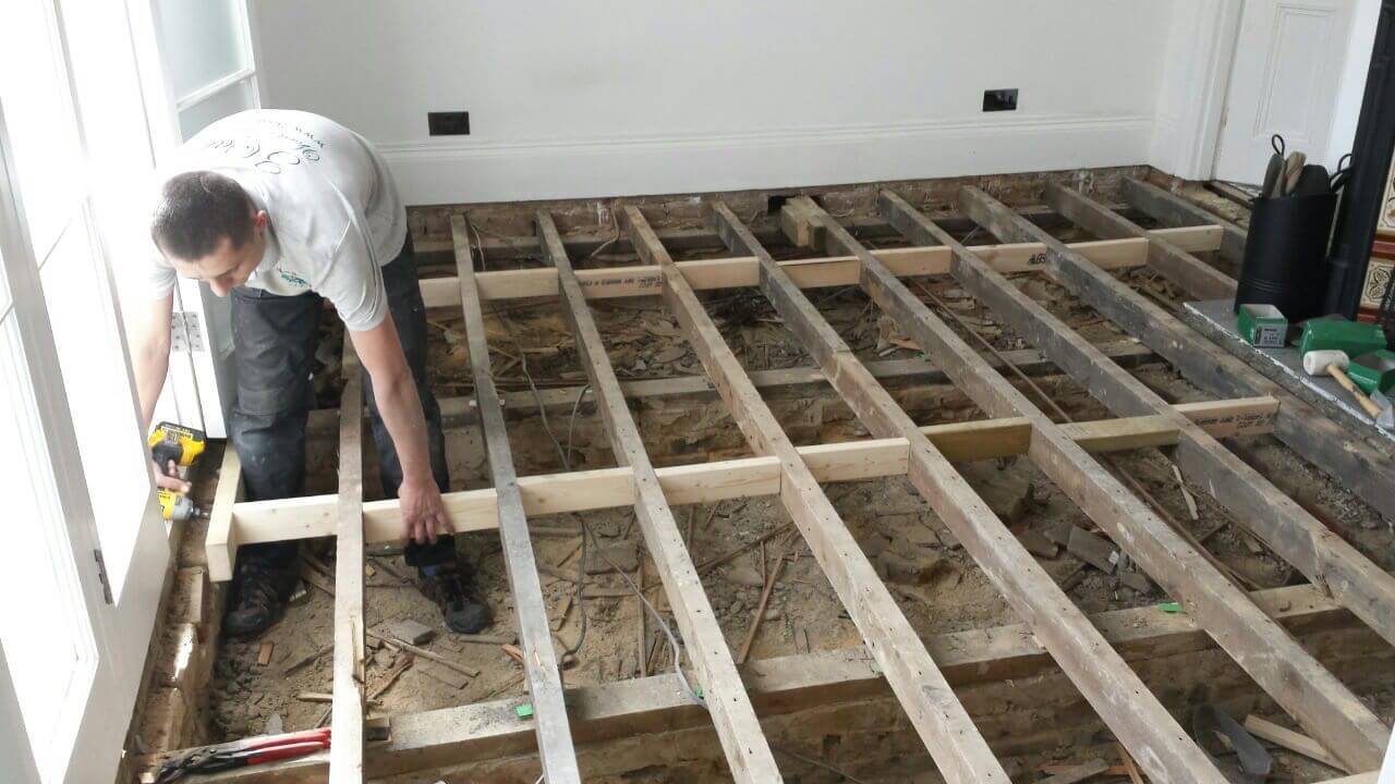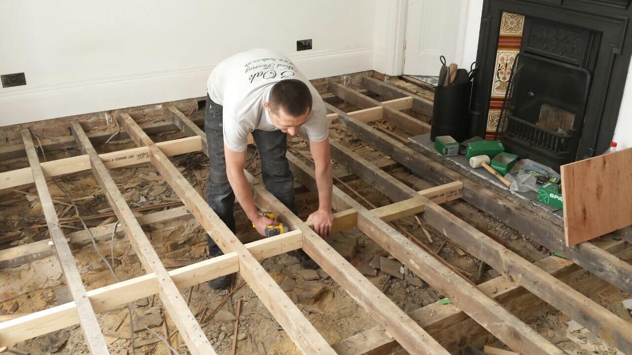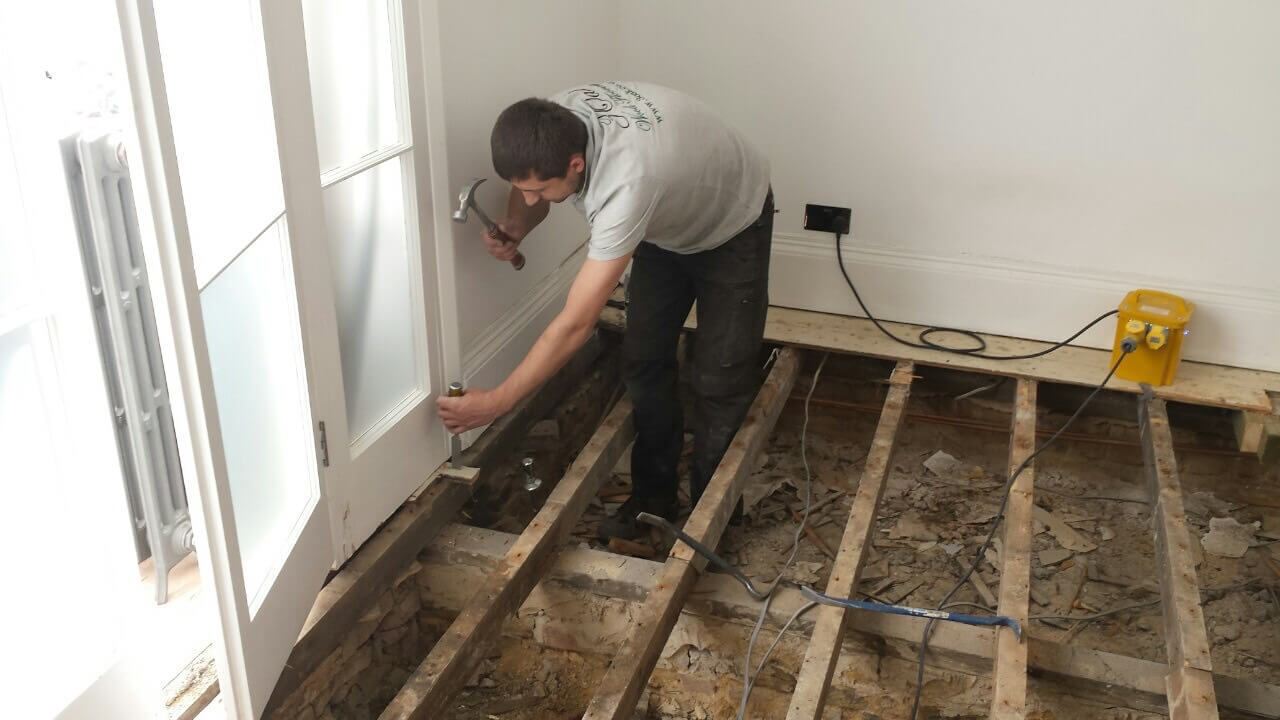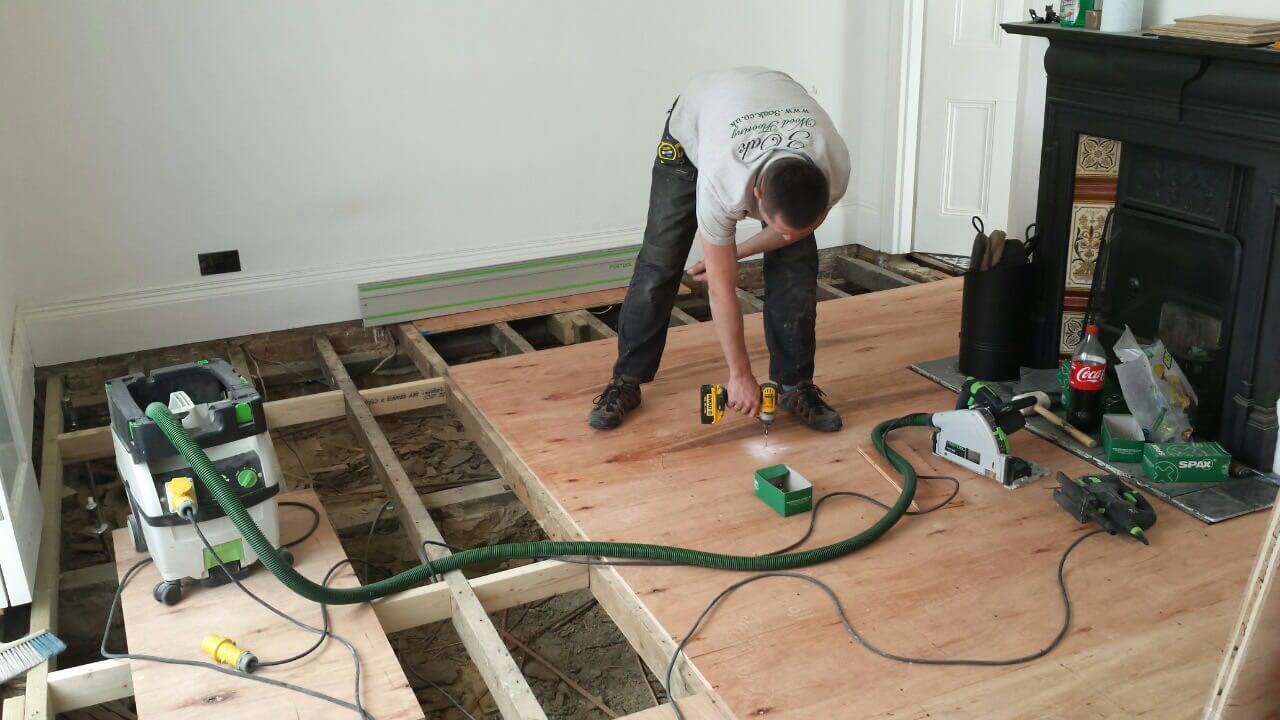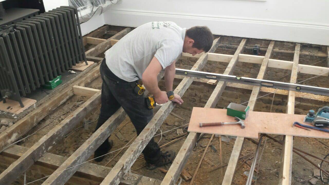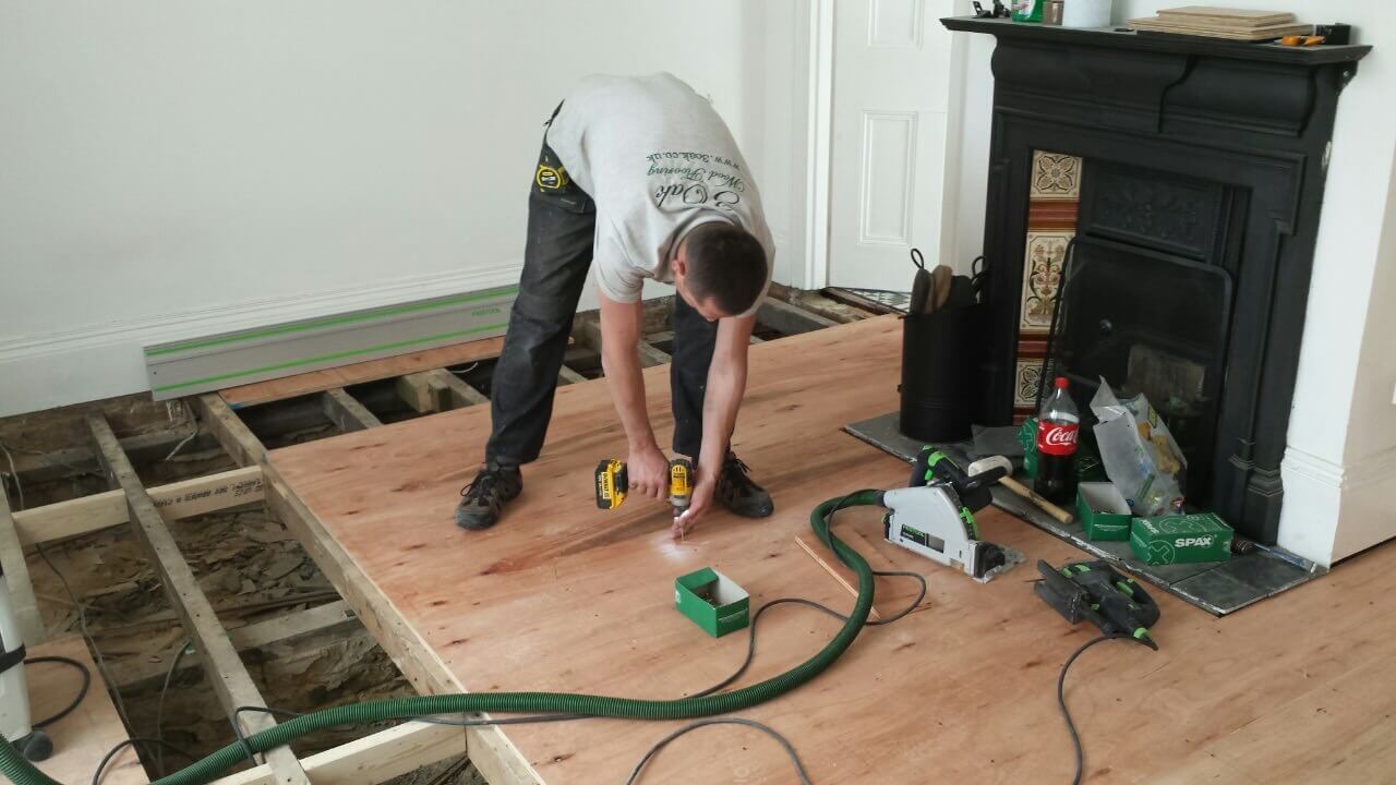 Brushed White in Herringbone Parquet 21mm x 70mm x 350mm Character Grade. This Victorian property required a complete refurbishment of the existing subfloor. Joists have been planed, checked, levelled or replaced where necessary. After a new structural 18mm plywood subfloor was installed, we were able to glue directly on top with the Herringbone Parquet. The original character features in the property are complimented beautifully with the traditional parquet flooring restoring this property to its original splendour.