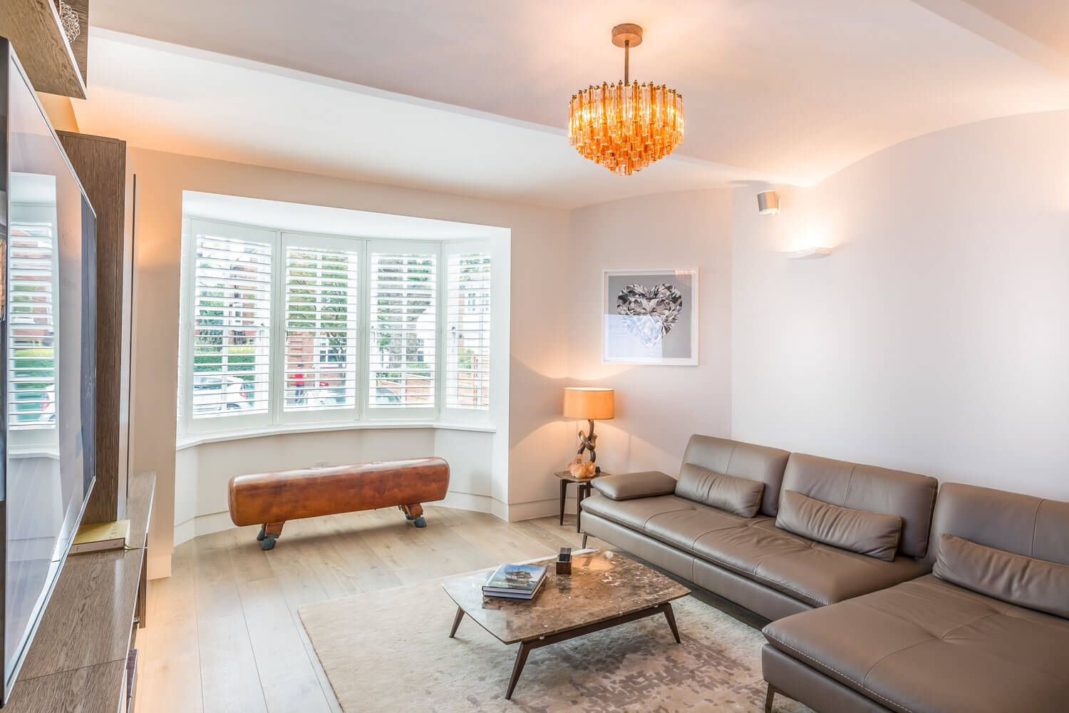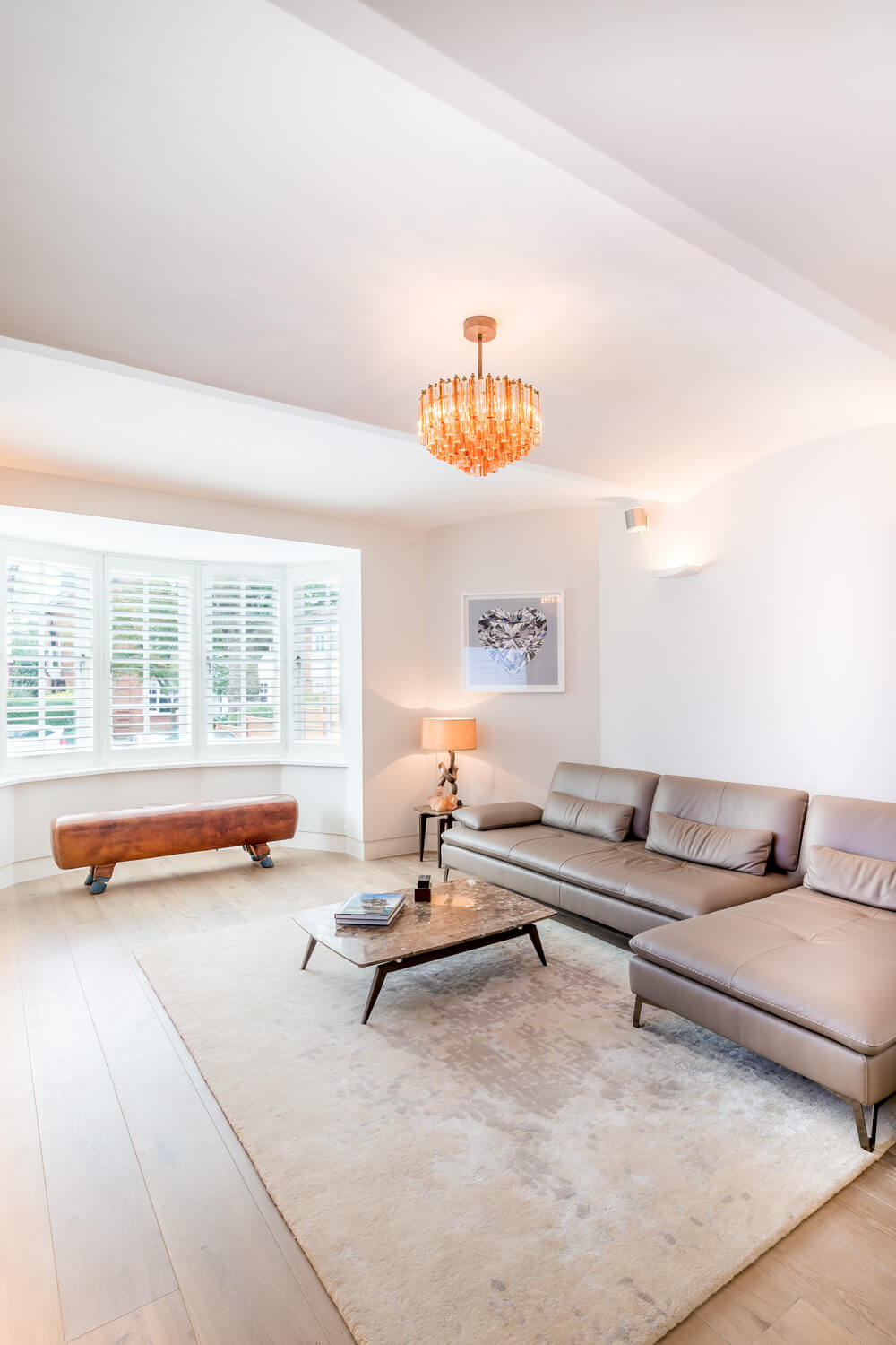 The flooring installation began with careful subfloor preparation to ensure durability and a flawless finish. The Bespoke Slate Grey Engineered Oak Flooring was selected for its character-grade textured grain, providing a modern yet natural look. The flooring was installed throughout the home, maintaining consistency and flow between spaces. Key areas, such as the staircase with its hidden storage, were integrated seamlessly with the flooring. Contrasts with glass balustrades, recessed lighting, and white tones in the décor further elevated the overall design. The flooring was paired with high-spec open-plan kitchen fixtures and modern furniture to create a cohesive, luxurious living environment.