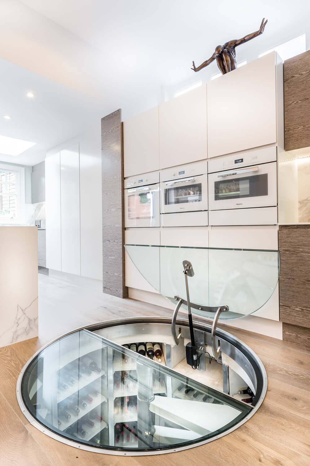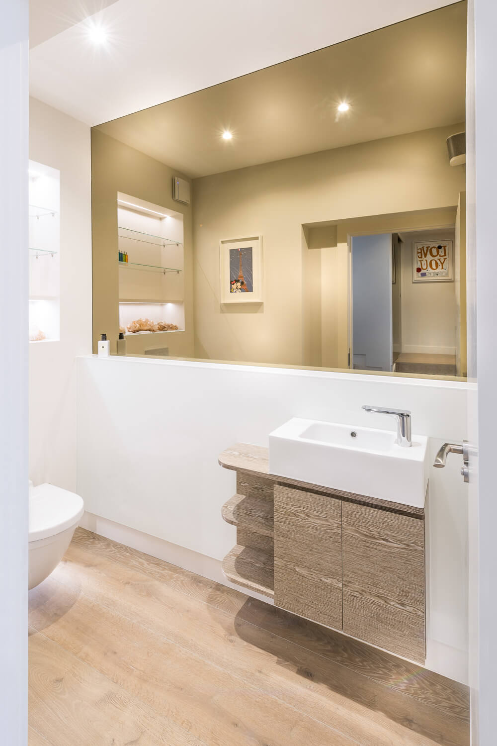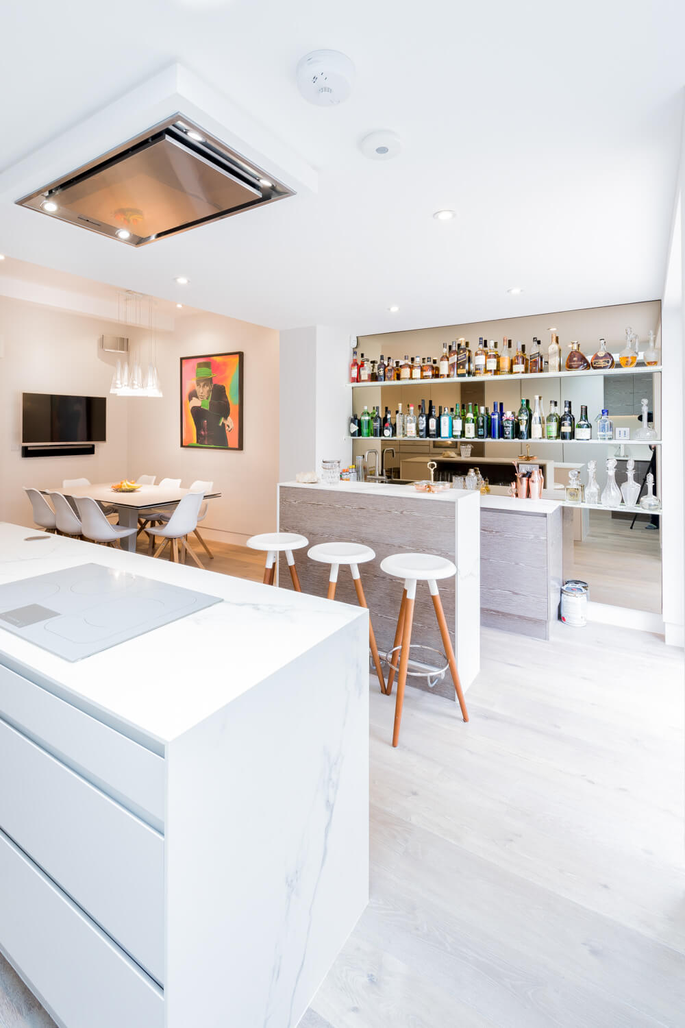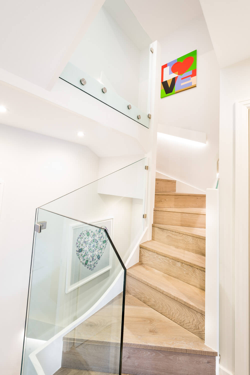 The Hampstead Residence features a contemporary interior design brought to life with Bespoke Slate Grey Character Grade Engineered Oak Flooring. This flooring, with its rich textured grain, creates a perfect foundation for the home’s modern aesthetic. Combining glass elements, white tones, and high-spec fixtures, the design achieves a seamless blend of functionality and luxury across key living areas, including the staircase, living room, bathroom, and open-plan kitchen and dining space.