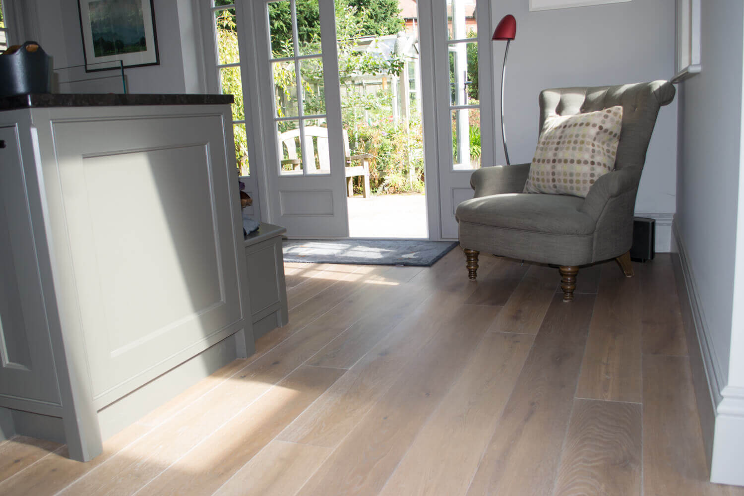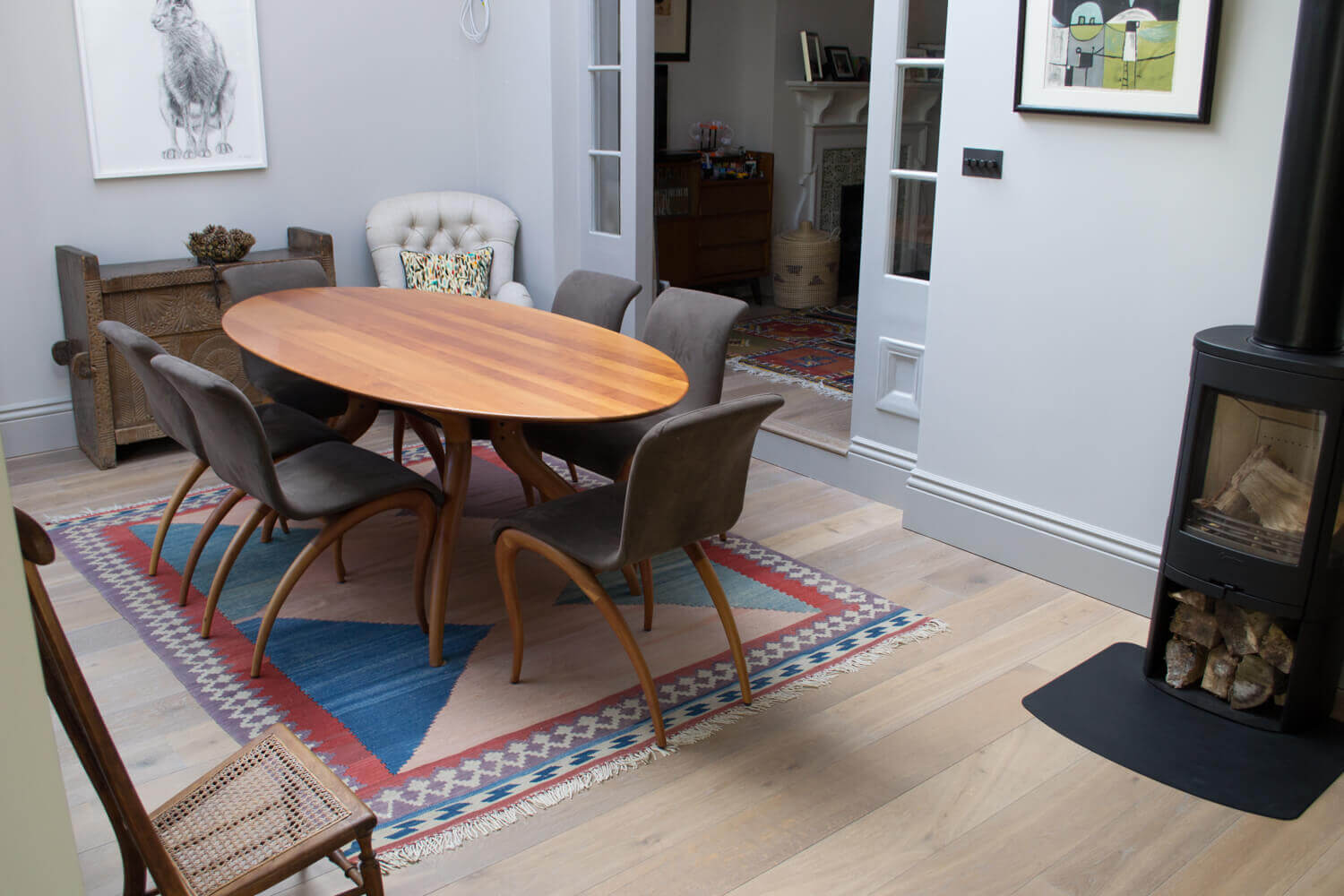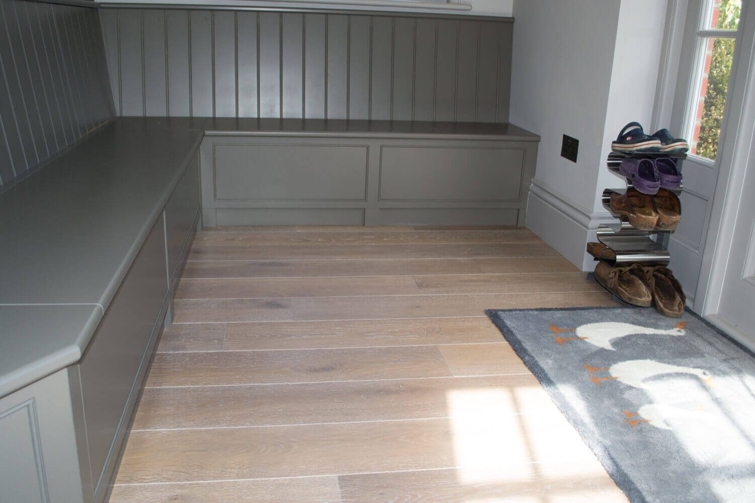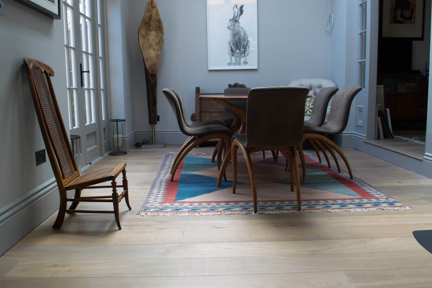 Marlborough Crescent – 21mm x 180mm – Character Grade – Brushed Fumed Bespoke Finish. Engineered Oak is suitable for use with underfloor heating. This bespoke fumed floor has warm notes of Oak with subtle hints of grey that match perfectly with the classic décor. A fantastic result was achieved. The use of Oak flooring with traditional style furniture and neutral colour schemes bring a lot of character and charm to this project.