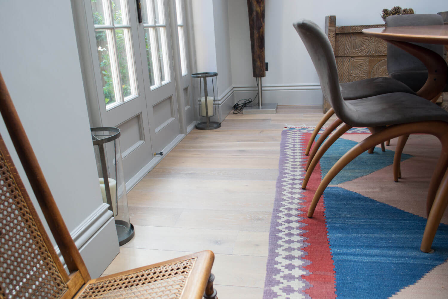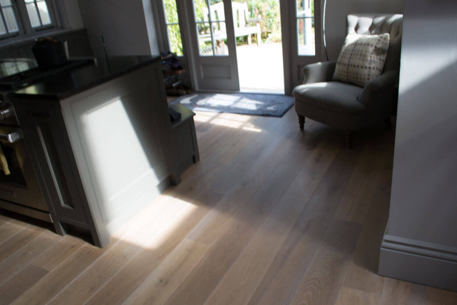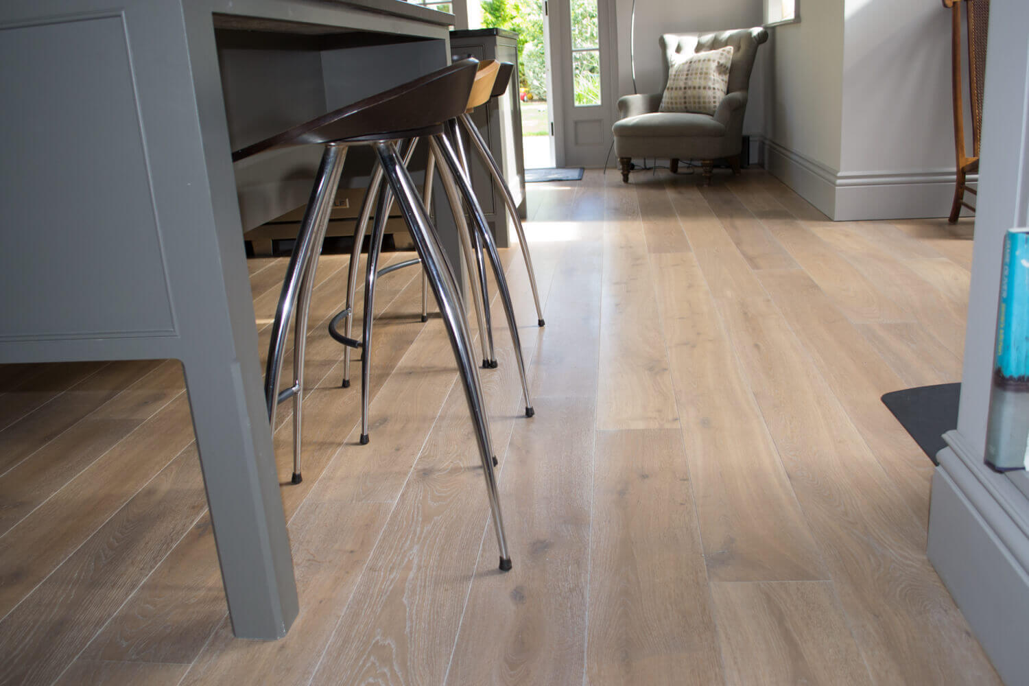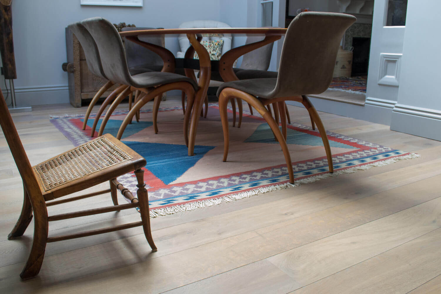 Marlborough Crescent – 21mm x 180mm – Character Grade – Brushed Fumed Bespoke Finish. Engineered Oak is suitable for use with underfloor heating. This bespoke fumed floor has warm notes of Oak with subtle hints of grey that match perfectly with the classic décor. A fantastic result was achieved. The use of Oak flooring with traditional style furniture and neutral colour schemes bring a lot of character and charm to this project.