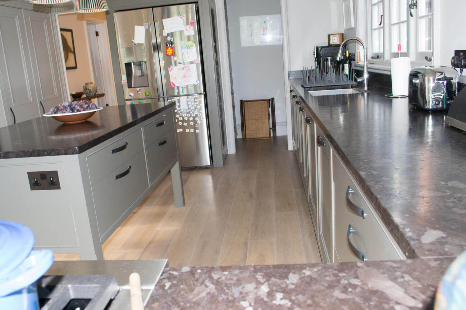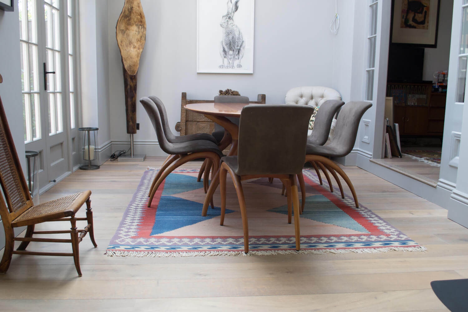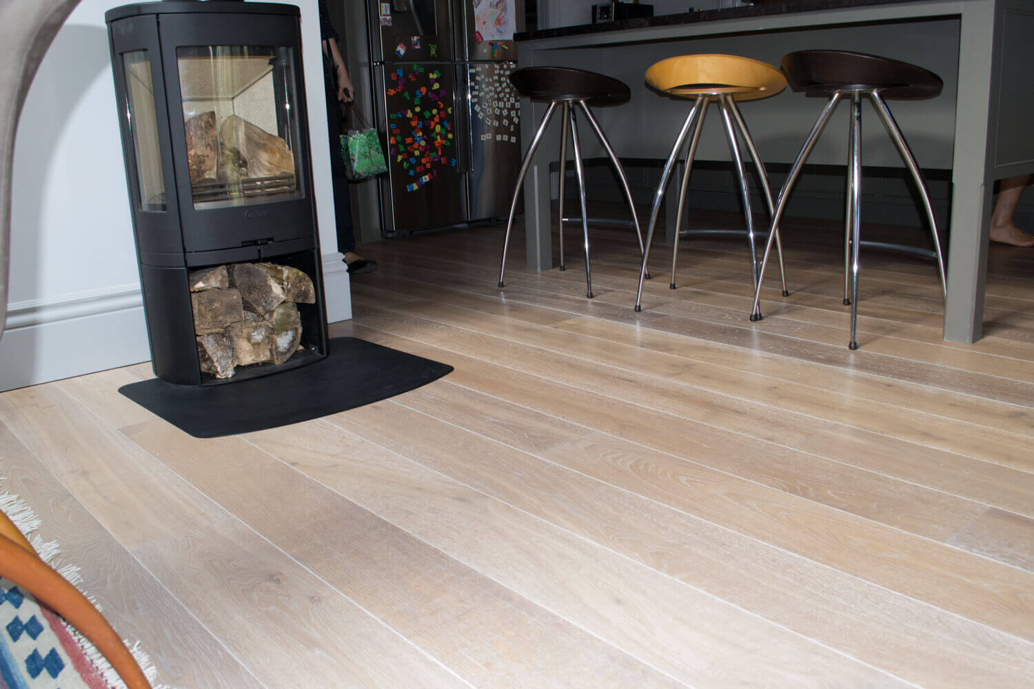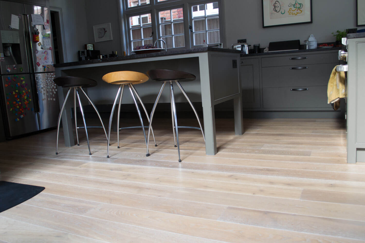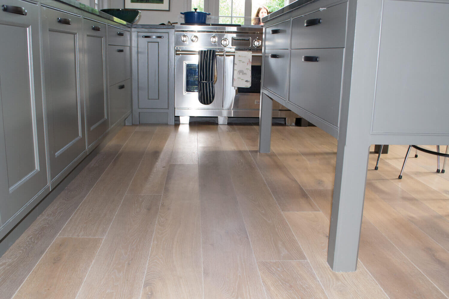 Marlborough Crescent – 21mm x 180mm – Character Grade – Brushed Fumed Bespoke Finish. Engineered Oak is suitable for use with underfloor heating. This bespoke fumed floor has warm notes of Oak with subtle hints of grey that match perfectly with the classic décor. A fantastic result was achieved. The use of Oak flooring with traditional style furniture and neutral colour schemes bring a lot of character and charm to this project.