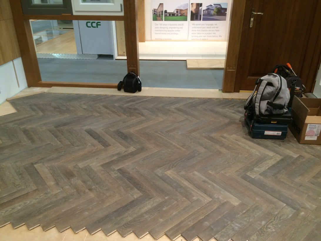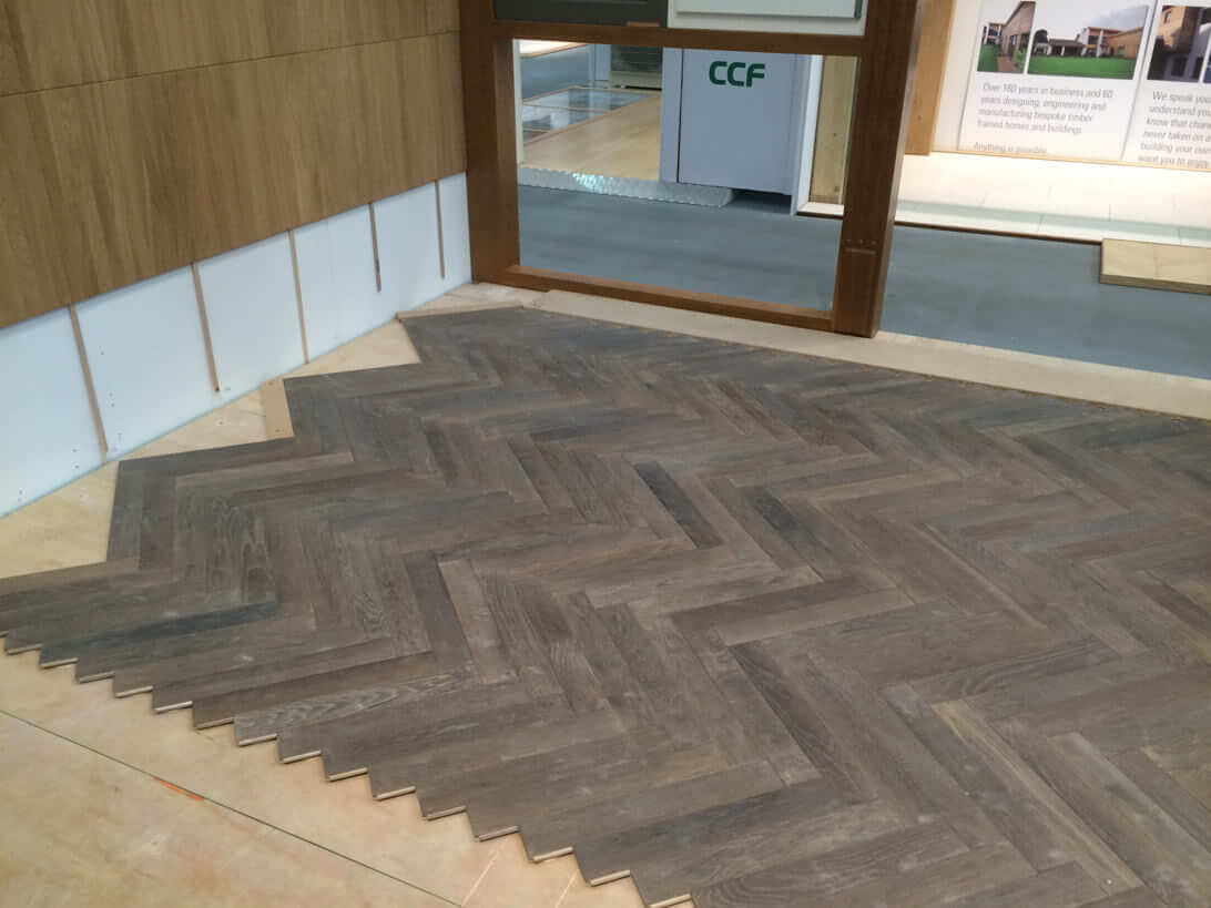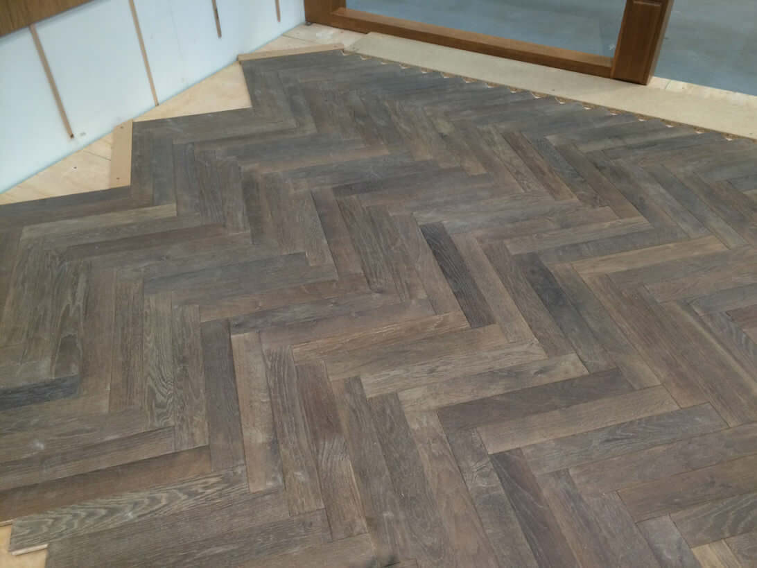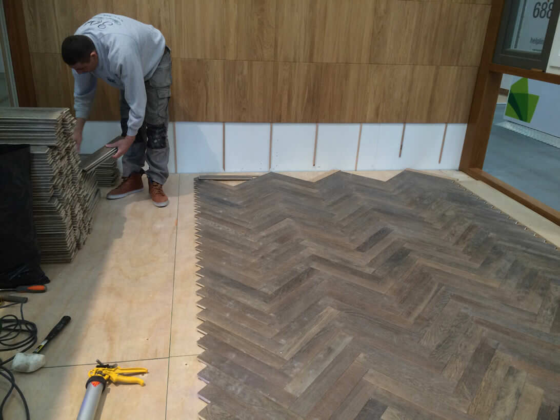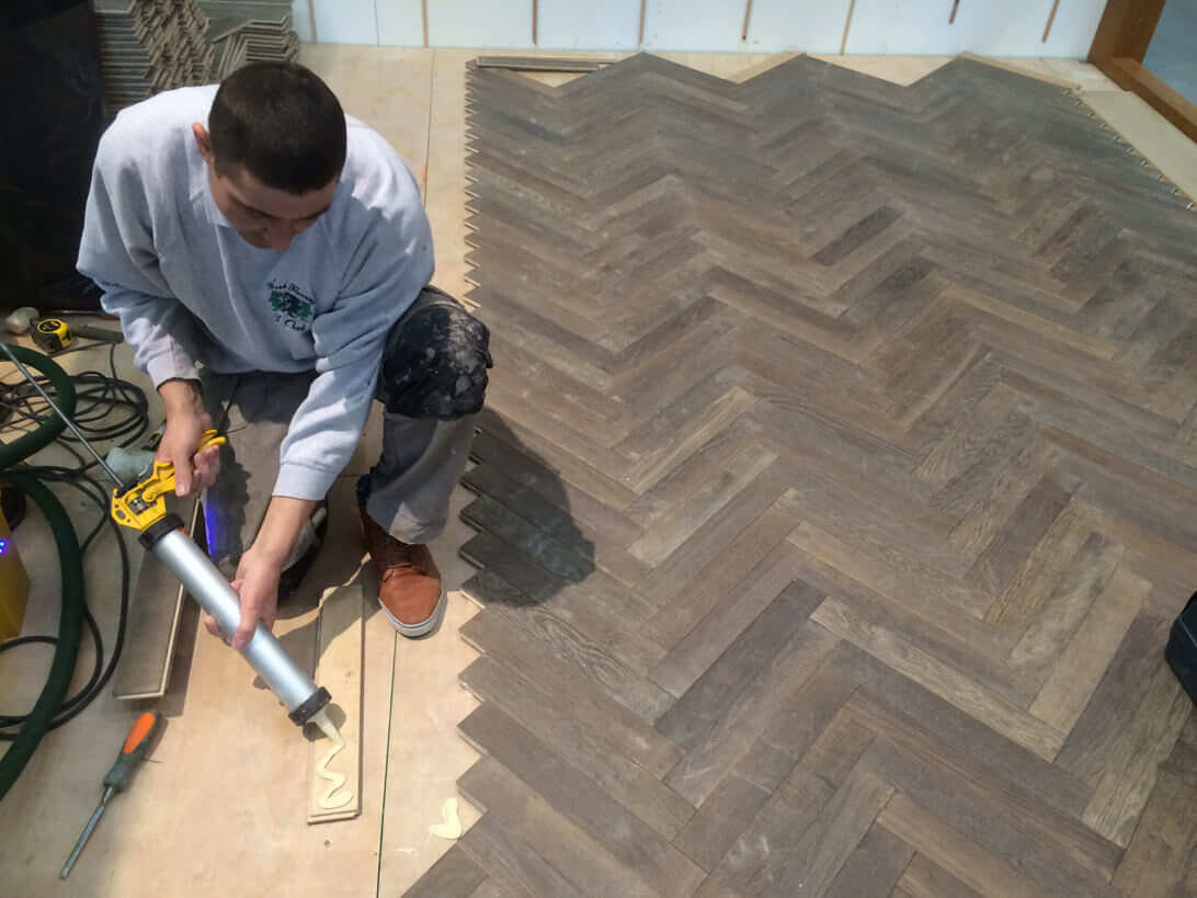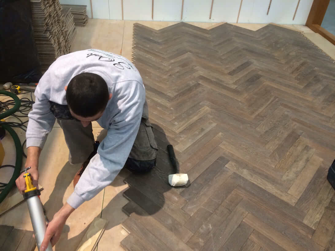 Our showroom at the National Self Build & Renovation centre is nearing completion and we are especially happy with the reclaimed Parquet floor, pictured here being installed. It’s a new floor but the subtle distressing makes it look just like reclaimed parquet flooring of triple the price. We’ll be sure to put his one into regular production as soon as possible.