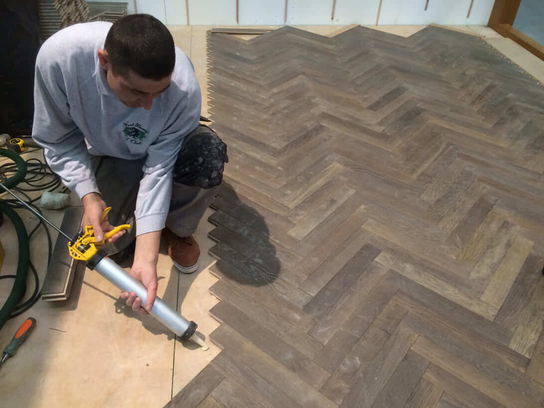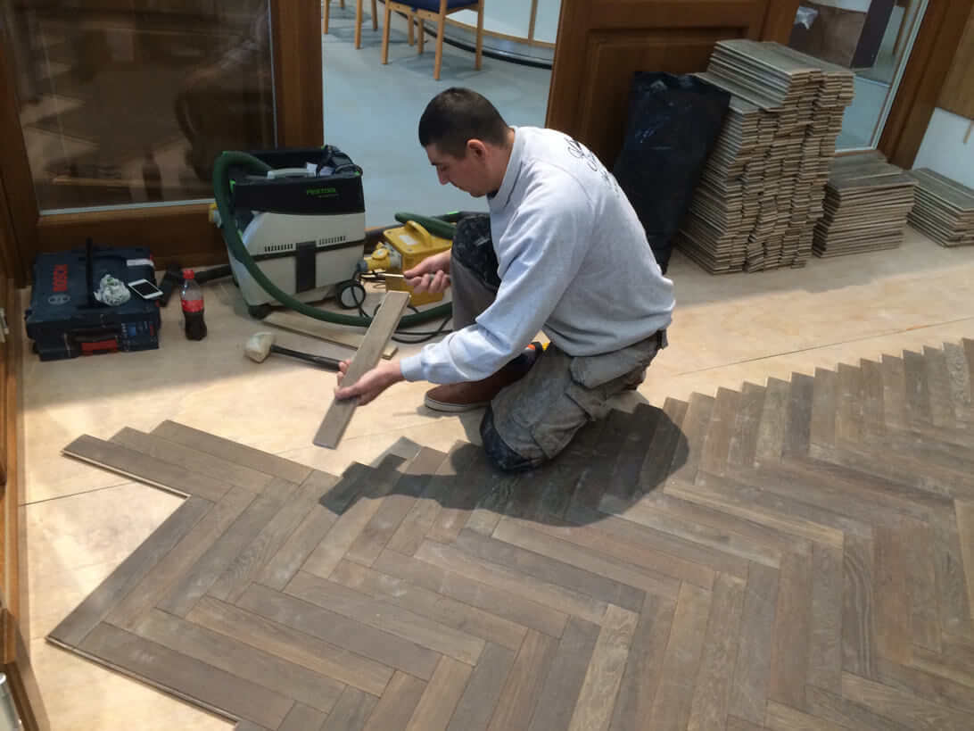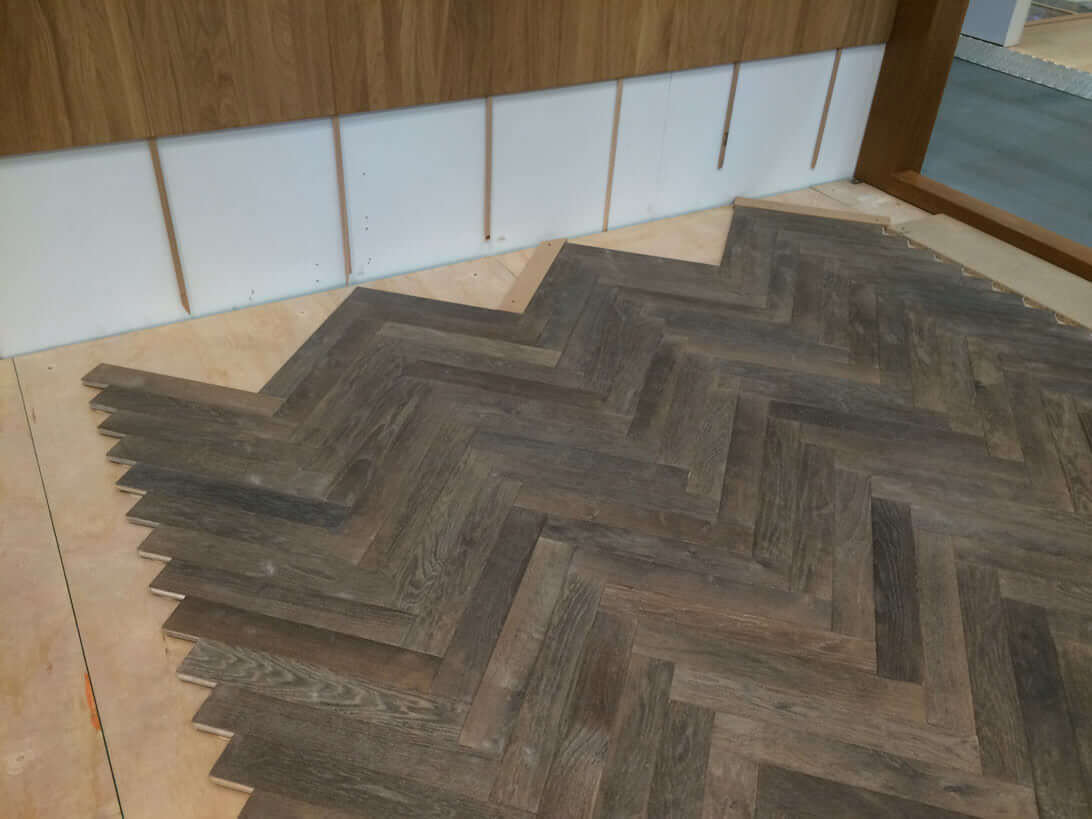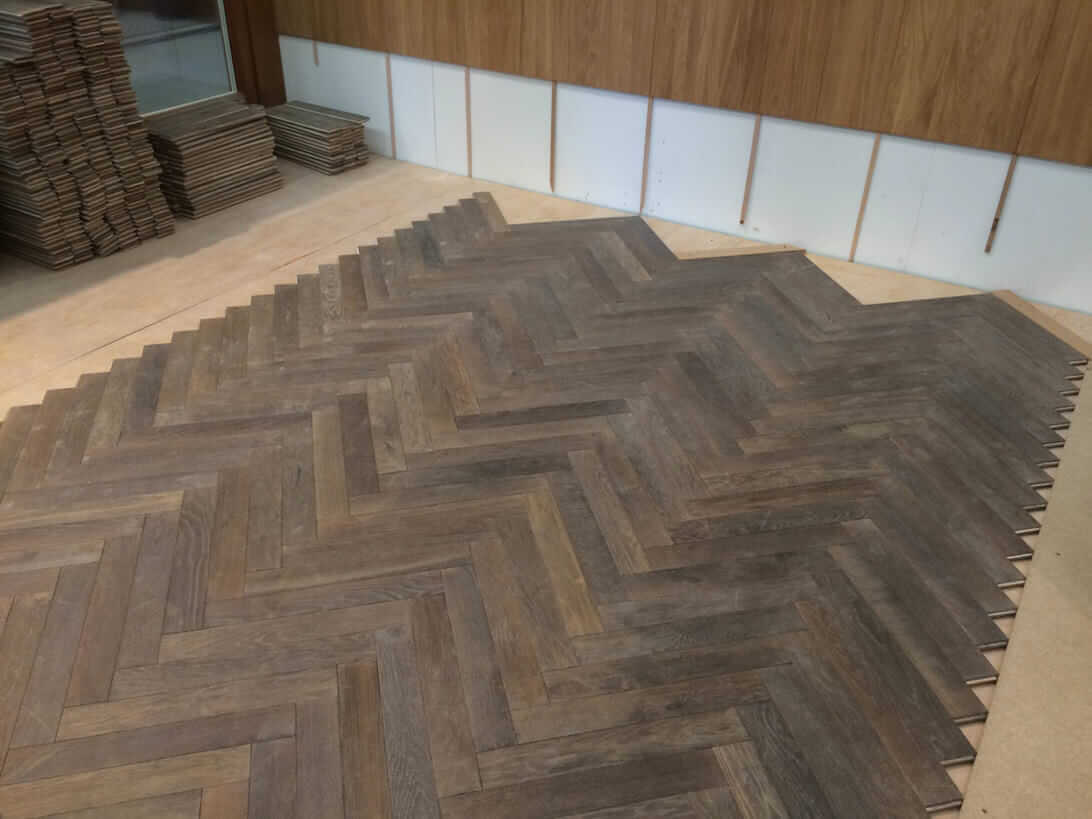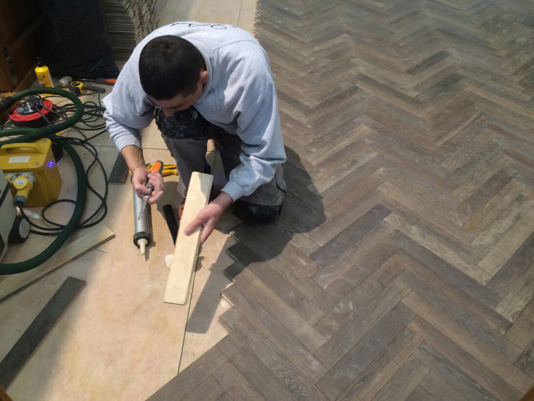 Our showroom at the National Self Build & Renovation centre is nearing completion and we are especially happy with the reclaimed Parquet floor, pictured here being installed. It’s a new floor but the subtle distressing makes it look just like reclaimed parquet flooring of triple the price. We’ll be sure to put his one into regular production as soon as possible.