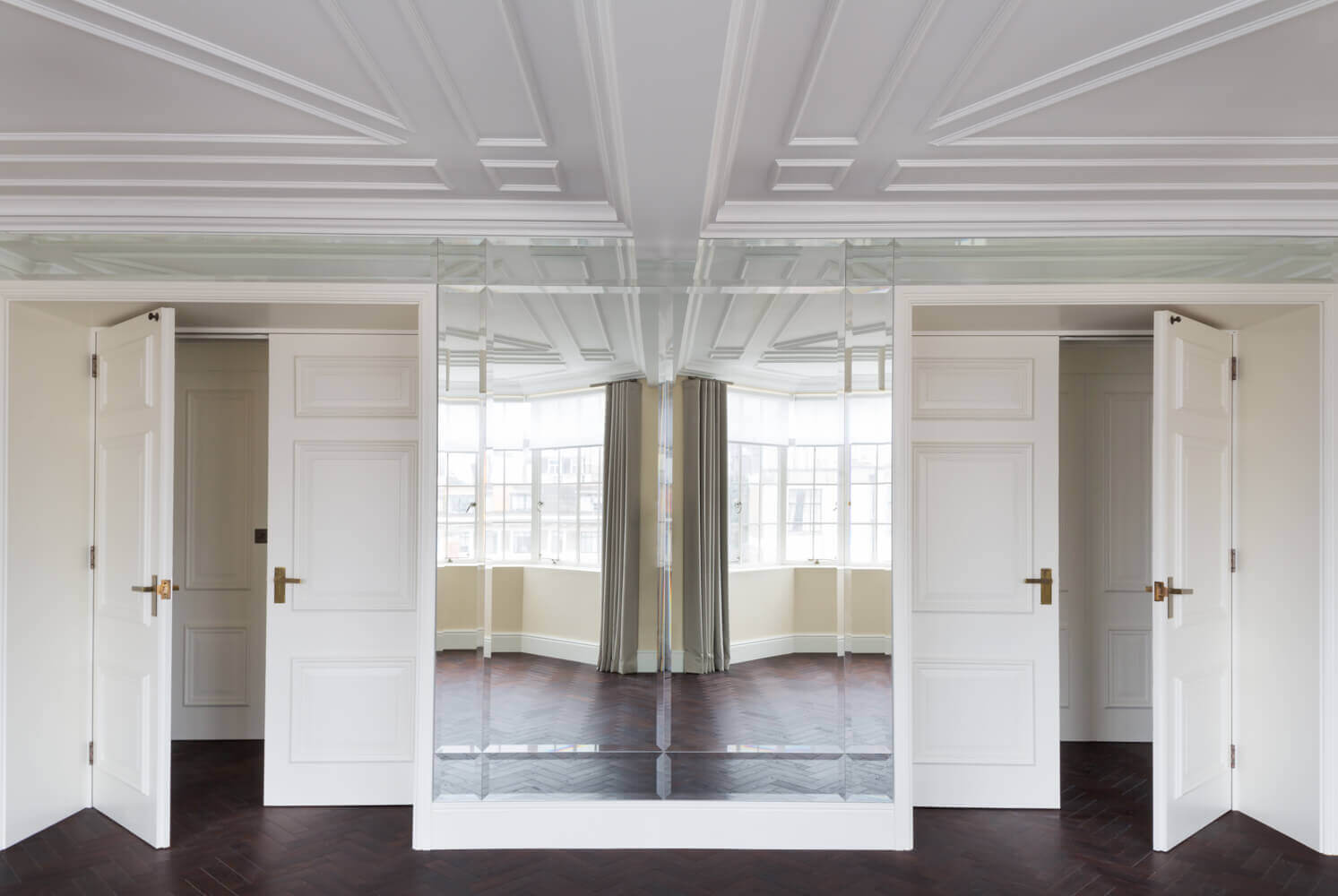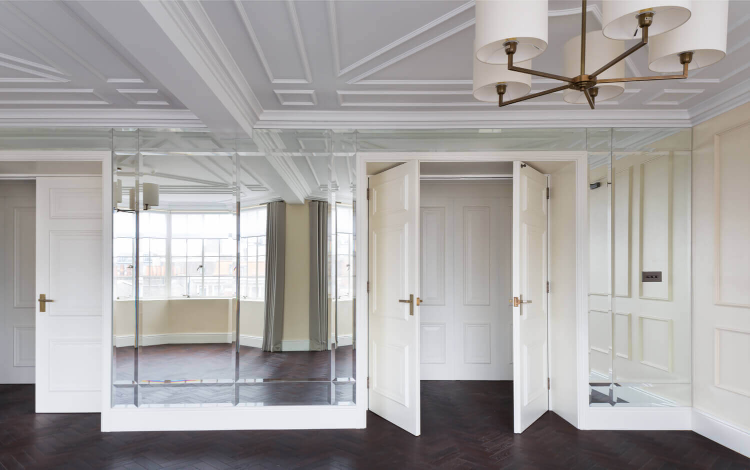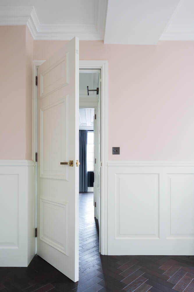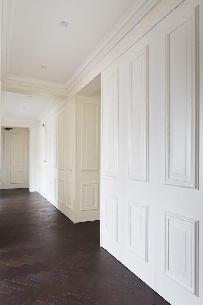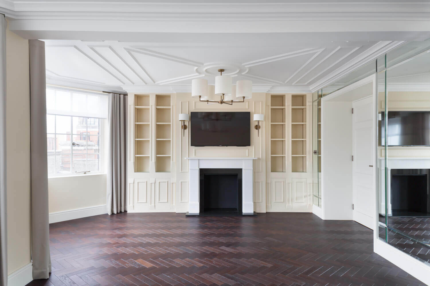 30 Day Fumed Engineered Oak in Herringbone Prime Grade – Dimensions: 21mm x 80mm x 300mm. This traditional “Victorian” sized Parquet is a perfect fit for this 19th century period property in Central London. The dark parquet is beautifully contrast with the white walls. This works elegantly with the stylish design and original features.