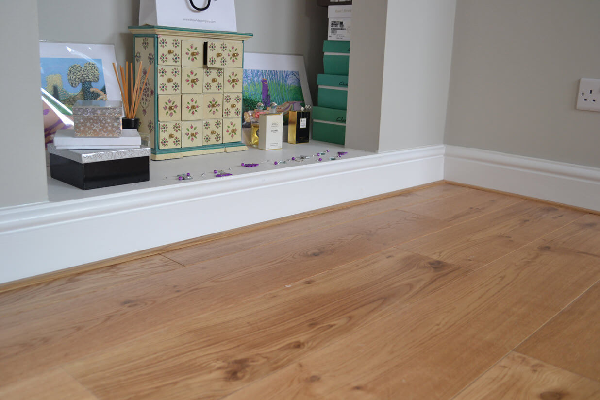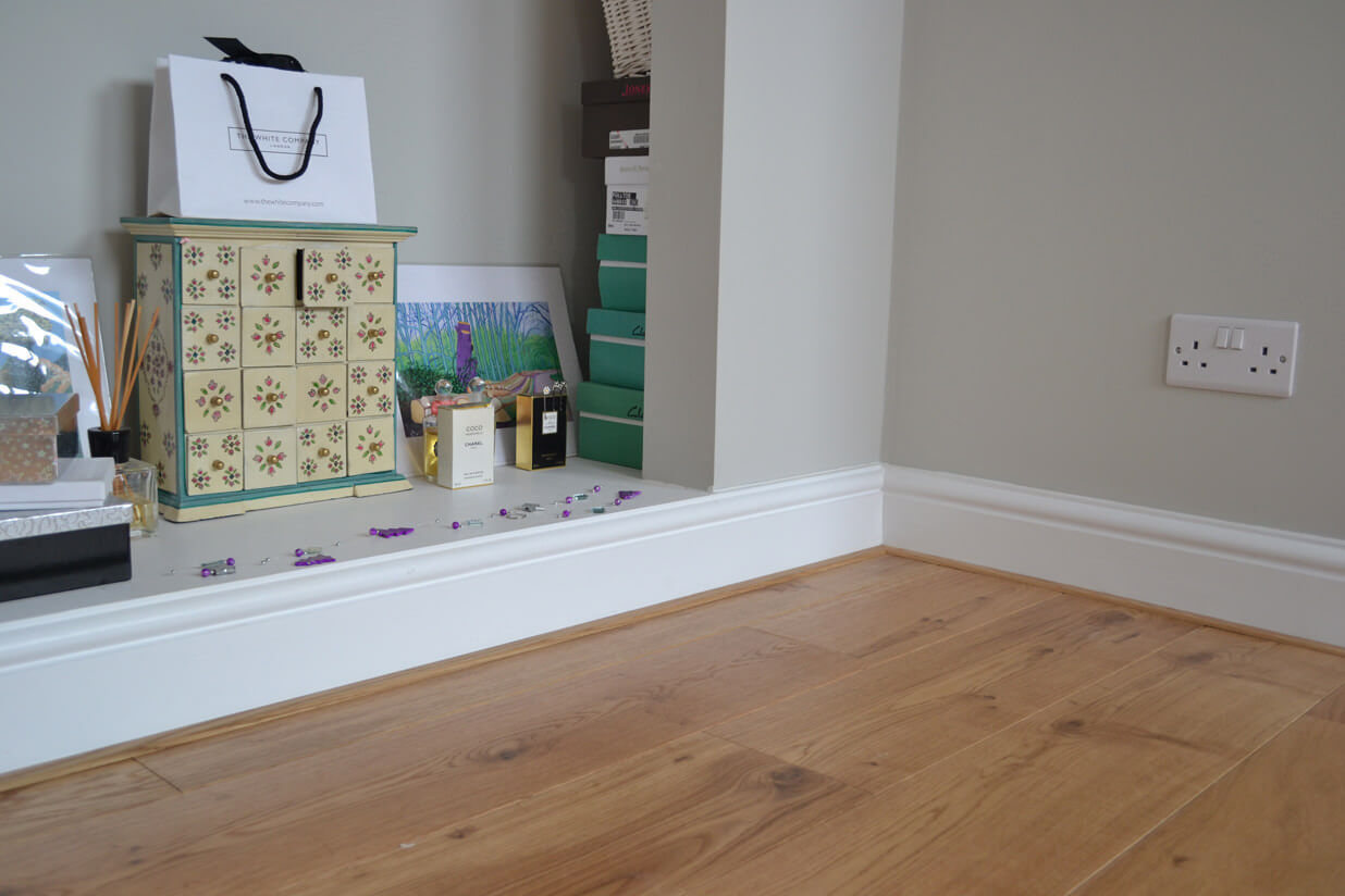 The skirting’s on this project were already newly installed and decorated so removal of these was not an option, instead we used a solid oak flat bead which was then finished with the same Osmo oil, allowing it to blend in with the floor.