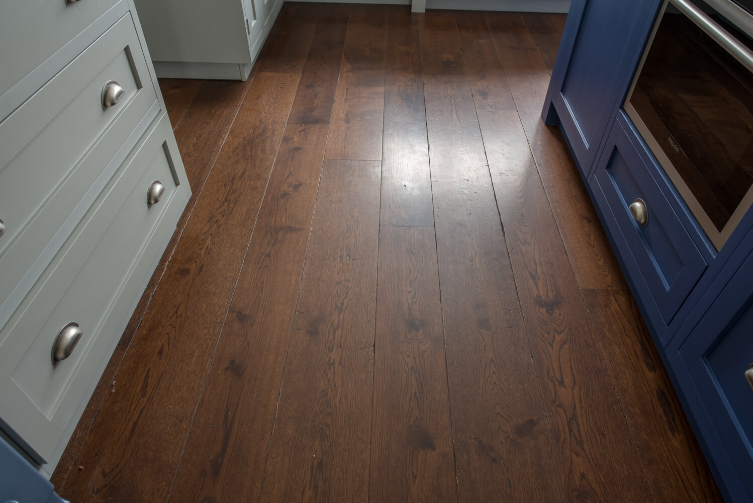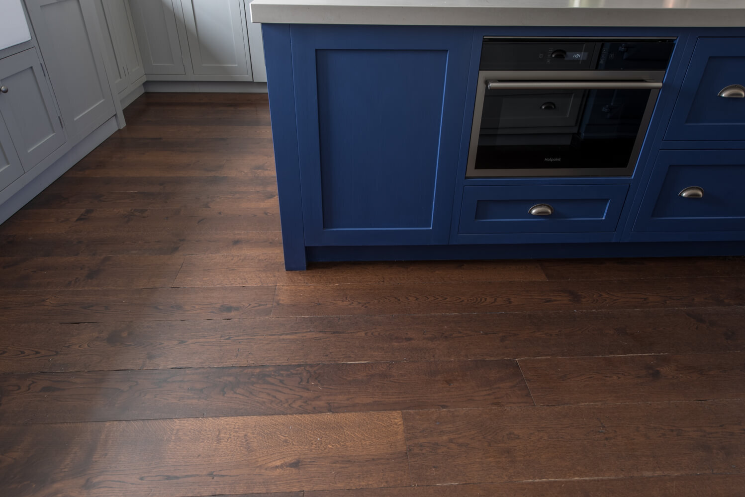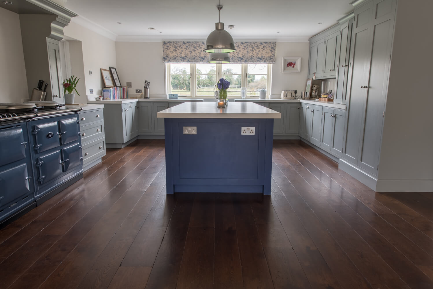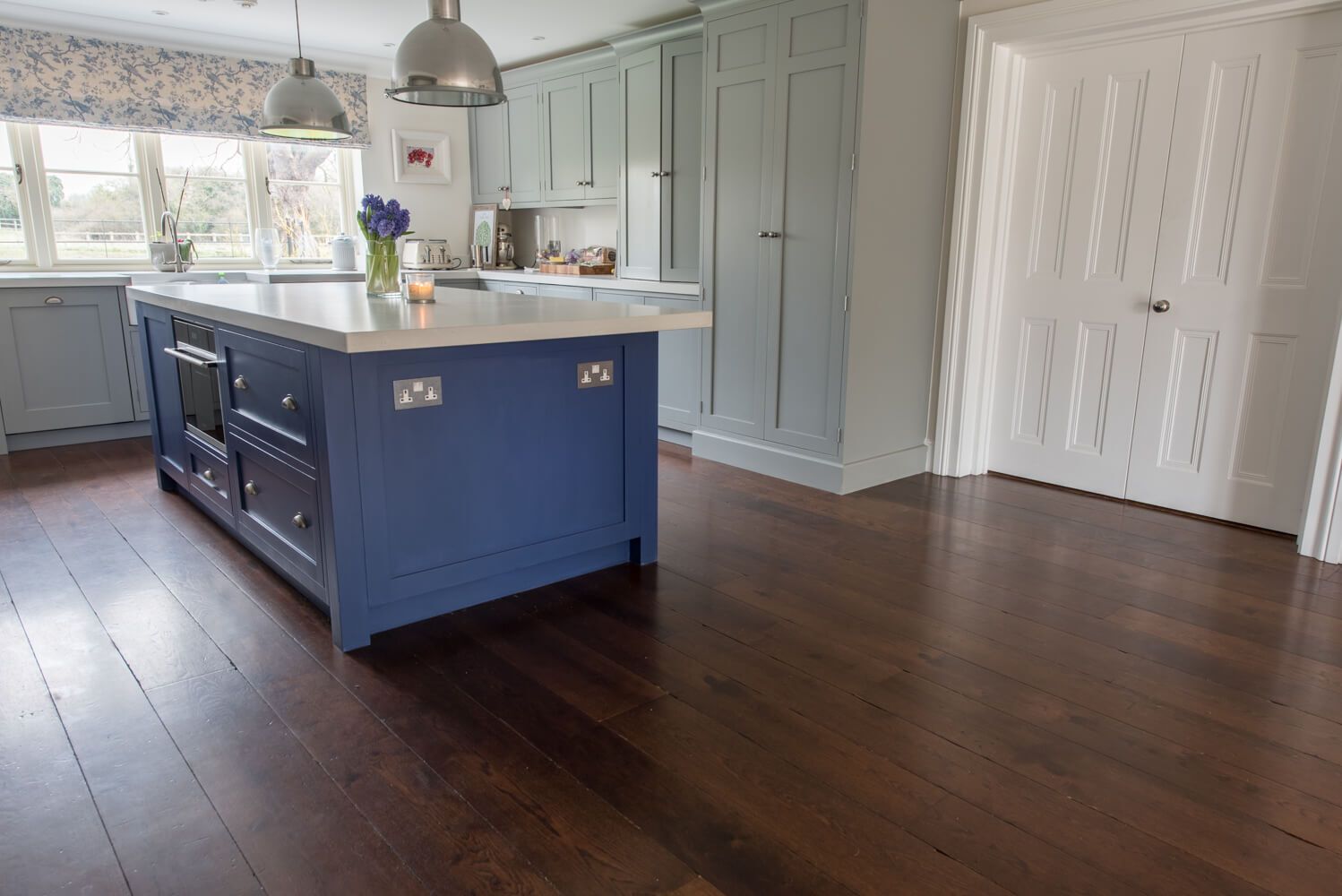 Idyllic Oxfordshire countryside home showcasing beautifully hand distressed planks in 180mm and 220mm wide random mixed widths, bringing character in abundance to this quaint country style Kitchen.